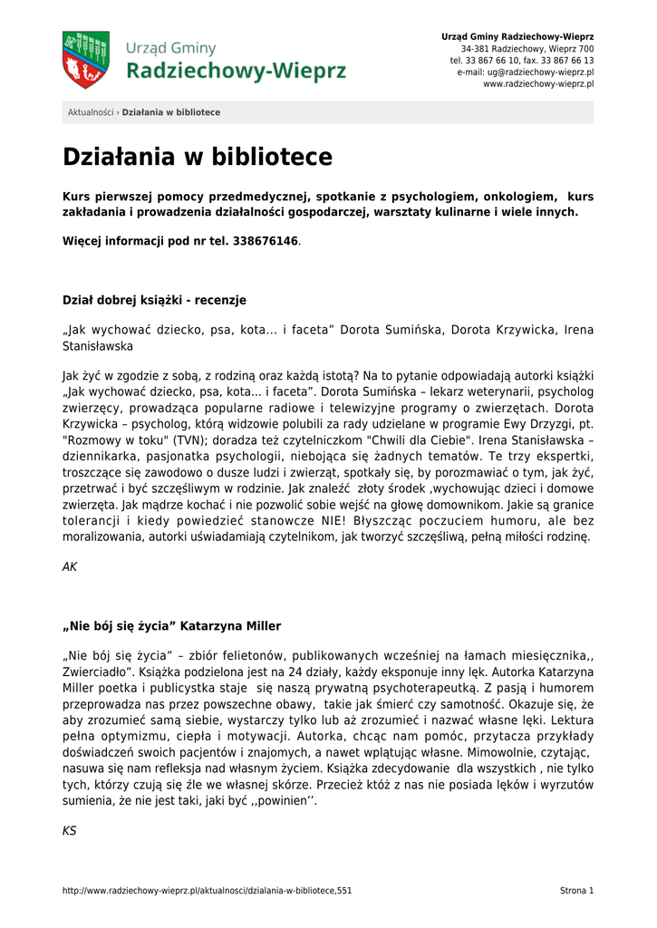 Urząd Gminy Radziechowy-Wieprz 34-381 Radziechowy, Wieprz 700 tel. 33 867 66 10, fax. 33 867 66 13 e-mail: [email protected] www.radziechowy-wieprz.pl Aktualności › Działania w bibliotece Działania w bibliotece Kurs pierwszej pomocy przedmedycznej, spotkanie z psychologiem, onkologiem, kurs zakładania i prowadzenia działalności gospodarczej, warsztaty kulinarne i wiele innych. Więcej informacji pod nr tel. 338676146. Dział dobrej książki - recenzje „Jak wychować dziecko, psa, kota... i faceta” Dorota Sumińska, Dorota Krzywicka, Irena Stanisławska Jak żyć w zgodzie z sobą, z rodziną oraz każdą istotą? Na to pytanie odpowiadają autorki książki „Jak wychować dziecko, psa, kota... i faceta”. Dorota Sumińska – lekarz weterynarii, psycholog zwierzęcy, prowadząca popularne radiowe i telewizyjne programy o zwierzętach. Dorota Krzywicka – psycholog, którą widzowie polubili za rady udzielane w programie Ewy Drzyzgi, pt. "Rozmowy w toku" (TVN); doradza też czytelniczkom "Chwili dla Ciebie". Irena Stanisławska – dziennikarka, pasjonatka psychologii, niebojąca się żadnych tematów. Te trzy ekspertki, troszczące się zawodowo o dusze ludzi i zwierząt, spotkały się, by porozmawiać o tym, jak żyć, przetrwać i być szczęśliwym w rodzinie. Jak znaleźć złoty środek ,wychowując dzieci i domowe zwierzęta. Jak mądrze kochać i nie pozwolić sobie wejść na głowę domownikom. Jakie są granice tolerancji i kiedy powiedzieć stanowcze NIE! Błyszcząc poczuciem humoru, ale bez moralizowania, autorki uświadamiają czytelnikom, jak tworzyć szczęśliwą, pełną miłości rodzinę. AK „Nie bój się życia” Katarzyna Miller „Nie bój się życia” – zbiór felietonów, publikowanych wcześniej na łamach miesięcznika,, Zwierciadło”. Książka podzielona jest na 24 działy, każdy eksponuje inny lęk. Autorka Katarzyna Miller poetka i publicystka staje się naszą prywatną psychoterapeutką. Z pasją i humorem przeprowadza nas przez powszechne obawy, takie jak śmierć czy samotność. Okazuje się, że aby zrozumieć samą siebie, wystarczy tylko lub aż zrozumieć i nazwać własne lęki. Lektura pełna optymizmu, ciepła i motywacji. Autorka, chcąc nam pomóc, przytacza przykłady doświadczeń swoich pacjentów i znajomych, a nawet wplątując własne. Mimowolnie, czytając, nasuwa się nam refleksja nad własnym życiem. Książka zdecydowanie dla wszystkich , nie tylko tych, którzy czują się źle we własnej skórze. Przecież któż z nas nie posiada lęków i wyrzutów sumienia, że nie jest taki, jaki być ,,powinien’’. KS http://www.radziechowy-wieprz.pl/aktualnosci/dzialania-w-bibliotece,551 Strona 1 Urząd Gminy Radziechowy-Wieprz 34-381 Radziechowy, Wieprz 700 tel. 33 867 66 10, fax. 33 867 66 13 e-mail: [email protected] www.radziechowy-wieprz.pl Aktualności › Działania w bibliotece Już 25 września o godzinie 17:00 w bibliotece w Radziechowach zapraszamy na spotkanie z Panią Dorotą Krzywicką. Zapraszamy do pojawienia się z nurtującymi Was pytaniami. Zapytamy ją o wychowanie dzieci i młodzieży – karać, czy nie karać? Czy wychowanie bezstresowe działa?, Rozwiązywanie konfliktów w związku – czy zawsze trzeba ustępować? Czy zawsze warto się kłócić?, Choroby, które lekceważymy - kiedy chandra to już depresja? „Jeśli nie wiesz, o co MU chodzi, nie umiesz powiedzieć swojej matce NIE i wszystko cię denerwuje… „ zapraszamy na spotkanie! Spotkanie organizowane przez grupę nieformalną Misski spod Matyski w ramach projektu „Kopernik tez była kobietą”, dofinansowanego dzięki udziałowi w Działaj Lokalnie VIII. http://www.radziechowy-wieprz.pl/aktualnosci/dzialania-w-bibliotece,551 Strona 2