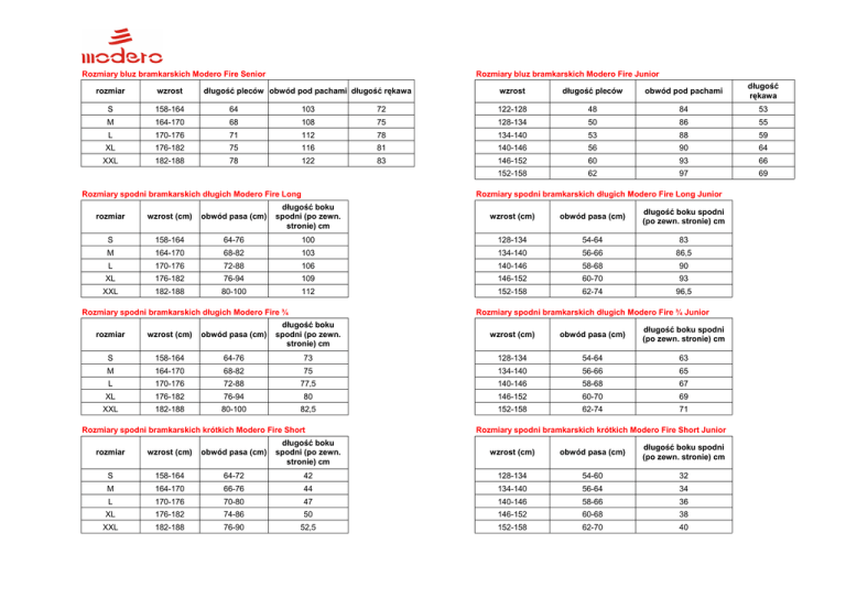 Rozmiary bluz bramkarskich Modero Fire Senior Rozmiary bluz bramkarskich Modero Fire Junior wzrost długość pleców obwód pod pachami długość rękawa 72 122-128 48 84 53 108 75 128-134 50 86 55 112 78 134-140 53 88 59 75 116 81 140-146 56 90 64 78 122 83 146-152 60 93 66 152-158 62 97 69 rozmiar wzrost długość pleców obwód pod pachami długość rękawa S 158-164 64 103 M 164-170 68 L 170-176 71 XL 176-182 XXL 182-188 Rozmiary spodni bramkarskich długich Modero Fire Long Rozmiary spodni bramkarskich długich Modero Fire Long Junior rozmiar wzrost (cm) obwód pasa (cm) długość boku spodni (po zewn. stronie) cm wzrost (cm) obwód pasa (cm) długość boku spodni (po zewn. stronie) cm S 158-164 64-76 100 128-134 54-64 83 M 164-170 68-82 103 134-140 56-66 86,5 L 170-176 72-88 106 140-146 58-68 90 XL 176-182 76-94 109 146-152 60-70 93 XXL 182-188 80-100 112 152-158 62-74 96,5 Rozmiary spodni bramkarskich długich Modero Fire ¾ Rozmiary spodni bramkarskich długich Modero Fire ¾ Junior rozmiar wzrost (cm) obwód pasa (cm) długość boku spodni (po zewn. stronie) cm S 158-164 64-76 73 128-134 54-64 63 M 164-170 68-82 75 134-140 56-66 65 L 170-176 72-88 77,5 140-146 58-68 67 XL 176-182 76-94 80 146-152 60-70 69 XXL 182-188 80-100 82,5 152-158 62-74 71 Rozmiary spodni bramkarskich krótkich Modero Fire Short rozmiar wzrost (cm) obwód pasa (cm) długość boku spodni (po zewn. stronie) cm wzrost (cm) obwód pasa (cm) długość boku spodni (po zewn. stronie) cm Rozmiary spodni bramkarskich krótkich Modero Fire Short Junior wzrost (cm) obwód pasa (cm) długość boku spodni (po zewn. stronie) cm S 158-164 64-72 42 128-134 54-60 32 M 164-170 66-76 44 134-140 56-64 34 L 170-176 70-80 47 140-146 58-66 36 XL 176-182 74-86 50 146-152 60-68 38 XXL 182-188 76-90 52,5 152-158 62-70 40