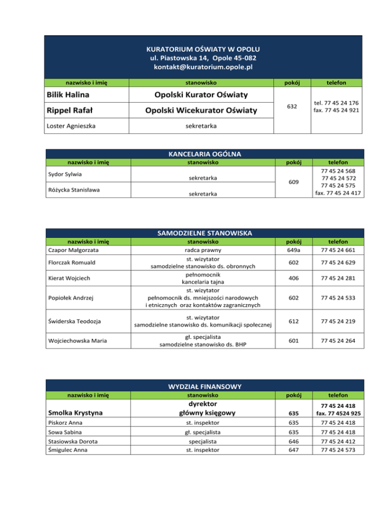 KURATORIUM OŚWIATY W OPOLU ul. Piastowska 14, Opole 45-082 [email protected] nazwisko i imię stanowisko Bilik Halina Opolski Kurator Oświaty Rippel Rafał Opolski Wicekurator Oświaty Loster Agnieszka sekretarka pokój telefon 632 tel. 77 45 24 176 fax. 77 45 24 921 KANCELARIA OGÓLNA nazwisko i imię Sydor Sylwia Różycka Stanisława stanowisko sekretarka pokój 609 sekretarka telefon 77 45 24 568 77 45 24 572 77 45 24 575 fax. 77 45 24 417 SAMODZIELNE STANOWISKA nazwisko i imię Czapor Małgorzata Florczak Romuald Kierat Wojciech Popiołek Andrzej Świderska Teodozja Wojciechowska Maria stanowisko radca prawny st. wizytator samodzielne stanowisko ds. obronnych pełnomocnik kancelaria tajna st. wizytator pełnomocnik ds. mniejszości narodowych i etnicznych oraz kontaktów zagranicznych pokój 649a telefon 77 45 24 661 602 77 45 24 629 406 77 45 24 281 602 77 45 24 533 st. wizytator samodzielne stanowisko ds. komunikacji społecznej 612 77 45 24 219 gł. specjalista samodzielne stanowisko ds. BHP 601 77 45 24 264 pokój telefon 635 77 45 24 418 fax. 77 4524 925 WYDZIAŁ FINANSOWY nazwisko i imię Smolka Krystyna stanowisko dyrektor główny księgowy Piskorz Anna st. inspektor 635 77 45 24 418 Sowa Sabina gł. specjalista 635 77 45 24 418 Stasiowska Dorota Śmigulec Anna specjalista st. inspektor 646 647 77 45 24 412 77 45 24 573 WYDZIAŁ ORGANIZACJI I PRAGMATYKI ZAWODOWEJ NAUCZYCIELI nazwisko i imię Bodziony Irena Pasierbek Anna Sydor Sylwia* stanowisko pokój telefon dyrektor 630 77 45 24 212 zastępca dyrektora, 648 77 45 24 571 609 77 45 24 572 pełnomocnik ds. kontroli zarządczej sekretarka WOPZN/OKM kancelaria ogólna Białas Magdalena st. inspektor 649 77 45 24 567 Bednarska Agata specjalista 600 77 45 24 199 Bonich Magdalena specjalista 649 77 45 24 410 Dąbrowski Zbigniew kierowca 603 77 45 24 414 Globisz Emilia* sekretarka WRE - - Karońska-Maj Dagmara referent prawny 600 77 45 24 577 archiwista 603 77 45 24 118 Loster Agnieszka* sekretarka OKO 632 77 45 24 176 Marchut Tomasz informatyk 608 77 45 24 615 Ordyniec Aneta* sekretarka 606 77 45 24 667 Kuryło Elżbieta* Redas Mirosława st. inspektor 601 tel/fax 77 45 24 264 sekretarka - kancelaria ogólna 609 77 45 24 568 kierowca 603 77 45 24 414 Szałagan Magdalena st. specjalista 600 77 45 24 577 Wojciechowska Maria gł. specjalista 601 tel/fax 77 45 24 264 sekretarka WNP/OEW Mickiewicza 1 77 44 25 977 Różycka Stanisława* Różycki Stanisław* Zimnicka Anna* *Pracownicy poza korpusem służby cywilnej WYDZIAŁ ROZWOJU EDUKACJI nazwisko i imię telefon stanowisko pokój dyrektor 606 77 45 24 667 zastępca dyrektora 606 77 45 24 198 Ordyniec Aneta* sekretarka 606 77 45 24 667 fax. 77 45 24 915 Dańkowski Piotr st. wizytator 647 77 45 24 573 Gwóźdź Robert Iwaniak Janusz Jaśkiewicz Maria wizytator wizytator st. wizytator 611 636 623 77 45 24 570 77 45 24 566 77 45 24 619 Łaba Piotr st. wizytator 636 77 45 24 671 Noga Karolina st. specjalista 627 77 45 24 625 Pilarz Halina Sieradzka Danuta Szymaniak Dobromiła Śmigulec Anna Wąsowski Marek Wnuk Joanna st. wizytator wizytator st. wizytator st. inspektor wizytator wizytator 636a 627 627 647 611 611 77 45 24 526 77 45 24 419 77 45 24 419 77 45 24 573 77 45 24 570 77 45 24 570 Nowak Maria Kostrzewa – Andros Wiesława WYDZIAŁ NADZORU PEDAGOGICZNEGO ul. Mickiewicza 1 nazwisko i imię stanowisko pokój telefon dyrektor 1 Mickiewicza 609 Piastowska 44 25 994 45 24 572 kierownik OEW 1 Mickiewicza 609 Piastowska 44 25 994 45 24 572 sekretarka st. wizytator st. wizytator st. wizytator wizytator st. wizytator st. wizytator st. wizytator st. wizytator st. wizytator st. wizytator st. wizytator st. wizytator st. wizytator st. wizytator st. wizytator st. wizytator st. wizytator wizytator st. wizytator st. wizytator st. wizytator st. wizytator wizytator wizytator st. wizytator 101 3 109 622 Piastowska 9 119 116 102 2 622 Piastowska 9 110 103 4 119 4 102 10 103 622a Piastowska 109 10 11 104 110 102 tel./fax. 44 25 977 44 25 970 44 25 972 45 24 409 44 25 984 44 25 993 44 25 985 44 25 999 44 25 975 45 24 409 44 25 984 44 25 987 44 25 979 44 25 986 44 25 993 44 25 986 44 25 999 44 25 980 44 25 979 45 24 578 44 25 972 44 25 980 44 25 973 44 25 998 44 25 987 44 25 999 kierownik OKM 609 Piastowska 45 24 572 Sydor Sylwia Czapka Piotr Dziubandowska Regina Grzelińska Magdalena sekretarka wizytator st. wizytator wizytator 609 Piastowska 605 Piastowska 637 Piastowska 614 Piastowska 45 24 572 45 24 416 45 24 420 45 24 421 Jędrusik Stanisław Juszczak Ewa Łukaszczyk Jacek Misiaszek-Gruca Gabriela Nowacka Halina Słodziński Tomasz Szramiak Jadwiga st. wizytator st. wizytator wizytator st. wizytator st. wizytator st. wizytator st. wizytator 103 605 Piastowska 637 Piastowska 614 Piastowska 614 Piastowska 605 Piastowska 622 Piastowska 44 25 979 45 24 206 45 24 420 45 24 421 45 24 421 45 24 416 45 24 578 Czollek Krystyna Duda Henryk Anna Zimnicka Besz Bożena Biegalska-Bożek Beata Dedyk Piotr Dybka Małgorzata Jaworek Jolanta Kania Aldona Kobaka Gabriela Kowalik Małgorzata Kraus Joanna Matys Olimpia Mueller Mariusz Olechnowicz Janusz Pawlicka Monika Pietruszka Bernadetta Polewska Iwona Prokop Małgorzata Sokołowska Grażyna Szostak Jacek Szymczak Ewa Śmietanka Beata Tarka Anna Usarz Barbara Wachnicka Anna Wieczorek Dorota Ziobrowska Aniela Sochacka Zofia