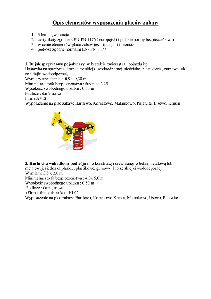 Opis elementów wyposażenia placów zabaw 1. 2. 3. 4. 3 letnia gwarancja certyfikaty zgodne z EN-PN 1176 ( europejski i polskie normy bezpieczeństwa) w cenie elementów placu zabaw jest transport i montaż podłoże zgodne normami EN- PN 1177 1. Bujak sprężynowy pojedynczy: w kształcie zwierzątka , pojazdu itp Huśtawka na sprężynie, korpus ze sklejki wodoodpornej, siedzisko, plastikowe , gumowe lub ze sklejki wodoodpornej, Wymiary urządzenia : 0,9 x 0,30 m Minimalna strefa bezpieczeństwa : średnica 2,25 Wysokość swobodnego upadku : 0,50 m Podłoże : darń, trawa Firma AVIS Wyposażenie na plac zabaw: Bartlewo, Kornatowo, Malankowo, Pniewite, Lisewo, Krusin 2. Huśtawka wahadłowa podwójna : o konstrukcji drewnianej z belką metalową lub metalowej, siedziska płaskie, plastikowe, gumowe lub ze sklejki wodoodpornej. Wymiary: 3,8 x 2,0 m Minimalna strefa bezpieczeństwa ; 4,0x 6,0 m Wysokość swobodnego upadku : 0,50 m Podłoże : darń., trawa (Firma free kids nr kat. HL02 Wyposażenie na plac zabaw: Bartlewo, Kornatowo Krusin, Malankowo,Lisewo, Pniewite. 3. Huśtawka wagowa: drewniana lub metalowa , siedzisko plastikowe lub ze sklejki wodoodpornej, z odbojnikiem gumowym lub amortyzatory gumowe wkopane w ziemi Wymiary: 3,1 x 0,5 m Minimalna strefa bezpieczeństwa ; 5,1 x 2,5 m Wysokość swobodnego upadku : 0,50 m Podłoże : darń, trawa (Firma free kids nr HWG-01) Wyposażenie na plac zabaw: Bartlewo, Kornatowo, Malankowo, Pniewite. 4. Zestaw zabawowy: Wieża z dachem dwuspadowym z wejściem na pomost , zjeżdżalnia ze stali nierdzewnej , huśtawka wahadłowa pojedyncza z drabinką krzyżakową ( możliwy wariant zamiany huśtawki na przeplotnię drewnianą lub przeplotnię ze słupkiem, lub ściankę gimnastyczną ) Minimalna strefa bezpieczeństwa ; 9,6 x 9,5 m Wysokość swobodnego upadku : 1,99 m Podłoże min. strefy bezpieczeństwa : piasek lub żwir na głębokość min 20 cm ( firma AVIS zestaw nr 10) Wyposażenie na plac zabaw: Bartlewo, Kornatowo Krusin, Malankowo, Pniewite. 5 . Ławka drewniana lub na kątownikach stała bez oparcia Wymiary dł 1,5 m, szer. 0,40 m , wys. O,45 m. ( Firma AVIS) Wyposażenie na plac zabaw: Bartlewo, Kornatowo, Krusin, Malankowo, Pniewite. 6. ŁAWO- STÓŁ – drewniany Wymiary : dł. 1,70 m., szer. 1,80 m, wys. 0,80 m ( Firma AVIS) Wyposażenie na plac zabaw: Bartlewo, Kornatowo Krusin, Malankowo,Lisewo, Pniewite. 7. Kosz na śmieci : drewniany lub metalowy , średnica min 0,30 m, pojemność wiadra 30 l wysokość 0,75 m (Firma free kids nr KKS-S1) Wyposażenie na plac zabaw: Bartlewo, Kornatowo Krusin, Malankowo,Lisewo, Pniewite. 8. Zestaw sprawnościowy ze zjeżdżalnią : składający się z elementów : drabinka krzyżakowa( skośna) przeplotnia drewniana, drabinka pozioma, przeplotnia łańcuchowa ze słupkiem oraz zjeżdżalnia ze stali nierdzewnej z wejściem z drabinki . Wymiary : dł. 6,00 m., szer. 4,00 m, wys. 2,20 m Minimalna strefa bezpieczeństwa ; 10,0 x 8,0 m Wysokość swobodnego upadku : 2,185 m Podłoże min. strefy bezpieczeństwa : piasek lub żwir na głębokość min 30 cm (Firma AVIS zestaw nr 8) Wyposażenie na plac zabaw: Lisewo. 9.Karuzela tarczowa : czteroramienna wymiary urządzenia średnica 1,50m, minimalna strefa bezpieczeństwa średnica 5,50 Podest z blachy aluminiowej ryflowanej lub ze sklejki antypoślizgowej wodoodpornej. Ramię metalowe lub drewniane. Wysokość swobodnego upadku : 0,50 m (Firma free kids nr KD-02) Wyposażenie na plac zabaw: Krusin, Pniewite, Kornatowo, Bartlewo