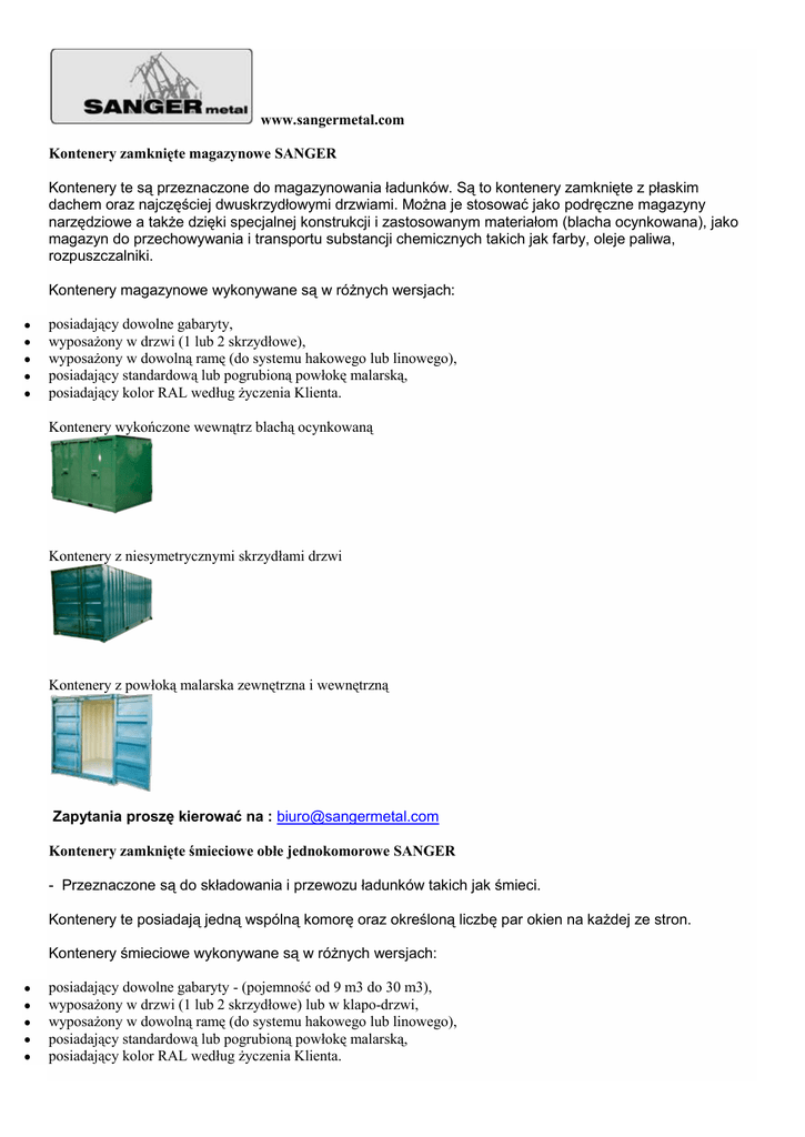 www.sangermetal.com Kontenery zamknięte magazynowe SANGER Kontenery te są przeznaczone do magazynowania ładunków. Są to kontenery zamknięte z płaskim dachem oraz najczęściej dwuskrzydłowymi drzwiami. Można je stosować jako podręczne magazyny narzędziowe a także dzięki specjalnej konstrukcji i zastosowanym materiałom (blacha ocynkowana), jako magazyn do przechowywania i transportu substancji chemicznych takich jak farby, oleje paliwa, rozpuszczalniki. Kontenery magazynowe wykonywane są w różnych wersjach: posiadający dowolne gabaryty, wyposażony w drzwi (1 lub 2 skrzydłowe), wyposażony w dowolną ramę (do systemu hakowego lub linowego), posiadający standardową lub pogrubioną powłokę malarską, posiadający kolor RAL według życzenia Klienta. Kontenery wykończone wewnątrz blachą ocynkowaną Kontenery z niesymetrycznymi skrzydłami drzwi Kontenery z powłoką malarska zewnętrzna i wewnętrzną Zapytania proszę kierować na : [email protected] Kontenery zamknięte śmieciowe obłe jednokomorowe SANGER - Przeznaczone są do składowania i przewozu ładunków takich jak śmieci. Kontenery te posiadają jedną wspólną komorę oraz określoną liczbę par okien na każdej ze stron. Kontenery śmieciowe wykonywane są w różnych wersjach: posiadający dowolne gabaryty - (pojemność od 9 m3 do 30 m3), wyposażony w drzwi (1 lub 2 skrzydłowe) lub w klapo-drzwi, wyposażony w dowolną ramę (do systemu hakowego lub linowego), posiadający standardową lub pogrubioną powłokę malarską, posiadający kolor RAL według życzenia Klienta. www.sangermetal.com Kontenery zamknięte jednokomorowe z 6-otworami wrzutowymi Typu SANGER PT-11 Wykonane w systemie hakowym lub linowym Przeznaczony na odpady budowlane, odpady drewniane, oraz do selektywnej zbiórki śmieci (odpadów) Pojemność od 9m3 do 30 m3 Wymiary: Długość od 4000mm do 6000mm Szerokość od 1720mm do 2350mm Wysokość od 1340mm do 2300mm Wielkość otworów wrzutowych od 1,23 x 0,66 w zależności od wymiarów kontenera Masa własna od 1100kg do 2300kg Materiał konstrukcyjny: podłoga: blacha 3mm, 4mm lub 5mm, ściany i dach: blacha 3mm Zabezpieczenie antykorozyjne oraz grubość powłoki: farba antykorozyjna podkładowa (40µm) oraz nawierzchniowa (40µm lub 80µm) Drzwiczki z tworzywa sztucznego www.sangermetal.com Kontenery zamknięte jednokomorowe z 4-otworami wrzutowymi Typu SANGER PT-26 Wykonane w systemie hakowym i linowym Przeznaczony na odpady budowlane, odpady drewniane, oraz do selektywnej zbiórki śmieci (odpadów) Pojemność od 9m3 do 30 m3 Wymiary: Długość od 4000mm do 6000mm Szerokość od 1720mm do 2350mm Wysokość od 1340mm do 2300mm Wielkość otworów wrzutowych od 1,23 x 0,66 w zależności od wymiarów kontenera Masa własna od 1100kg do 2300kg Materiał konstrukcyjny: podłoga blacha: 3mm, 4mm lub 5mm, ściany i dach blacha: 3mm zabezpieczenie antykorozyjne oraz grubość powłoki: farba antykorozyjna podkładowa (40µm) oraz nawierzchniowa (40µm lub 80µm) drzwiczki z tworzywa sztucznego www.sangermetal.com Kontenery zamknięte SANGER do selektywnej zbiórki odpadów Zbiornik główny kontenera podzielony na 3 komory przeznaczony jest do selektywnej zbiórki odpadów takich jak: szkło plastik papier Każda z komór posiada po 2 pokrywy wyposażone w siłowniki hydrauliczne, które zabezpieczają je przed samoczynnym opadaniem. Ponadto pokrywy kontenera po jego napełnieniu zabezpieczone są centralną blokadą. Kontener posiada otwierane drzwi tylne oraz wbudowane wewnątrz 2 klapy, które wyposażone są w centralne zabezpieczenie. Kontener zamknięty, wielokomorowy typu SANGER PT-12 zamknięty - przeznaczony na odpady budowlane, odpady drewniane oraz do selektywnej zbiórki śmieci (odpadów) Pojemność od 9m3 do 30 m3 Wymiary: Długość od 4000mm do 6000mm Szerokość od 1720mm do 2350mm Wysokość od 1340mm do 2300mm Wielkość otworów wrzutowych od 1,23 x 0,66 w zależności od wymiarów kontenera Masa własna od 1100kg do 2300kg Materiał konstrukcyjny: podłoga blacha: 3mm, 4mm lub 5mm, ściany i dach blacha: 3mm zabezpieczenie antykorozyjne oraz grubość powłoki: farba antykorozyjna podkładowa (40µm) oraz nawierzchniowa (40µm lub 80µm)