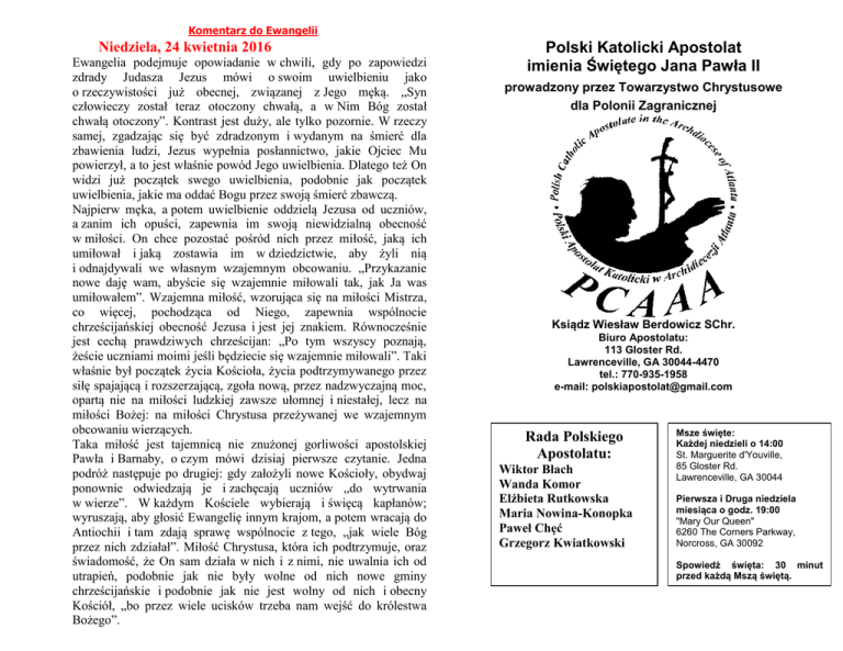 Komentarz do Ewangelii Niedziela, 24 kwietnia 2016 Ewangelia podejmuje opowiadanie w chwili, gdy po zapowiedzi zdrady Judasza Jezus mówi o swoim uwielbieniu jako o rzeczywistości już obecnej, związanej z Jego męką. „Syn człowieczy został teraz otoczony chwałą, a w Nim Bóg został chwałą otoczony”. Kontrast jest duży, ale tylko pozornie. W rzeczy samej, zgadzając się być zdradzonym i wydanym na śmierć dla zbawienia ludzi, Jezus wypełnia posłannictwo, jakie Ojciec Mu powierzył, a to jest właśnie powód Jego uwielbienia. Dlatego też On widzi już początek swego uwielbienia, podobnie jak początek uwielbienia, jakie ma oddać Bogu przez swoją śmierć zbawczą. Najpierw męka, a potem uwielbienie oddzielą Jezusa od uczniów, a zanim ich opuści, zapewnia im swoją niewidzialną obecność w miłości. On chce pozostać pośród nich przez miłość, jaką ich umiłował i jaką zostawia im w dziedzictwie, aby żyli nią i odnajdywali we własnym wzajemnym obcowaniu. „Przykazanie nowe daję wam, abyście się wzajemnie miłowali tak, jak Ja was umiłowałem”. Wzajemna miłość, wzorująca się na miłości Mistrza, co więcej, pochodząca od Niego, zapewnia wspólnocie chrześcijańskiej obecność Jezusa i jest jej znakiem. Równocześnie jest cechą prawdziwych chrześcijan: „Po tym wszyscy poznają, żeście uczniami moimi jeśli będziecie się wzajemnie miłowali”. Taki właśnie był początek życia Kościoła, życia podtrzymywanego przez siłę spajającą i rozszerzającą, zgoła nową, przez nadzwyczajną moc, opartą nie na miłości ludzkiej zawsze ułomnej i niestałej, lecz na miłości Bożej: na miłości Chrystusa przeżywanej we wzajemnym obcowaniu wierzących. Taka miłość jest tajemnicą nie znużonej gorliwości apostolskiej Pawła i Barnaby, o czym mówi dzisiaj pierwsze czytanie. Jedna podróż następuje po drugiej: gdy założyli nowe Kościoły, obydwaj ponownie odwiedzają je i zachęcają uczniów „do wytrwania w wierze”. W każdym Kościele wybierają i święcą kapłanów; wyruszają, aby głosić Ewangelię innym krajom, a potem wracają do Antiochii i tam zdają sprawę wspólnocie z tego, „jak wiele Bóg przez nich zdziałał”. Miłość Chrystusa, która ich podtrzymuje, oraz świadomość, że On sam działa w nich i z nimi, nie uwalnia ich od utrapień, podobnie jak nie były wolne od nich nowe gminy chrześcijańskie i podobnie jak nie jest wolny od nich i obecny Kościół, „bo przez wiele ucisków trzeba nam wejść do królestwa Bożego”. Polski Katolicki Apostolat imienia Świętego Jana Pawła II prowadzony przez Towarzystwo Chrystusowe dla Polonii Zagranicznej Ksiądz Wiesław Berdowicz SChr. Biuro Apostolatu: 113 Gloster Rd. Lawrenceville, GA 30044-4470 tel.: 770-935-1958 e-mail: [email protected] Rada Polskiego Apostolatu: Wiktor Błach Wanda Komor Elżbieta Rutkowska Maria Nowina-Konopka Paweł Chęć Grzegorz Kwiatkowski Msze święte: Każdej niedzieli o 14:00 St. Marguerite d'Youville, 85 Gloster Rd. Lawrenceville, GA 30044 Pierwsza i Druga niedziela miesiąca o godz. 19:00 "Mary Our Queen" 6260 The Corners Parkway, Norcross, GA 30092 Spowiedź święta: 30 minut przed każdą Mszą świętą. Krótkie sprawozdanie z zebrania Rady 17.04.2016 Biuletyn: 24 kwietnia 2016 5 NIEDZIELA WIELKANOCNA Będę Cię sławił, Boże mój i Królu. ****************************************************************************************************************** Intencje Mszalne Niedziela, 24 kwietnia 2016 Md'Y - 2:00pm – +Józef Żochowski (rocz.) Dziękcz. i o Boże błog. dla Ireny i Stanisława Janewiczów z ok. 33. rocz. ślubu. O pełny powrót do zdrowia dla Sylwii Gołębiewskiej Niedziela, 1 maja 2016 Md'Y - 2:00pm – O Boże błogosławieństwo dla dzieci z okazji przyjęcia I komunii św. Wtorek, 3 maja 2016 Md'Y - 7:30pm – + Zofia Wróblewska (rocz.) Służba liturgiczna OGŁOSZENIA 10 kwietnia 2016 2:00pm St. Marguerite I czytanie Kazimierz Krajewski II czytanie Anna Standish Szafarze Adam Śniady, Anna Górczyńska MAJÓWKA Polski Apostolat w Atlancie serdecznie zaprasza na doroczną Majówkę, która odbędzie się w Bethesda Park w Lawrenceville 21 maja o godz. 13:00. Za tydzień do I komunii św. Przystąpią po raz pierwszy: Zacharia Dorhmi Natalia Hadula Oliver Krauz Bianca Lipski Olivier Piątek Sara Piekarz Adrian Sobanski Aimee Szczechura Joseph Telford Natalia Telford Matthew Wójcik REJS:Wracamy do tradycji rejsów Apostolatu. W tym roku zapraszamy na rejs do Half Moon Cay, Bahamas 20 – 25 października 2016. 1- Ela Rutkowska przedstawiła ostatnie sprawy związane z zakończeniem roku szkolnego. Bogdan Kołodyński zaproponował, że wydrukuje świadectwa. 2 - Ksiądz będzie umieszczał w biuletynie sumę zebranej tacy w kościele i dochód ze sprzedaży ciasta. 3 - 21 maja odbędzie się Majówka w Bethesda Park w Lawrenceville w godzinach 1:00 - 6:00 PM. Więcej informacji podamy, gdy będą dostępne. 4 - Komisja Finansowa planuje spotkanie z Księdzem w najbliższym czasie, termin jeszcze nie ustalony. 5 - Ksiądz sprawdził skilet z nowego ogłoszenia (połowa ceny) i zakupi po sprawdzeniu z elektrykiem, jeśli okaże się że działa poprawnie. 6 - Przedyskutowano sprawę otrzymywania gazet "Białego Orła". 7 - Ksiądz wypłacił Annie Oberc pieniądze z drugiej składki i sprzedaży ciasta w wysokości $527.00 na pokrycie kosztów związanych ze sprowadzeniem reżysera i wyświetlaniem filmu. Anna Oberc zobowiązała się przekazać rozliczenie do Bogdana Kołodyńskiego. 8 - 18 czewca planowane jest Ognisko Świetojańskie organizowane wspólnie przez Polski Klub i Apostolat, 9 - Bogdan Kołodyński jak co roku organizuje Rejs tym razem na wyspy Bahama w końcu pażdziernika. Informacje są dostępne na naszej stronie internetowej i bezpośrednio u Bogdana. 10 - Anna Standish zgodziła się pełnić funkcję głównego Koordynatora tegorocznego Festiwalu Pierog