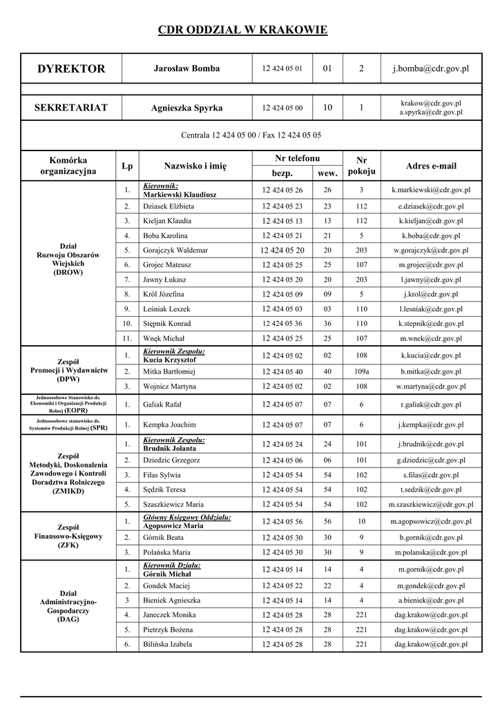 CDR ODDZIAŁ W KRAKOWIE DYREKTOR Jarosław Bomba 12 424 05 01 01 2 [email protected] SEKRETARIAT Agnieszka Spyrka 12 424 05 00 10 1 [email protected] [email protected] bezp. wew. Nr pokoju Adres e-mail Centrala 12 424 05 00 / Fax 12 424 05 05 Komórka organizacyjna Dział Rozwoju Obszarów Wiejskich (DROW) Zespół Promocji i Wydawnictw (DPW) Lp Nazwisko i imię Nr telefonu 1. Kierownik: Markiewski Klaudiusz 12 424 05 26 26 3 [email protected] 2. Dziasek ElŜbieta 12 424 05 23 23 112 [email protected] 3. Kieljan Klaudia 12 424 05 13 13 112 [email protected] 4. Boba Karolina 12 424 05 21 21 5 [email protected] 5. Gorajczyk Waldemar 12 424 05 20 20 203 [email protected] 6. Grojec Mateusz 12 424 05 25 25 107 [email protected] 7. Jawny Łukasz 12 424 05 20 20 203 [email protected] 8. Król Józefina 12 424 05 09 09 5 [email protected] 9. Leśniak Leszek 12 424 05 03 03 110 [email protected] 10. Stępnik Konrad 12 424 05 36 36 110 [email protected] 11. Wnęk Michał 12 424 05 25 25 107 [email protected] 1. Kierownik Zespołu: Kucia Krzysztof 12 424 05 02 02 108 [email protected] 2. Mitka Bartłomiej 12 424 05 40 40 109a [email protected] 3. Wojnicz Martyna 12 424 05 02 02 108 [email protected] Jednoosobowe Stanowisko ds. Ekonomiki i Organizacji Produkcji Rolnej (EOPR) 1. Galiak Rafał 12 424 05 07 07 6 [email protected] Jednoosobowe stanowisko ds. Systemów Produkcji Rolnej (SPR) 1. Kempka Joachim 12 424 05 07 07 6 [email protected] 1. Kierownik Zespołu: Brudnik Jolanta 12 424 05 24 24 101 [email protected] 2. Dziedzic Grzegorz 12 424 05 06 06 101 [email protected] 3. Filas Sylwia 12 424 05 54 54 102 [email protected] 4. Sędzik Teresa 12 424 05 54 54 102 [email protected] 5. Szaszkiewicz Maria 12 424 05 54 54 102 [email protected] 1. Główny Księgowy Oddziału: Agopsowicz Maria 12 424 05 56 56 10 [email protected] 2. Górnik Beata 12 424 05 30 30 9 [email protected] 3. Polańska Maria 12 424 05 30 30 9 [email protected] 1. Kierownik Działu: Górnik Michał 12 424 05 14 14 4 [email protected] 2. Gondek Maciej 12 424 05 22 22 4 [email protected] 3 Bieniek Agnieszka 12 424 05 14 14 4 [email protected] 4. Janeczek Monika 12 424 05 28 28 221 [email protected] 5. Pietrzyk BoŜena 12 424 05 28 28 221 [email protected] 6. Bilińska Izabela 12 424 05 28 28 221 [email protected] Zespół Metodyki, Doskonalenia Zawodowego i Kontroli Doradztwa Rolniczego (ZMIKD) Zespół Finansowo-Księgowy (ZFK) Dział AdministracyjnoGospodarczy (DAG) Lp Zespół Kadr i Organizacji Pracy (ZKOP) Jednoosobowe stanowisko ds. Zastosowań Teleinformatyki – Administrator Systemu Teleinformatycznego Nazwisko i imię Nr telefonu bezp. wew. Nr pokoju Adres e-mail 7. Gruchała Grzegorz 12 424 05 55 55 Recepcja [email protected] 8. Nowak Józef 12 424 05 55 55 Recepcja [email protected] 9. Stec Erazm 12 424 05 55 55 Recepcja [email protected] 10. Pietrzyk Waldemar 12 424 05 55 55 Recepcja [email protected] 11. Kmita Robert 12 424 05 27 27 06 [email protected] 1. p.o. Kierownik Zespołu: Reczek Łucja 12 424 05 04 04 8 [email protected] 2. Spyrka Agnieszka 12 424 05 10 10 1 [email protected] 3. Reczek Edyta 12 424 05 15 15 8 [email protected] 1. Obrzut Łukasz 12 424 05 18 18 109a [email protected] Stan na dzień: 08.02.2017 r.