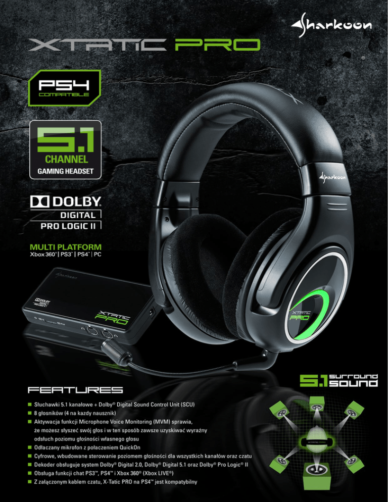 CHANNEL GAMING HEADSET Słuchawki 5.1 kanałowe + Dolby® Digital Sound Control Unit (SCU) 8 głosników (4 na kazdy nausznik) Aktywacja funkcji Microphone Voice Monitoring (MVM) sprawia, że możesz słyszeć swój głos i w ten sposób zawsze uzyskiwać wyraźny odsłuch poziomu głośności własnego głosu Odłaczany mikrofon z połaczeniem QuickOn Cyfrowe, wbudowane sterowanie poziomem głośności dla wszystkich kanałów oraz czatu Dekoder obsługuje system Dolby® Digital 2.0, Dolby® Digital 5.1 oraz Dolby® Pro Logic® II Obsługa funkcji chat PS3™, PS4™ i Xbox 360® (Xbox LIVE®) Z załączonym kablem czatu, X-Tatic PRO na PS4™ jest kompatybilny 1 − Sound Control Unit (obsługuje system Dolby® Digital 2.0, Dolby® Digital 5.1 oraz Dolby® Pro Logic® II) 2 − Cyfrowe, wbudowane sterowanie poziomem głośności dla wszystkich kanałów oraz czatu 3 − 8 głosników (4 na kazdy nausznik) 4 − Odłaczany mikrofon z połaczeniem QuickOn Zawartosc opakowania: Słuchawki X-Tatic PRO 5.1 Rozłączka z wbudowanym regulatorem (złącze G9 > złącze G9) Odłączalny mikrofon z połączeniem typu QuickOn Jednostka SCU X-Tatic z dekoderem Dolby® Digital Zasilacz zawiera adapter podrózny (Wlk. Brytania, Stany Zjednoczone oraz kraje Unii Europejskiej) Kabel mikrofonu USB dla PS3™ i komputera PC Przewód do prowadzenia czatu na konsoli Xbox 360® (gniazdo 3,5 mm > gniazdo 2,5 mm) Kabel połaczenia optycznego (S/PDIF) Połączeniowy przewód koncentryczny Połączeniowy przewód analogowy 3,5 mm Kabel czat do podłączenia do kontrolera DUALSHOCK® 4 Playstation® 4 (wtyk 3,5 mm> 3,5 mm wtyczka) Podrecznik Wszystkie opatrzone nazwą produkty i opisy są chronionymi znakami towarowymi i/lub zastrzeżonymi znakami towarowymi odpowiednich producentów. EAN Code