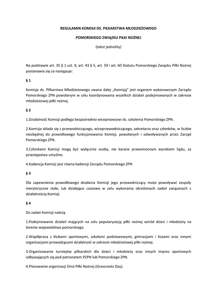 REGULAMIN KOMISJI DS. PIŁKARSTWA MŁODZIEŻOWEGO POMORSKIEGO ZWIĄZKU PIŁKI NOŻNEJ (tekst jednolity) Na podstawie art. 35 § 1 ust. 9, art. 43 § 5, art. 59 i art. 60 Statutu Pomorskiego Związku Piłki Nożnej postanawia się co następuje: §1 Komisja ds. Piłkarstwa Młodzieżowego zwana dalej „Komisją” jest organem wykonawczym Zarządu Pomorskiego ZPN powołanym w celu koordynowania wszelkich działań podejmowanych w zakresie młodzieżowej piłki nożnej. §2 1.Działalność Komisji podlega bezpośrednio wiceprezesowi ds. szkolenia Pomorskiego ZPN. 2.Komisja składa się z przewodniczącego, wiceprzewodniczącego, sekretarza oraz członków, w liczbie niezbędnej do prawidłowego funkcjonowania Komisji, powołanych i odwoływanych przez Zarząd Pomorskiego ZPN. 3.Członkami Komisji mogą być wyłącznie osoby, nie karane prawomocnym wyrokiem Sądu, za przestępstwa umyślne. 4.Kadencja Komisji jest równa kadencji Zarządu Pomorskiego ZPN §3 Dla zapewnienia prawidłowego działania Komisji jego przewodniczący może powoływać zespoły merytoryczne stałe, lub działające czasowo w celu wykonania określonych zadań związanych z działalnością Komisji. §4 Do zadań Komisji należą: 1.Podejmowanie działań mających na celu popularyzację piłki nożnej wśród dzieci i młodzieży na terenie województwa pomorskiego. 2.Współpraca z klubami sportowymi, szkołami podstawowymi, gimnazjami i liceami oraz innymi organizacjami prowadzącymi działalność w zakresie młodzieżowej piłki nożnej. 3.Organizowanie turniejów piłkarskich dla dzieci i młodzieży oraz innych imprez sportowych odbywających się pod patronatem PZPN lub Pomorskiego ZPN. 4.Planowanie organizacji Dnia Piłki Nożnej (Grassroots Day). 5.Współpraca z Komisją ds. Rozgrywek w zakresie organizacji i prowadzenia rozgrywek turniejowych w kategorii junior E i F. 6.Współpraca z organizacjami samorządowymi oraz innymi organizacjami podczas organizowanych przez nich imprez piłkarskich dla dzieci i młodzieży, których celem jest popularyzacja piłki nożnej. 7.Opracowywanie wspólnie z innymi organami Związku systemu rozgrywek w zakresie piłki młodzieżowej. 8.Dokonywanie oceny poziomu piłki młodzieżowej na terenie województwa pomorskiego. 9.Współpraca z innymi organami Pomorskiego ZPN, a w szczególności Komisją Szkolenia i prowadzonym przez Związek Ośrodkiem Szkolenia Sportowego Młodzieży. 10.Współpraca z Komisją Szkolenia w zakresie usystematyzowania procesów szkolenia dzieci i młodzieży, szkolenia i doszkalania kadry trenerskiej i instruktorów ze szczególnym uwzględnieniem pracującej z dziećmi i młodzieżą. 11.Udzielanie pomocy szkoleniowej klubom sportowym oraz szkołom prowadzącym klasy sportowe o profilu piłki nożnej. 12.Opracowywanie i rozpowszechnianie materiałów szkoleniowych i informacyjnych dotyczących piłki młodzieżowej. 13.Wydawanie komunikatów dotyczących piłki młodzieżowej i związanych z pracą Komisji. 14.Współpraca merytoryczna z Komisją Grantową poprzez opiniowanie wniosków o dotacje na turnieje i inne akcje upowszechniające piłkę nożną wśród dzieci i młodzieży oraz ocenę wykorzystania środków przez beneficjentów. 15.Prowadzenie działań związanych z piłką nożną kobiet na terenie województwa pomorskiego. §5 1.Posiedzenia Komisji odbywają się w zależności od potrzeby nie rzadziej niż raz na trzy miesiące. 2.Pracami Komisji kieruje przewodniczący, a w razie jego nieobecności wiceprzewodniczący, sekretarz lub inny członek Komisji wyznaczony przez przewodniczącego. 3.Uchwały lub decyzje podejmowane przez Komisję zapadają zwykłą większością głosów przy obecności na posiedzeniu co najmniej połowy członków Komisji. 4.Przy równej ilości głosów decyduje głos przewodniczącego posiedzenia. 5.Podczas prac Komisji obowiązuje głosowanie jawne. W sprawach osobowych na wniosek dowolnego członka Komisji, przewodniczący ma obowiązek zarządzić głosowanie tajne. 6.Postanowienia i decyzje zainteresowanym stronom przekazywane są w formie pisemnej, a podpisane przez przewodniczącego Komisji lub upoważnionego członka Komisji oraz dyrektora Biura Związku. 7.Organizację pracy Komisji, zakres obowiązków jej członków oraz zespołów powołanych do realizacji określonych zadań ustala przewodniczący Komisji. §6 1.Posiedzenia Komisji są protokołowane. 2.Protokół sporządza sekretarz Komisji lub inny członek, a podpisują przewodniczący posiedzenia i sporządzający protokół. 3.Obsługę techniczno-organizacyjną Komisji zapewnia Biuro Związku. 4.Koszty działalności Komisji pokrywane są z budżetu Pomorskiego ZPN. §7 W posiedzeniu Komisji mają prawo uczestniczyć członkowie władz Związku, dyrektor Biura lub inne zaproszone osoby z głosem doradczym. §8 Prawo interpretacji niniejszego Regulaminu przysługuje Zarządowi Pomorskiego ZPN. §9 Niniejszy Regulamin zatwierdzony został przez Zarząd Pomorskiego ZPN w dniu 15.12.2014r. i obowiązuje od dnia zatwierdzenia. Prezes Pomorskiego ZPN Radosław Michalski