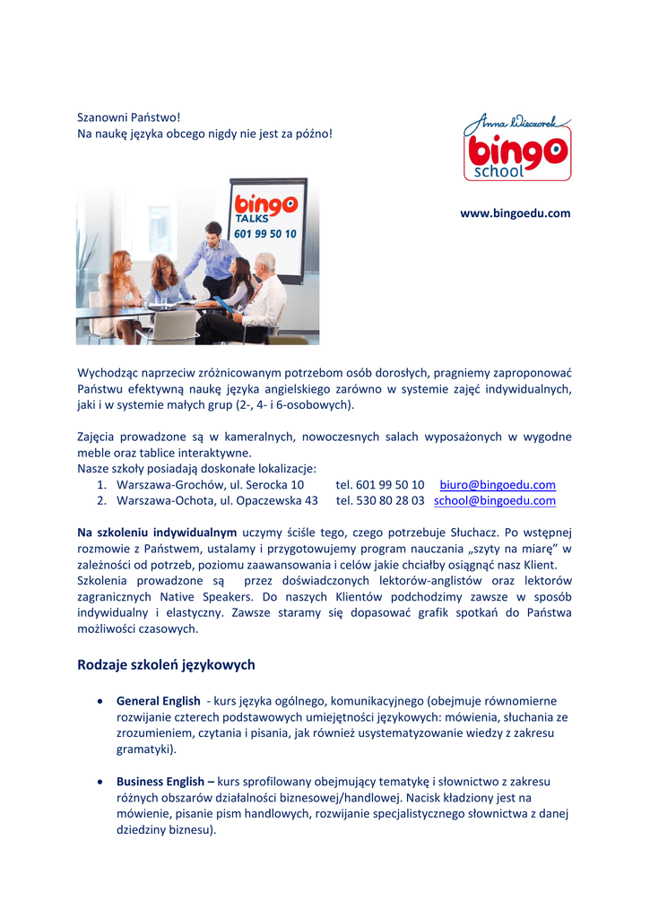 Szanowni Państwo! Na naukę języka obcego nigdy nie jest za późno! www.bingoedu.com Wychodząc naprzeciw zróżnicowanym potrzebom osób dorosłych, pragniemy zaproponować Państwu efektywną naukę języka angielskiego zarówno w systemie zajęć indywidualnych, jaki i w systemie małych grup (2-, 4- i 6-osobowych). Zajęcia prowadzone są w kameralnych, nowoczesnych salach wyposażonych w wygodne meble oraz tablice interaktywne. Nasze szkoły posiadają doskonałe lokalizacje: 1. Warszawa-Grochów, ul. Serocka 10 tel. 601 99 50 10 [email protected] 2. Warszawa-Ochota, ul. Opaczewska 43 tel. 530 80 28 03 [email protected] Na szkoleniu indywidualnym uczymy ściśle tego, czego potrzebuje Słuchacz. Po wstępnej rozmowie z Państwem, ustalamy i przygotowujemy program nauczania „szyty na miarę” w zależności od potrzeb, poziomu zaawansowania i celów jakie chciałby osiągnąć nasz Klient. Szkolenia prowadzone są przez doświadczonych lektorów-anglistów oraz lektorów zagranicznych Native Speakers. Do naszych Klientów podchodzimy zawsze w sposób indywidualny i elastyczny. Zawsze staramy się dopasować grafik spotkań do Państwa możliwości czasowych. Rodzaje szkoleń językowych General English - kurs języka ogólnego, komunikacyjnego (obejmuje równomierne rozwijanie czterech podstawowych umiejętności językowych: mówienia, słuchania ze zrozumieniem, czytania i pisania, jak również usystematyzowanie wiedzy z zakresu gramatyki). Business English – kurs sprofilowany obejmujący tematykę i słownictwo z zakresu różnych obszarów działalności biznesowej/handlowej. Nacisk kładziony jest na mówienie, pisanie pism handlowych, rozwijanie specjalistycznego słownictwa z danej dziedziny biznesu). Polish your English – kurs doskonalący płynność i sprawność posługiwania się językiem angielskim na poziomie średnio-zaawansowanym i zaawansowanym. Może być prowadzony przez lektora polskiego lub Native Speaker-a. Przygotowanie do egzaminów językowych – kurs mający na celu przygotowanie Słuchacza do zdania egzaminu językowego na jednym z określonych poziomów zaawansowania językowego. Przygotowujemy do egzaminów: PET, FCE, CAE, CPE. Kurs „szyty na miarę” – zajęcia prowadzone wg ściśle określonych potrzeb Klienta. Może to być kurs mający na celu przygotowanie do prowadzenia swobodnej rozmowy na poziomie średnio- zaawansowanym i zaawansowanym w określonych obszarach tematycznych, do publicznego wygłaszania przemówień w języku angielskim, prezentacji tematycznych, czytania ze zrozumieniem dokumentów tematycznych, fachowej literatury zawodowej i in. CENNIK LEKCJI INDYWIDUALNYCH I GRUPOWYCH dla słuchaczy dorosłych: Szkolenie językowe Z lektorem polskim Z lektorem zagranicznym (native speaker-em) INDYWID. 1 osoba 80 zł/h GRUPA 2 osoby 100 zł/h GRUPA 4 osoby 160 zł/h GRUPA 6 osób 180 zł/h = 80 zł/1 os. = 50 zł/1 os. = 40 zł/1 os. = 30 zł/1 os. 90 zł 120 zł 200 zł 240 zł = 90 zł/1 os. = 60 zł/1 os. = 50 zł/1 os. = 40 zł/1 os. Serdecznie zapraszam do kontaktu z BINGOschool Anna Wieczorek - dyrektor BINGOschool tel. 601 99 50 10 tel. 661 75 75 98 [email protected]