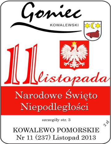 – 1 – Miejsko- Gminny Ośrodek Kultury w Kowalewie Pomorskim w miesiącu listopadzie zaprasza: 10.11.2013r. godz. 18.00- wieczór melomana- koncert pt. „Błękitny Anioł” z udziałem artystów sceny bydgoskiej 11.11.2013 r. – Obchody z okazji Narodowego Święta Niepodległości W programie: godz. 18.00 -Msza Św. w Intencji Miasta i Ojczyzny w Kościele Parafialnym p.w. Św. Mikołaja w Kowalewie Pomorskim, - po mszy przejście z udziałem orkiestry dętej OSP Wielkie Rychnowo pod Pomnik Ku Czci Poległych, złożenie wiązanek kwiatów - uroczysty koncert z udziałem artystów Teatru Muzycznego w Poznaniu-Operetki Poznańskiej w sali widowiskowej Domu Kultury (nieodpłatne wejściówki do odbioru w M-GOK- ilość miejsc ograniczona) 21.11.2013r. godz. 17.00 – BIBLIO- WUTEZETKA Barbara Niewidział Z okazji Dnia Pracownika Socjalnego kierujemy słowa uznania za wysiłek i zaangażowanie w wypełnianiu ważnej roli społecznej na rzecz drugiego człowieka. Życzymy siły oraz wytrwałości w niesieniu pomocy osobom tej pomocy potrzebującym oraz satysfakcji z wykonywanej pracy. Burmistrz Miasta Andrzej Grabowski i pracownicy Urzędu Miejskiego KOMITET RUSZA W TEREN Prace nad nadaniem Szkole Podstawowej w Wielkim Rychnowie (gm. Kowalewo Pomorskie) patrona nabierają tempa. Patron został już wybrany. Uczniowie, grono pedagogiczne i rodzice po długiej kampanii wybrali Janusza Korczaka na swojego opiekuna. Wiemy już, że to imię szkoła otrzyma 1 czerwca 2014r. Obecnie Komitet Nadania Imienia pod przewodnictwem dyrektor szkoły Elżbiety Arbart przystąpił do pozyskania środków finansowych na ufundowanie sztandaru i pamiątkowej tablicy. Na swoim posiedzeniu w dniu 4 października br. ustalono zespoły, które będą zbierać środki we wsiach, z których dzieci uczęszczają do tej placówki: Srebrniki, Mlewo, Mlewiec, Mariany, Wielkie Rychnowo, Borówno i Nowy Dwór. Sztandar jak i drzewiec zostały już zamówione. Obecny na posiedzeniu Burmistrz Miasta Andrzej Grabowski podziękował społecznikom za udział w projekcie. Podkreślał fakt zbierania wśród społeczeństwa środków na sztandar jako akt woli uhonorowania szkoły i docenienie jej tradycji. Wszystkie informacje o działaniach dot. patrona szkoły na stronie: http://sprychnowo.ovh.org/viewpage.php? page_id=35 Karolina Kowalska POGOTOWIE TELEFONICZNE Urz ąd M iejs ki: 56 684- 10- 24; P oste rune k Poli cji: 56 682- 33- 10, 602- 661- 927; Straż Poż arna GD: 56 683- 22- 45; ZUW Ostrow ite: 56 683- 62- 96, 663- 949- 960; M GOK: 56 684- 11- 74; ZG KiM : 56 684- 15- 17; M GOPS: 56 684- 11- 30; G minna Spół ka Wodna: 56 684- 17- 39; Za kł ad Gaz ow nicz y: 56 621- 65- 80/81, 992; Energa Operator S.A. (pogotow ie energ ety cz ne dla regionu K- w o): 56 659- 58- 35, z głasz ani e awari i: 24 365- 10- 10, 991. Redagują: Redaktor Naczelny: Barbara Niewidział, Sekretariat redakcji – Donata Pilarska – Mądry tel. 56 684 16 67 w. 53, współpracują pracownicy Urzędu Miejskiego, pracownicy Miejsko – Gminnego Ośrodka Kultury, szkół. Redakcja oczekuje na artykuły do 20 każdego miesiąca (na adres [email protected]). Ogłoszenia przyjmowane są w M – GOK (cena 100 zł za stronę, część strony proporcjonalnie, nie mniej niż 20 zł). Redakcja nie odpowiada za treść artykułów, reklam i ogłoszeń płatnych. Druk: własny. Wydawca i kolportaż: M – GOK, Plac Wolności 13. Nakład: 290 egz. Numer zamknięto 20.10.2013 r. http://mgok.kowalewopomorskie.pl ISSN 1505 – 098X – 2 – – 3 – XXI DIECEZJALNY FESTIWAL PIEŚNI I PIOSENKI RELIGIJNEJ W dniu 19 października 2013 roku odbył się XXI Diecezjalny Festiwal Pieśni i Piosenki Religijnej. Patronat honorowy nad Festiwalem objęli: Burmistrz Miasta Kowalewa Pomorskiego oraz Biskup Diecezji Toruńskiej. Tegoroczne motto „ W oczekiwaniu na kanonizację Jana Pawła II" zainspirowało młodych wykonawców do poszukiwania odpowiedniego repertuaru i intensywnych przygotowań do udziału w festiwalu. Po mszy świętej w kościele parafialnym, uroczystego otwarcia Festiwalu w sali widowiskowej M-GOK dokonali: Burmistrz Miasta Kowalewa Pomorskiego p. Andrzej Grabowski, Ks. Kanonik Ryszard Kobierowski, Dziekan Dekanatu Kowalewskiego oraz Dyrektor Miejsko-Gminnego Ośrodka Kultury p. Barbara Niewidział. Komisja festiwalowa w składzie: Anna Maria Witkowska absolwentka Archidiecezjalnego Studium Organistowskiego w Sandomierzu oraz Wydziału Muzykologii Katolickiego Uniwersytetu Lubelskiego w klasie organ, Roman Fieberg- kierownik Pracowni Muzyki i Piosenki Wojewódzkiego Ośrodka Kultury I Sztuki „Stara Ochronka" w Bydgoszczy oraz Jarosław Salej- akompaniator, kompozytor, aranżer, realizator dźwięku z Brodnicy przyznali następujące miejsca i wyróżnienia: GRAND PRIX FESTIWALU - Monika Kolasińska - Zławieś Mała Kat. do 12 lat I Wiktoria Bielawa - Brodnica II Małgorzata Myszkowska - Toruń III Laura Truszczyńska - Nowe Miasto Lubawskie Kat. 13 - 15 lat I Alicja Tarnowska - Czernikowo II Karolina Zielińska - Kowalewo Pomorskie III Julia Musiał - Jabłonowo Pomorskie Wyróżnienie : Klaudia Kopczyńska - Lipno Kat. 16 -21 lat I Aleksandra Pryl II Dominika Dreszler - Złąwieś Mała II Joanna Kaczmarkiewicz - Czernikowo III Wioleta Markowska - Czernikowo Wyróżnienie: Aleksandra Palczak - Lipno Kat. zespoły III - Duet Marcelina i Marcel Rucińscy - Prątnica Wyróżnienie: Grupa Wokalna Ladies - Toruń Kwartet Wokalny - Jabłonowo Pomorskie Weronika Krajnik , Martyna Nowak - ZS Brzozówka Wyniki Festiwalu zostały przyjęte z wielkim entuzjazmem, a laureaci zostali nagrodzeni gromkimi brawami. Po przesłuchaniach konkursowych wystąpił Mateusz Winnicki. Na scenie towarzyszyli mu Agata Michurska i Szymon Michurski. Mateusz jest wielokrotnym zwycięzcą i finalistą wielu konkursów, festiwali i przeglądów wokalnych. Występował gościnnie podczas organizowanej po raz pierwszy w Kowalewie Pomorskim „Nocy Świętojańskiej". Spons