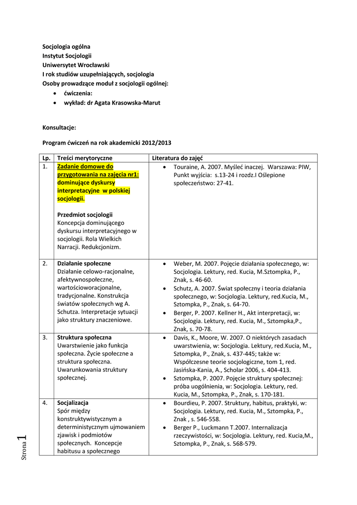 Socjologia ogólna Instytut Socjologii Uniwersytet Wrocławski I rok studiów uzupełniających, socjologia Osoby prowadzące moduł z socjologii ogólnej: ćwiczenia: wykład: dr Agata Krasowska-Marut Konsultacje: Program ćwiczeń na rok akademicki 2012/2013 Lp. 1. Treści merytoryczne Zadanie domowe do przygotowania na zajęcia nr1: dominujące dyskursy interpretacyjne w polskiej socjologii. Literatura do zajęć Touraine, A. 2007. Myśleć inaczej. Warszawa: PIW, Punkt wyjścia: s.13-24 i rozdz.I Oślepione społeczeństwo: 27-41. Przedmiot socjologii Koncepcja dominującego dyskursu interpretacyjnego w socjologii. Rola Wielkich Narracji. Redukcjonizm. 2. 3. Strona 1 4. Działanie społeczne Działanie celowo-racjonalne, afektywnospołeczne, wartościoworacjonalne, tradycjonalne. Konstrukcja światów społecznych wg A. Schutza. Interpretacje sytuacji jako struktury znaczeniowe. Struktura społeczna Uwarstwienie jako funkcja społeczna. Życie społeczne a struktura społeczna. Uwarunkowania struktury społecznej. Socjalizacja Spór między konstruktywistycznym a deterministycznym ujmowaniem zjawisk i podmiotów społecznych. Koncepcje habitusu a społecznego Weber, M. 2007. Pojęcie działania społecznego, w: Socjologia. Lektury, red. Kucia, M.Sztompka, P., Znak, s. 46-60. Schutz, A. 2007. Świat społeczny i teoria działania społecznego, w: Socjologia. Lektury, red.Kucia, M., Sztompka, P., Znak, s. 64-70. Berger, P. 2007. Kellner H., Akt interpretacji, w: Socjologia. Lektury, red. Kucia, M., Sztompka,P., Znak, s. 70-78. Davis, K., Moore, W. 2007. O niektórych zasadach uwarstwienia, w: Socjologia. Lektury, red.Kucia, M., Sztompka, P., Znak, s. 437-445; także w: Współczesne teorie socjologiczne, tom 1, red. Jasińska-Kania, A., Scholar 2006, s. 404-413. Sztompka, P. 2007. Pojęcie struktury społecznej: próba uogólnienia, w: Socjologia. Lektury, red. Kucia, M., Sztompka, P., Znak, s. 170-181. Bourdieu, P. 2007. Struktury, habitus, praktyki, w: Socjologia. Lektury, red. Kucia, M., Sztompka, P., Znak , s. 546-558. Berger P., Luckmann T.2007. Internalizacja rzeczywistości, w: Socjologia. Lektury, red. Kucia,M., Sztompka, P., Znak, s. 568-579. tworzenia rzeczywistości społecznej Wiedza społeczna Składowe wiedzy społecznej. Rola wiedzy zdroworozsądkowej. Siła ideologii. Obcość, anomia, dewiacje Kariera dewianta. Beckera koncepcja etykietowania. Działanie nonkonformistyczne. Bycie obcym a zjawiska marginalizacji, wykluczenia oraz włączenia. 7. Normy, wartości, instytucje Teza o społecznych źródłach sprawiedliwości. Relacyjność idei równości. Jak działają instytucje? Instytucje a jednostka. Uprawomocnienie instytucji. Świadomość moralna. 8. Państwo, wolność, własność Wpływ transformacji ekonomicznej na państwo i wolność. Idee neoliberalne a wolność: dyskusja wykorzystująca spojrzenie zawarte w literaturze do zajęć. 5. 6. Strona 2 9. Władza, przemoc, płeć Dyskurs władzy. Przemoc symboliczna. Znaczenie działań penitencjarnych (więźniowe jako pracownicy). Dyskurs odosobnienia: rozwiązania stosowane w szpitalach psychiatrycznych. Dyskurs kontroli: seks i seksualność. 10. Kapitał społeczny i zaufanie Porównawcza analiza różnych ujęć kapitału społecznego. Krytyczne studia nad zaufaniem społecznym. Zaufanie a niedotrzymane obietnice. Zadanie domowe na zajęcia nr 11: opracować ruchy społeczne, van Dijk, T. A.2007. Przekonania społeczne, w: Socjologia. Lektury, red. Kucia, M., Sztompka, P., Znak, s. 349-361. Berger P., Luckmann T. 1983. Język a wiedza życia codziennego, w: Berger P., Luckmann T.,Społeczne tworzenie rzeczywistości, PIW, s. 69-84. Simmel, G.2007. Obcy, w: Socjologia. Lektury, red. Kucia, M., Sztompka, P., Znak, s.580-583. Merton, R.2007. Struktura społeczna i anomia, w: Socjologia. Lektury, red. Kucia, M.,Sztompka, P., Znak, s. 583-596. Becker, H. 2007. Rodzaje dewiacji. Model sekwencyjny, w: Socjologia. Lektury, red. Kucia, M.,Sztompka, P., Znak, s. 596-608. Douglas, M. 2011. Jak myślą instytucje, PWN, rozdz.9 Instytucje decydują o życiu lub śmierci, s.129-151. Hardy, J.2009. Nowy polski kapitalizm. Książka i Prasa, Rozdz.3 „Nie tylko piąta kolumna”. Jak budowano przyzwolenie na neoliberalizm. S.87-116. von Mises, L. 2009. Wolność i własność, Instytut Ludwiga von Misesa, s. 1-14 http://mises.pl/pliki/upload/Mises_Wolnosc_i_wlasnosc.pdf von Hayek, F. A., Konstytucja wolności, PWN 2006, rozdz. 1 i 2, s. 25-51. Foucault, M.2006. Wiedza i władza, w: Współczesne teorie socjologiczne, tom 1, red. Jasińska-Kania, A. i in., Scholar, s. 537-544. Bourdieu, P. 2007. Przemoc symboliczna, w: Socjologia. Lektury, red. Kucia, M., Sztompka, P.,Znak, s. 503-508. Lukes, S. 2006. Władza w ujęciu radykalnym, w: Współczesne teorie socjologiczne, tom 1, red. Jasińska-Kania, A. i in., Scholar 2006, s. 502-511. de Tocqueville,A.2007. O użytku, jaki w życiu społecznym Amerykanie czynią ze stowarzyszeń,w: Socjologia. Lektury, red. Kucia, M., Sztompka, P., Znak 2007, s. 383-385. Putnam, R.2007. Społeczny kapitał a sukces instytucji, w: Socjologia. Lektury, red. Kucia, M.,Sztompka, P., Znak 2007, s. 388-397. Sztompka, P.2007. Zaufanie, nieufność i dwa paradoksy demokracji, w: Socjologia. Lektury,red. jakie miały/mają miejsce w czasie obecnego kryzysu gospodarczego. 11. Nowe ruchy społeczne Kryzys finansowy a ruchy społeczne. Przykłady. 12. Współpraca w sieci Wirtualne działanie społeczne. Alternatywne procesy twórcze. 13. Lokalność i globalność Wytwarzanie lokalności w oparciu o elementy globalne. Poszukiwanie punktów przecięć różnorodności kulturowej. Geneza nowej lokalności. 14. Społeczeństwo światowe Złożoność idei społeczeństwa globalnego. Ujęcie systemowe. Mobilność, przepływy i ideologie. Kucia, M., Sztompka, P., Znak 2007, s. 397-408. Offe, C.2007. Nowe ruchy społeczne: przekraczanie granic polityki instytucjonalnej, w:Socjologia. Lektury, red. Kucia, M