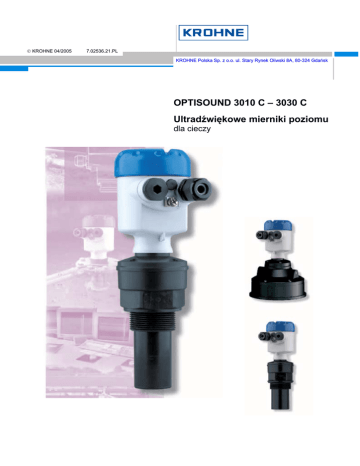 © KROHNE 04/2005 7.02536.21.PL KROHNE Polska Sp. z o.o. ul. Stary Rynek Oliwski 8A, 80-324 Gdańsk OPTISOUND 3010 C – 3030 C Ultradźwiękowe mierniki poziomu dla cieczy KROHNE Polska Sp. z o.o. Spis treści 2 4 6 10 10 10 10 10 11 12 12 12 12 13 17 1. 2. 3. 4. Opis zasady działania Przegląd typów Informacje montażowe Podłączenie elektryczne 4.1. Wymagania ogólne 4.2. Napięcie zasilające 4.3. Przewód przyłączeniowy i instalacja 4.4. Ekranowanie przewodu i uziemienie 4.5. Schemat połączeń 5. Nastawy 5.1. Nastawy – ogólnie 5.2. Zgodność wg NAMUR NE 53 5.3. Nastawy z modułem wskaźnikowym/regulacyjnym 6. Dane techniczne 7. Wymiary W przypadku zastosowań Ex należy postępować zgodnie z instrukcjami bezpieczeństwa. 30600 EN 050401 Należy stosować się do postanowień instrukcji, jak również przestrzegać wszelkich informacji związanych z bezpieczeństwem przeciwwybuchowym, które dostępne są na stronie www.krohne-mar.com oraz które dostarczane są wraz z urządzeniem w wersji przeciwwybuchowej. Ponadto należy stosować się do postanowień obowiązujących przepisów oraz informacji zawartych w dopuszczeniach typu i certyfikatach zgodności czujników i urządzeń zasilających. Czujniki mogą współpracować wyłącznie z obwodami iskrobezpiecznymi. Dopuszczalne wartości parametrów elektrycznych podane są w stosownym certyfikacie. 1. Opis zasady działania Zasada działania Krótkie impulsy ultradźwiękowe w zakresie 35 do 70 kHz generowane są przez przetwornik umieszczony w górnej części zbiornika, by po odbiciu od powierzchni produktu, powrócić do przetwornika. Prędkość impulsów równa jest prędkości dźwięku w atmosferze zbiornika – czas pomiędzy wygenerowaniem impulsu a jego powrotem zależy od lokalizacji poziomu mierzonej substancji w zbiorniku. Powracające echo odseparowane jest od sygnałów zakłócających poprzez użycie zaawansowanych procedur obróbki sygnału, a na jego podstawie wyliczany jest dokładny dystans do powierzchni produktu. Wbudowany w głowicę pomiarową czujnik temperatury, pozwala na pomiar temperatury w zbiorniku i przeprowadzenie kompensacji temperaturowej czasu przebiegu sygnału. Poprzez proste wprowadzenie do przetwornika parametrów zbiornika, na podstawie dystansu, generowany jest sygnał proporcjonalny do poziomu mierzonej substancji. Dla dokonania początkowych nastaw nie jest wymagane wstępne wypełnienie zbiornika. OPTISOUND 3010 C – 3030 C – ultradźwiękowe mierniki poziomu 2 / 18 KROHNE Polska Sp. z o.o. Szeroki zakres zastosowań Przetworniki OPTISOUND 3010 C, 3020 C oraz 3030 C zaprojektowano specjalnie do pomiaru poziomu cieczy, choć stosowane są również do pomiaru poziomu substancji sypkich. Urządzenia różnią się zakresem pomiarowym, wersją przetwornika i przyłączem procesowym. Dzięki różnym, odpowiednio adaptowanym częstotliwościom emisyjnym fali dźwiękowej, uzyskuje się zakresy pomiarowe poziomu w granicach 5...15 m. Zastosowanie odpowiednich materiałów w zakresie czujnika (głowicy pomiarowej) oraz przyłączy, umożliwia stosowanie urządzeń (zależnie od modelu) w obecności produktów o własnościach korozyjnych. Praktyczna taśma montażowa umożliwia wygodną orientację urządzenia OPISOUND 3030 C. Niezależność od własności produktu Odchyłki w składzie produktu lub nawet całkowita zmiana produktu – nie wpływają na jakość pomiaru. Ponowna nastawa urządzenia nie jest konieczna. Wygodna obsługa i konserwacja Dzięki bezkontaktowej metodzie pomiaru, przetworniki serii OPTISOUND są wyjątkowo łatwe w obsłudze i konserwacji. 1.1 Przykłady zastosowań Baseny otwarte Typowym zastosowaniem dla urządzenia OPTISOUND 3010 C jest pomiar poziomu w basenach i zbiornikach otwartych, zawierających produkty takie, jak: woda deszczowa, woda zanieczyszczona, ścieki wodne itp. Oczywistą zaletą urządzenia jest jego bezkontaktowy pomiar – prosty i bezobsługowy. Stopień zanieczyszczenia wody lub gromadzenie się dennych osadów nie ma znaczenia – ze względu na fakt pomiaru poziomu. Rys.1 Pomiar poziomu w otwartym basenie – OPTISOUND 3010 C Wlot do oczyszczalni ścieków Ścieki wodne gromadzone są w budynku (części) dolotowej, skąd pompami spiralnymi transportuje się je do basenów procesowych. Pomiar poziomu na wlocie przeprowadzany jest z punktu widzenia zapotrzebowania pomp. Bardziej efektywny przetwornik (OPISOUND 3020 C) zapewnia wiarygodny pomiar nawet przy fluktuacjach poziomu i zmianie rodzaju powierzchni. Wersja Ex dostępna jest dla zastosowań w obszarach zagrożonych wybuchem. Rys.2 Pomiar poziomu na wlocie do oczyszczalni ścieków – OPTISOUND 3020 C OPTISOUND 3010 C – 3030 C – ultradźwiękowe mierniki poziomu 3 / 18 KROHNE Polska Sp. z o.o. Zbiornik szlamów i osadów Jednym z procesów przeprowadzanych w oczyszczalniach ścieków jest odwadnianie (odciek) szlamów, transportowanych następnie przenośnikiem taśmowym do zbiorników. OPTISOUND 3030 C mierzy poziom wypełnienia zbiornika – tuż przed wypełnieniem zbiornika dostarczony powinien zostać kolejny, pusty zbiornik. Dzięki metalowej membranie głowicy pomiarowej (czujnika), pomiar odbywa się tak podczas fluktuacji temperatury, jak i podczas powstawania oparów. Rys.3 Pomiar poziomu w zbiorniku szlamów i osadów – OPTISOUND 3030 C 2. Przegląd typów Zastosowanie: Ciecze i substancje sypkie w niemal wszystkich gałęziach przemysłu, szczególnie w gospodarce wodnej i ściekowej. Ciecze i substancje sypkie w niemal wszystkich gałęziach przemysłu, szczególnie w gospodarce wodnej i ściekowej. Ciecze i substancje sypkie w niemal wszystkich gałęziach przemysłu. Zakres pomiarowy: Ciecze: 0.25...5 m Mat. sypkie: 0.25...2 m Ciecze: 0.4...8 m Mat. sypkie: 0.4...3.5 m Ciecze: 0.6...15 m Mat. sypkie: 0.6...7 m Przyłącze procesowe: G1½A z PVDF G2A z PVDF Temperatura procesowa: Ciśnienie procesowe: Wyjście sygnałowe: -40...+80°C -40...+80°C K