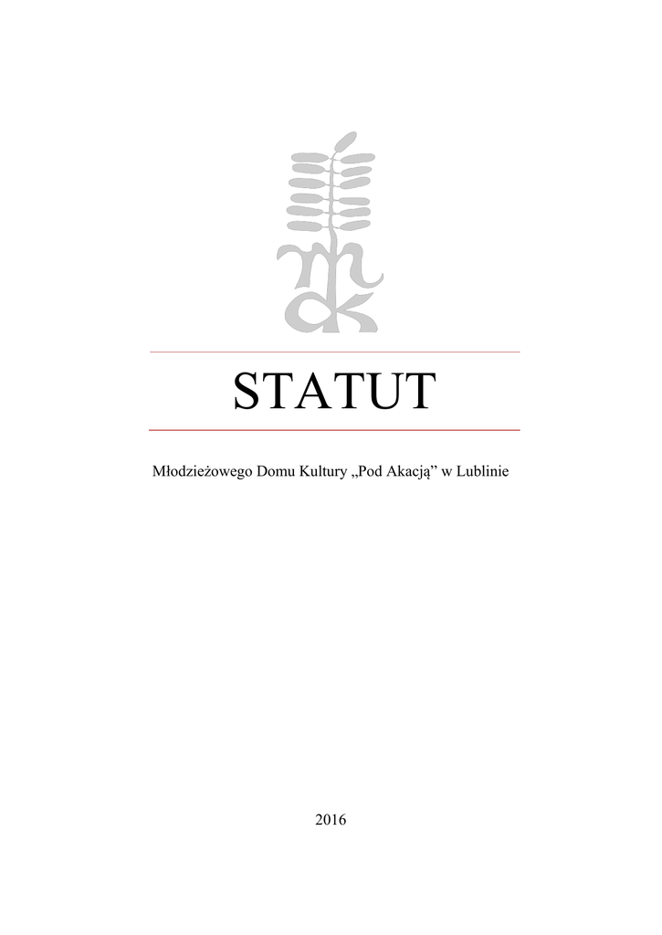 STATUT Młodzieżowego Domu Kultury „Pod Akacją” w Lublinie 2016 SPIS TREŚCI PODSTAWA PRAWNA .................................................................................................................................. - 3 § 1 POSTANOWIENIA OGÓLNE ..................................................................................................................... - 4 § 2 CELE I ZADANIA MŁODZIEŻOWEGO DOMU KULTURY ............................................................................. - 5 § 2.1. § 2.2. § 2.3. § 2.4. § 2.5. § 2.6. CELE SZCZEGÓŁOWE ..........................................................................................................................- 5 ZADANIA MDK .................................................................................................................................- 5 FORMY REALIZACJI ZADAŃ ................................................................................................................- 6 ZASADY UDZIELANIA WYCHOWANKOM, ICH RODZICOM I NAUCZYCIELOM POMOCY PSYCHOLOGICZNO-PEDAGOGICZNEJ ..................................................................................................- 6 WSPÓŁPRACA Z RODZINAMI WYCHOWANKÓW...................................................................................- 8 WSPÓŁPRACA ZE SZKOŁAMI, INSTYTUCJAMI, ORGANIZACJAMI POZARZĄDOWYMI ORAZ ŚRODOWISKIEM LOKALNYM .....................................................................................................- 8 - § 3 ORGANY PLACÓWKI ............................................................................................................................... - 9 § 3.1. § 3.2. § 3.3. § 3.4. § 3.5. § 3.6. ORGANY PLACÓWKI - WSTĘP .............................................................................................................- 9 DYREKTOR PLACÓWKI ......................................................................................................................- 9 RADA PEDAGOGICZNA .....................................................................................................................- 10 RADA RODZICÓW ............................................................................................................................- 12 SAMORZĄDY PRACOWNI..................................................................................................................- 13 ZASADY WSPÓŁDZIAŁANIA ORGANÓW PLACÓWKI ORAZ SPOSÓB ROZWIĄZYWANIA SPORÓW MIĘDZY NIMI ....................................................................................................................................- 13 - § 4 ORGANIZACJA PLACÓWKI ..................................................................................................................... - 15 § 4.1. § 4.2. § 4.3. § 4.4. ZAJĘCIA STAŁE ................................................................................................................................- 16 ZAJĘCIA OKAZJONALNE I OKRESOWE ...............................................................................................- 17 WOLONTARIAT ................................................................................................................................- 17 ZASADY REALIZACJI ZADAŃ POZA PLACÓWKĄ ................................................................................- 18 - § 5 ZAKRES ZADAŃ PRACOWNIKÓW PEDAGOGICZNYCH I NIEPEDAGOGICZNYCH ..................................... - 19 § 6 POWOŁANIE WICEDYREKTORA I TWORZENIE STANOWISK KIEROWNICZYCH W PLACÓWCE. ............... - 22 § 7 ZASADY UDZIAŁU DZIECI I MŁODZIEŻY W ZAJĘCIACH ORGANIZOWANYCH PRZEZ PLACÓWKĘ .............. - 23 § 8 BEZPIECZEŃSTWO W PLACÓWCE .......................................................................................................... - 24 §8.1. §8.2. WARUNKI POBYTU W PLACÓWCE ....................................................................................................- 24 MONITORING ...................................................................................................................................- 24 - § 9 ZASADY REKRUTACJI ............................................................................................................................. - 26 § 10 PRAWA I OBOWIĄZKI WYCHOWANKÓW, RODZAJE NAGRÓD I KAR ................................................... - 28 POSTANOWIENIA KOŃCOWE ..................................................................................................................... - 31 - Statut Młodzieżowego Domu Kultury „Pod Akacją” w Lublinie -2- PODSTAWA PRAWNA 1. Ustawa z dnia 7 września 1991 r. o systemie oświaty (tekst jednolity Dz.U. z dnia 2 grudnia 2004 r. Nr 256 poz. 2572 z późniejszymi zmianami). 2. Ustawa z dnia 26 stycznia 1982r. Karta Nauczyciela (Dz. U. z 2003r. z późniejszymi zmianami). 3. Rozporządzenie Ministra Edukacji Narodowej i Sportu z dnia 7 marca 2005r. w sprawie ramowych statutów placówek publicznych (Dz.U. z 2005r. Nr 52, poz. 466). 4. Rozporządzenie Ministra Edukacji Narodowej z dnia 2 listopada 2015r. w sprawie rodzajów i szczegółowych zasad działania placówek publicznych, warunków pobytu dzieci i młodzieży w tych placówkach oraz wysokości i zasad odpłatności wnoszonej przez rodziców za pobyt ich dzieci w tych placówkach (Dz. U. z 2011 roku Nr 109, poz. 631). 5. Ustawa z dnia 27 sierpnia 2009r. o finansach publicznych (Dz.U. nr 157, poz. 1240 z późniejszymi zmianami). 6. Rozporządzenie Ministra Edukacji Narodowej z dnia 17 listopada 2010r. w sprawie zasad udzielania i organizacji pomocy psychologiczno-pedagogicznej. 7. Rozporządzenie Ministra Edukacji Narodowej i Sportu z dnia 31 grudnia 2002r. w sprawie bezpieczeństwa i higieny w publicznych oraz niepublicznych szkołach i placówkach. 8. Ustawa z dnia 29 sierpnia 1997r. o ochronie danych osobowych (Dz. U. z 2002 r. Nr101, poz. 926, z późniejszymi zmianami). 9. Ustawa z dnia 2