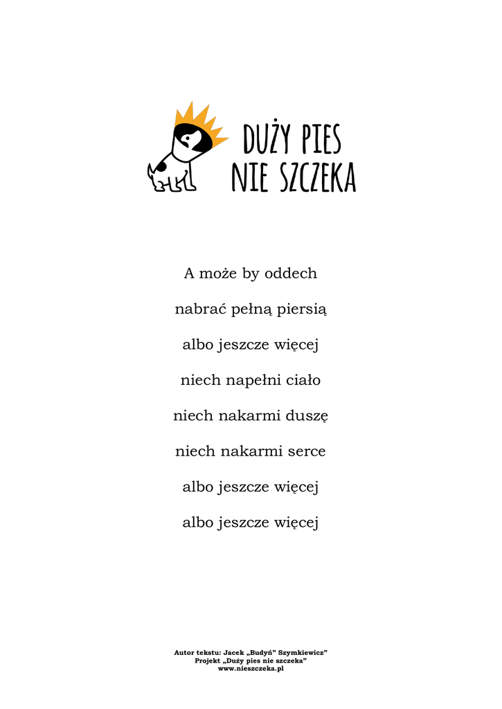 A może by oddech nabrać pełną piersią albo jeszcze więcej niech napełni ciało niech nakarmi duszę niech nakarmi serce albo jeszcze więcej albo jeszcze więcej Autor tekstu: Jacek „Budyń” Szymkiewicz” Projekt „Duży pies nie szczeka” www.nieszczeka.pl