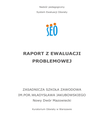 Nadzór pedagogiczny System Ewaluacji Oświaty RAPORT Z EWALUACJI PROBLEMOWEJ ZASADNICZA SZKOŁA ZAWODOWA IM.POR.WŁADYSŁAWA JAKUBOWSKIEGO Nowy Dwór Mazowiecki Kuratorium Oświaty w Warszawie Wstęp Prezentowany raport jest rezultatem ewaluacji zewnętrznej przeprowadzonej w szkole przez wizytatorów do spraw ewaluacji. Ewaluacja zewnętrzna polega na zbieraniu i analizowaniu informacji na temat funkcjonowania szkoły w obszarach wyznaczonych przez wymagania państwa: 1. Szkoła lub placówka realizuje koncepcję pracy ukierunkowaną na rozwój uczniów. 2. Procesy edukacyjne są zorganizowane w sposób sprzyjający uczeniu się. 3. Uczniowie nabywają wiadomości i umiejętności określone w podstawie programowej. 4. Uczniowie są aktywni. 5. Kształtowane są postawy i respektowane normy społeczne. 6. Szkoła lub placówka wspomaga rozwój uczniów, z uwzględnieniem ich indywidualnej sytuacji. 7. Nauczyciele współpracują w planowaniu i realizowaniu procesów edukacyjnych. 8. Promowana jest wartość edukacji. 9. Rodzice są partnerami szkoły lub placówki. 10. Wykorzystywane są zasoby szkoły lub placówki oraz środowiska lokalnego na rzecz wzajemnego rozwoju. 11. Szkoła lub placówka, organizując procesy edukacyjne, uwzględnia wnioski z analizy wyników sprawdzianu, egzaminu gimnazjalnego, egzaminu maturalnego, egzaminu potwierdzającego kwalifikacje zawodowe i egzaminu potwierdzającego kwalifikacje w zawodzie oraz innych badań zewnętrznych i wewnętrznych. 12. Zarządzanie szkołą lub placówką służy jej rozwojowi. Ewaluacja ma także na celu ustalenie, czy szkoła spełnia badane wymagania zawarte w rozporządzeniu Ministra Edukacji Narodowej z dnia 6.08.2015 r. Szkoła może spełniać wymagania na poziomie podstawowym i podejmować działania z wysokiego poziomu wymagania. ZASADNICZA SZKOŁA ZAWODOWA IM.POR.WŁADYSŁAWA JAKUBOWSKIEGO 2/31 Opis metodologii Badanie zostało zrealizowane w dniach 4.04-2016 - 8-04-2016 przez zespół wizytatorów ds. ewaluacji, w skład którego weszli: Ewa Kosińska, Andrzej Jabłoński. Badaniem objęto 47 uczniów (ankieta), 49 rodziców (ankieta i wywiad grupowy) i 29 nauczycieli (ankieta i wywiad grupowy). Przeprowadzono wywiad indywidualny z dyrektorem placówki, nauczycielami i nauczycielami uczącymi w jednym oddziale, a także obserwacje lekcji, placówki i analizę dokumentacji. Na podstawie zebranych danych został sporządzony raport, który obejmuje podstawowe obszary działania szkoły lub placówki. Wyjaśnienie skrótów dla narzędzi: OZ - Akusz obserwacji zajęć AD - Kwestionariusz ankiety dla dyrektora/dyrektorki szkoły AN - Kwestionariusz ankiety dla nauczycieli AR - Kwestionariusz ankiety dla rodziców AMD - Kwestionariusz ankiety dla uczniów "Mój dzień" AMS - Kwestionariusz ankiety dla uczniów "Moja szkoła" APW - Kwestionariusz ankiety poewaluacyjnej dla wizytatora ADZ - Kwestionariusz badania "Analiza danych zastanych" WN - Scenariusz wywiadu grupowego z nauczycielami WR - Scenariusz wywiadu grupowego z rodzicami WD - Scenariusz wywiadu z dyrektorem/dyrektorką szkoły WNPO - Scenariusz wywiadu z nauczycielem po obserwacji WNO - Scenariusz wywiadu z zespołem nauczycieli uczących w jednym oddziale ZASADNICZA SZKOŁA ZAWODOWA IM.POR.WŁADYSŁAWA JAKUBOWSKIEGO 3/31 Obraz placówki Zasadnicza Szkoła Zawodowa wchodzi w skład Zespołu Szkół im. por. Władysława Jakubowskiego w Nowym Dworze Mazowieckim. Szkoła kształci w zawodach: monter zabudowy i robót wykończeniowych w budownictwie, mechanik pojazdów samochodowych, a także prowadzi klasy wielozawodowe. Szkoła dba o profesjonalne przygotowanie swoich uczniów do zawodów, w których kształci. Współpracuje z takim firmami jak: HARTZLACK, WEBER, KNAUF, które przeprowadzają szkolenia, pokazy, dostarczają materiały do pracowni. Jako jedna z 17 szkół w Polsce uczestniczy w programie Młode Kadry zorganizowanym przez firmę InterCars. Dzięki temu uczniowie uczestniczą nieodpłatnie w specjalistycznych szkoleniach organizowanych przez partnerów InterCars, takich jak: Bosch, OSRAM, MAHLE, Denso, Continental, Schaeffler, Castrol i innych. Zajęcia praktyczne jak również egzaminy zawodowe z kwalifikacji odbywają się w nowoczesnych pracowniach na terenie szkoły. Uczniowie klas wielozawodowych podpisują z pracodawcą umowę o pracę w ramach przygotowania zawodowego. W celu poprawienia warunków kształcenia zawodowego rozpoczęto budowę warsztatów szkolnych dzięki wsparciu finansowemu Starosty Nowodworskiego i Rady Powiatu Nowodworskiego. Realizowany jest projekt pracowni montera zabudowy i robót wykończeniowych oraz mechanika pojazdów samochodowych w zasadniczej szkole zawodowej pod potrzeby kształcenia praktycznego. W szkole wiele prac modernizacyjnych zostało wykonanych przez uczniów w ramach zajęć praktycznych. Młodzież razem z nauczycielami będzie również współuczestniczyła w aranżacji pomieszczeń nowego budynku warsztatów. Planuje się po wybudowaniu warsztatów uruchomienie kursów kształcenia zawodowego m.in. w zakresie spawania. W szkole panuje przyjazna atmosfera, młodzież jest kulturalna, chętnie angażuje się w działania społeczne i charytatywne. ZASADNICZA SZKOŁA ZAWODOWA IM.POR.WŁADYSŁAWA JAKUBOWSKIEGO 4/31 Informacja o placówce Patron ZASADNICZA SZKOŁA ZAWODOWA IM.POR.WŁADYSŁAWA JAKUBOWSKIEGO im.por.Władysława Jakubowskiego Typ placówki Zasadnicza szkoła zawodowa Miejscowość Nowy Dwór Mazowiecki Ulica Górska Numer 39 Kod pocztowy 05-100 Urząd pocztowy Nowy Dwór Mazowiecki Telefon 0227752042 Fax 0227752042 Www www.zsz1ndm.pl Regon 01553196400000 Publiczność publiczna Kategoria uczniów Dzieci lub młodzież Charakter brak specyfiki Uczniowie, wychow., słuchacze 180 Oddziały 6 Nauczyciele pełnozatrudnieni 0.00 Nauczyciele niepełnozat. (stos.pracy) 0.00 Nauczyciele niepełnozat._(w etatach) 0.00 Średnia liczba uczących się w oddziale 30 Nazwa placówki Liczba uczniów p