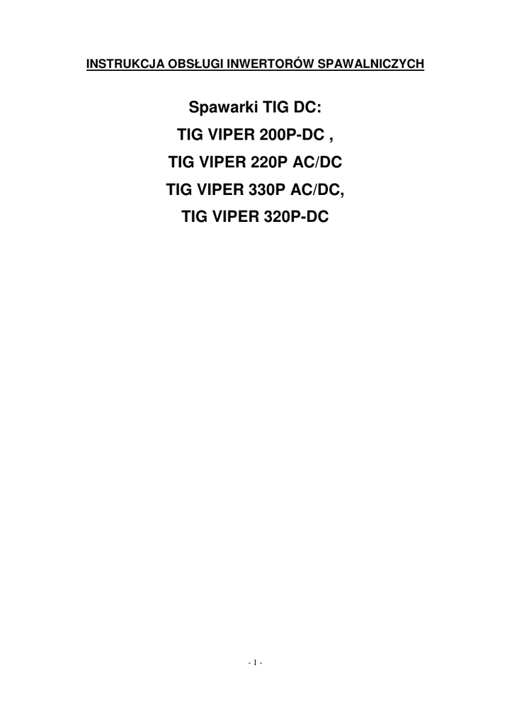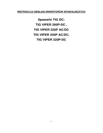 INSTRUKCJA OBSŁUGI INWERTORÓW SPAWALNICZYCH Spawarki TIG DC: TIG VIPER 200P-DC , TIG VIPER 220P AC/DC TIG VIPER 330P AC/DC, TIG VIPER 320P-DC -1- SPIS TREŚCI 1.Uwagi ogólne…………………………................…....……………………… 4 2. Ogólna charakterystyka.………….………………………….………..…..…. 4 3. Dane techniczne………………………………………...………..….........…. 5 4. Opis panelu TIG VIPER 200P-DC ………………………………………. 6 5. Opis panelu TIG VIPER 220P AC/DC..................................................... 7 6. Opis panelu TIG VIPER 330P AC/DC ………………………………….. 9 7. Opis panelu TIG VIPER 320P-DC ………………………………………. 11 8. Przygotowanie do pracy……………………………………………………. 13 8.1. Podłączenie do sieci………………………...............……………......... 13 8.2. Podłączenie przewodów spawalniczych w metodzie MMA.....………. 13 9. Spawanie metodą MMA…….……………..………………......…............... 13 10. Spawanie metodą TIG LIFT...……………………………………………… 13 11. Spawanie metodą TIG HF................................................................................... 14 12 Dobór parametrów spawania w metodzie MMA.............................………........ 14 13. Dobór parametrów spawania w metodzie TIG................................……... 14 14. Zakłócenia w pracy spawarki……….....…………………………………... 15 15. Konserwacja………............……………...………………………………… 15 16. Wady spoin………………………………………...……………………….. 17 17. Przygotowanie krawędzi w metodzie MMA………..…………………...… 17 18. Technologia spawania metodą MMA………..………….........…………… 17 19. Zalecenia praktyczne przy spawaniu metodą MMA……...……………….. 18 20. Przygotowanie krawędzi w metodzie TIG…………………………………. 20 21. Technologia spawania metodą TIG………...……………………………… 20 22. Zalecenia praktyczne przy spawaniu metodą TIG...……………….. …….. 21 23. Gazy ochronne stosowane w metodzie TIG…………….…………………. 22 24. Bezpieczeństwo użytkowania………………..………….………………..... 23 -2- 1. UWAGI OGÓLNE Uruchomienia, instalacji i eksploatacji inwertorów spawalniczych, można dokonać tylko po dokładnym zapoznaniu się z niniejszą instrukcją obsługi. Nieprzestrzeganie zaleceń zawartych w tej instrukcji może narazić użytkownika na poważne obrażenia ciała, śmierć lub uszkodzenia samego urządzenia. Nie można dopuszczać dzieci w pobliże miejsca pracy i do urządzenia. Osoby z wszczepionym rozrusznikiem serca zanim podejmą pracę z tym urządzeniem, powinny skonsultować się ze swoim lekarzem. Obsługa serwisowa i naprawy tych urządzeń mogą być prowadzone przez wykwalifikowany personel, z zachowaniem warunków bezpieczeństwa pracy obowiązujących dla urządzeń elektrycznych. Przeróbki we własnym zakresie mogą spowodować zmianę cech użytkowych urządzeń lub pogorszenie parametrów spawalniczych. Wszelkie przeróbki urządzeń, we własnym zakresie, powodują nie tylko utratę gwarancji, ale mogą być przyczyną pogorszenia się warunków bezpieczeństwa użytkowania i narażenia użytkownika na niebezpieczeństwo porażenia prądem. Niewłaściwe warunki pracy mogą spowodować uszkodzenia urządzenia oraz jego niewłaściwa obsługa, powoduje utratę gwarancji UWAGA: • Urządzenie oparte na podzespołach elektronicznych. Szlifowanie i cięcie metali w pobliżu spawarki może powodować zanieczyszczenie opiłkami wnętrza urządzenia, doprowadzając tym samym do jego uszkodzenia. • Wyżej wymienione uszkodzenie nie podlega naprawie gwarancyjnej! • W przypadku konieczności pracy w takim środowisku należy dokonywać czyszczenia urządzenia przez przedmuchanie wnętrza spawarki sprężonym powietrzem. Zgodnie z Dyrektywą Europejską 2002/96/EC dotyczącą Pozbywania się zużytego Sprzętu Elektrycznego i Elektronicznego i jej wprowadzeniem w życie zgodnie z międzynarodowym prawem, zużyty sprzęt elektryczny musi być składowany oddzielnie i specjalnie utylizowany. Jako właściciel urządzeń powinieneś otrzymać informacje o zatwierdzonym systemie składowania od naszego lokalnego przedstawiciela. Nie wyrzucać osprzętu elektrycznego razem z normalnymi odpadami! Stosując te wytyczne będziesz chronił środowisko i zdrowie człowieka! 2. OGÓLNA CHARAKTERYSTYKA Urządzenia inwertorowe nowej serii MAGNUM są jest lekkimi, przenośnymi, źródłami energii. Dla uzyskania jak najlepszych osiągów i niezawodności urządzenia wytwarzane są zgodnie z najbardziej wymagającymi standardami co zapewnia im znakomite parametry spawalnicze zarówno dla metody MMA, TIG DC. Przeznaczone są do pracy w warunkach terenowych i wykonywania wszelkiego rodzaju prac naprawczych. Wszystkie urządzenia z nowej serii MAGNUM bazują na 60% sprawności spawania. Posiadają znakomitą charakterystykę łuku dla elektrod rutylowych i zasadowych. Urządzenia do spawania metodą TIG DC posiadają w pełni funkcjonalny panel sterujący, umożliwiający nastawienie wszystkich parametrów spawania. Wszystkie powyższe urządzenia posiadają funkcje: HOT START, ANTI STICK i ARC FORCE. -3- 3. DANE TECHNICZNE Typ urządzenia TIG VIPER 200PDC TIG VIPER 220P AC/DC TIG VIPER 330P AC/DC TIG VIPER 320PDC Napięci e zasilani a [V] Sprawność PJ [A/%] Napięcie biegu jałowego [V] Pobór mocy [kW] Zabezpieczenie [A] Masa [kg] 230 200/60 42 6,2 25 13 3x400 250/60 42 6,2 25 19 3X400 315/60 54 12,8 20 22 3X400 315/60 54 12,8 20 22 Cykl pracy bazuje na procentowym podziale 10 minut na czas, w którym urząd