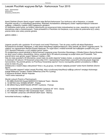 Piechowice Leszek Pluciñski wygrywa Ba³tyk- Karkonosze Tour 2015 Autor: Administrator 29.05.2015. Zmieniony 29.06.2015. Kamil Zieliñski (Domin Sport) wygra³ ostatni etap Ba³tyk-Karkonosze Tour koñcz±cy siê w Karpaczu, a Leszek Pluciñski zwyciê¿y³ w klasyfikacji generalnej. Radoslav Konstantinov (Martigues) zosta³ najaktywniejszym kolarzem wy¶cigu, a Maksym Vasiliev (ISD) najlepszym góralem! W niedzielne popo³udnie, po krótkim odpoczynku po porannej je¼dzie indywidualnej na czas, zawodnicy ruszyli na 82 kilometrowy etap w Karkonoszach. Trasa prowadzi³a z Piechowic do Karpacza, a po drodze do pokonania by³y cztery premie lotne oraz cztery premie górskie. galeria zdjêæ » ¦ciganie zaczê³o siê o godzinie 16 od trzech rund wokó³ Piechowic. Tam do pracy wziê³a siê ekipa Radoslava Konstantinova – Martigues, a wiêc lidera klasyfikacji najaktywniejszych, który jednak nie zdo³a³ wygraæ premii. Tê odebra³ mu reprezentant Maroka Essaid Abelouae. Po wyje¼dzie z miasta kontrolê nad wy¶cigiem przejê³a dru¿yna CCC Sprandi Polkowice, a ca³y peleton jecha³ razem. Po przejechaniu premii górskiej w Micha³owicach wygranej przez Dominika Oborskiego z Whistle Eskom Ziemia Brzeska, do akcji ruszy³o piêciu zawodników, którzy uzyskali oko³o 50 sekund przewagi na podje¼dzie pod Przesiekê. Tam premiê lotn± oraz górsk± wygra³ Maksym Vasiliev z ISD. Gdy do mety pozosta³o 25 kilometrów, przed met± do pi±tki dojecha³ kolejny kolarz, a ucieczka utrzymywa³a przewagê w okolicach 35 sekund. W Kowarach praca ekip CCC i reprezentacji Kazachstanu pozwoli³a g³ównej grupie dogoniæ harcowników. Na premiê górsk± na Prze³êczy Kowarskiej wjecha³ mocno rozci±gniêty peleton prowadzony w³a¶nie przez te dwie dru¿yny. Ostatecznie o losach etapu zdecydowa³ finisz z du¿ej grupy, na którym najlepiej poradzi³ sobie Kamil Zieliñski (Domin Sport). ¯ó³t± koszulkê zapewni³ sobie Leszek Pluciñski, który w koñcowej klasyfikacji wy¶cigu pokona³ swojego klubowego kolegê Mateusza Taciaka i Petera WIlliamsa (One Pro Cycling). Z Karpacza – Micha³ Kapusta ¬ród³o www.naszosie.pl Wyniki Lotnych Premii w Piechowicach: 1. 80 ABELOUACHE Essaid MAROCCO National Team - Maroko 2. 10 DETKO Artur DOMIN SPORT - Polska 3. 98 GRAS Ramy MARTIGUES SPORT Cyclisme - Francja 1. 104 NYBORG BROGE Nils Lau RANDERS Cykleklub AF 1910 - Dania 2. 54 VASILYEV Maksym ISD Continental Team - Ukraina 3. 147 HEIDER Johannes UR-KROSITZER Giant - Niemcy komunikat koñcowy z wy¶cigu » http://old.piechowice.pl Kreator PDF Utworzono 3 March, 2017, 15:01