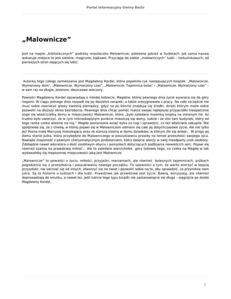 Portal Informacyjny Gminy Boćki „Malownicze” Jest na mapie „bibliotecznych” podróży miasteczko Malownicze, położone gdzieś w Sudetach. Jak sama nazwa wskazuje miejsce to jest sielskie, magiczne, bajkowe. Przyciąga do siebie „malowniczych” ludzi – nietuzinkowych, od pierwszych stron dających się lubić. Autorką tego całego zamieszania jest Magdalena Kordel, która popełniła cyk następujących książek: „Malownicze. Wymarzony dom”, „Malownicze. Wymarzony czas”, „Malownicze. Tajemnica bzów” i „Malownicze. Wymarzony czas” – w sam raz na długie, jesienne, deszczowe wieczory. Powieści Magdaleny Kordel opowiadają o młodej kobiecie, Magdzie, której pewnego dnia życie wywraca się do góry nogami. W ciągu jednego dnia rozpadł się jej dwuletni związek, a także zrezygnowała z pracy. Na całe szczęście nie musi sobie zawracać głowy kwestią pieniędzy, gdyż na jej koncie znajdują się środki, dzięki którym może sobie pozwolić na dłuższy okres bezrobocia. Pewnego dnia chcąc pomóc matce swojej najlepszej przyjaciółki nieopatrznie staje się właścicielką domu w miejscowości Malownicze, które „było zaledwie maleńką kropką na zielonym tle. Aż trudno było uwierzyć, że w tym mikroskopijnym punkcie mieszczą się domy, ludzie i że stoi tam budynek, który od tego ranka czeka właśnie na nią.” Magda postanawia wziąć byka za rogi i sprawdzić, co też właściwie zakupiła. Nie spodziewa się, że z chwilą, w której pojawi się w Malowniczem odmieni się całe jej dotychczasowe życie. Ale nie tylko jej! Pozna małą Marcysię mieszkającą wraz ze starszą siostrą w domu dziadków, w którym źle się dzieje… W progu jej domu stanie Julka, która przybędzie do Malowniczego w poszukiwaniu prawdy na temat przeszłości swojego ojca. Nawiąże znajomość z pewnym charyzmatycznym proboszczem, który święcie wierzy w swój nieodparty urok osobisty. Zdobędzie nawet adoratora o dość osobliwym obyciu i pomysłach dotyczących podbijania niewieścich serc. Pojawi się również szansa na prawdziwą miłość… Ale to zaledwie wierzchołek góry lodowej tego, co czeka na Magdę w tak wydawałoby się niepozornej miejscowości jaką jest Malownicze. „Malownicze” to powieści o życiu, miłości, przyjaźni, marzeniach, ale również bolesnych tajemnicach, próbach pogodzenia się z przeszłością i poszukiwaniu nowego początku. To opowieści o tym, że warto wierzyć w lepszą przyszłość, nie odcinać się od innych, otworzyć się na świat i pozwolić sobie na to, aby sprawdzić, co przyniesie nam jutro. Są to historie o ludziach i dla ludzi. Prawdziwe jak prawdziwe jest życie. Bawią, wzruszają, ale również doprowadzają do smutku, a nawet łez. Jeśli lubicie tego typu książki nie zastanawiajcie się długo – sięgnijcie po dzieła Magdaleny Kordel. 1