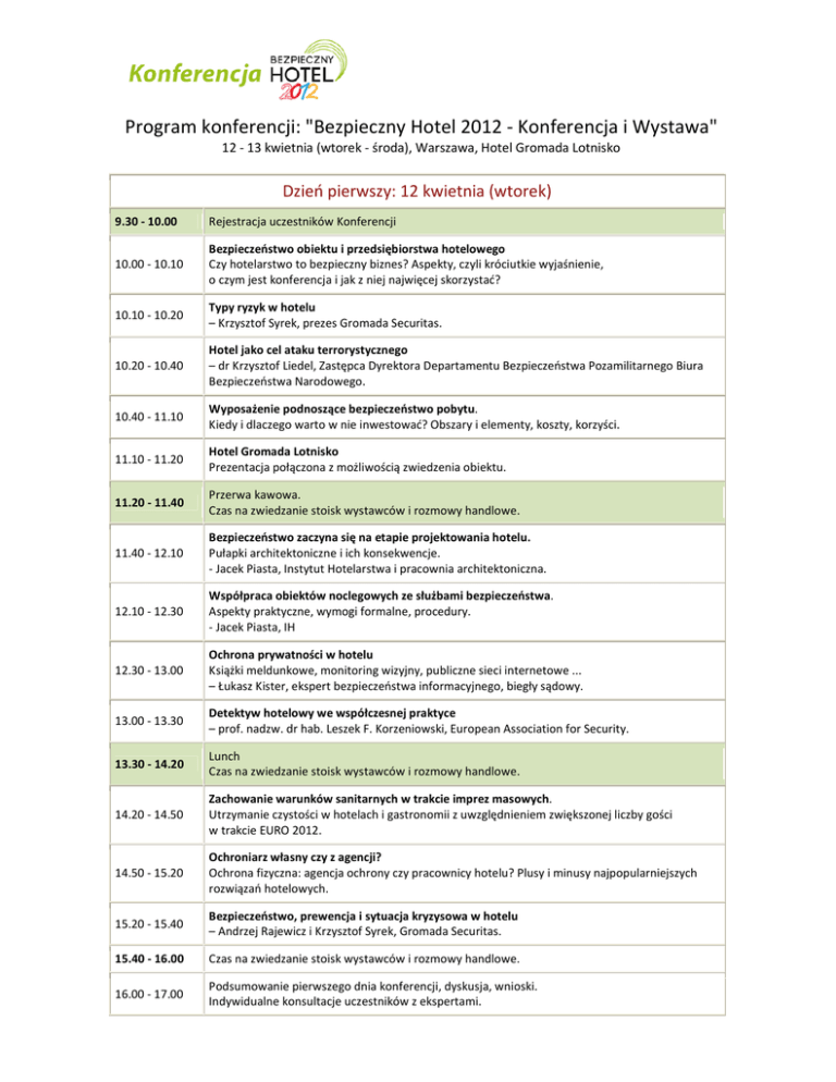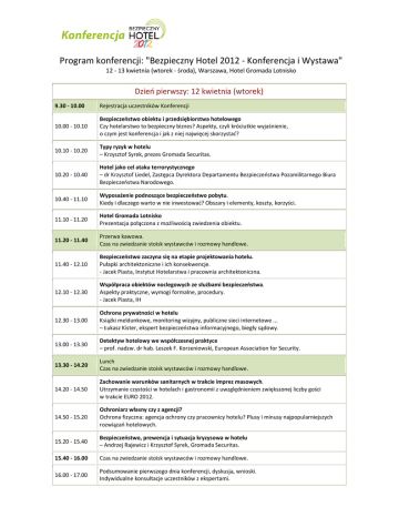 Program konferencji: "Bezpieczny Hotel 2012 - Konferencja i Wystawa" 12 - 13 kwietnia (wtorek - środa), Warszawa, Hotel Gromada Lotnisko Dzień pierwszy: 12 kwietnia (wtorek) 9.30 - 10.00 Rejestracja uczestników Konferencji 10.00 - 10.10 Bezpieczeństwo obiektu i przedsiębiorstwa hotelowego Czy hotelarstwo to bezpieczny biznes? Aspekty, czyli króciutkie wyjaśnienie, o czym jest konferencja i jak z niej najwięcej skorzystać? 10.10 - 10.20 Typy ryzyk w hotelu – Krzysztof Syrek, prezes Gromada Securitas. 10.20 - 10.40 Hotel jako cel ataku terrorystycznego – dr Krzysztof Liedel, Zastępca Dyrektora Departamentu Bezpieczeństwa Pozamilitarnego Biura Bezpieczeństwa Narodowego. 10.40 - 11.10 Wyposażenie podnoszące bezpieczeństwo pobytu. Kiedy i dlaczego warto w nie inwestować? Obszary i elementy, koszty, korzyści. 11.10 - 11.20 Hotel Gromada Lotnisko Prezentacja połączona z możliwością zwiedzenia obiektu. 11.20 - 11.40 Przerwa kawowa. Czas na zwiedzanie stoisk wystawców i rozmowy handlowe. 11.40 - 12.10 Bezpieczeństwo zaczyna się na etapie projektowania hotelu. Pułapki architektoniczne i ich konsekwencje. - Jacek Piasta, Instytut Hotelarstwa i pracownia architektoniczna. 12.10 - 12.30 Współpraca obiektów noclegowych ze służbami bezpieczeństwa. Aspekty praktyczne, wymogi formalne, procedury. - Jacek Piasta, IH 12.30 - 13.00 Ochrona prywatności w hotelu Książki meldunkowe, monitoring wizyjny, publiczne sieci internetowe ... – Łukasz Kister, ekspert bezpieczeństwa informacyjnego, biegły sądowy. 13.00 - 13.30 Detektyw hotelowy we współczesnej praktyce – prof. nadzw. dr hab. Leszek F. Korzeniowski, European Association for Security. 13.30 - 14.20 Lunch Czas na zwiedzanie stoisk wystawców i rozmowy handlowe. 14.20 - 14.50 Zachowanie warunków sanitarnych w trakcie imprez masowych. Utrzymanie czystości w hotelach i gastronomii z uwzględnieniem zwiększonej liczby gości w trakcie EURO 2012. 14.50 - 15.20 Ochroniarz własny czy z agencji? Ochrona fizyczna: agencja ochrony czy pracownicy hotelu? Plusy i minusy najpopularniejszych rozwiązań hotelowych. 15.20 - 15.40 Bezpieczeństwo, prewencja i sytuacja kryzysowa w hotelu – Andrzej Rajewicz i Krzysztof Syrek, Gromada Securitas. 15.40 - 16.00 Czas na zwiedzanie stoisk wystawców i rozmowy handlowe. 16.00 - 17.00 Podsumowanie pierwszego dnia konferencji, dyskusja, wnioski. Indywidualne konsultacje uczestników z ekspertami. WIECZÓR DNIA PIERWSZEGO: 20.00 - 22.00 Wieczór klubowy Co robić w przerwie pomiędzy piłkarskimi spotkaniami? Propozycje agencji eventowych na zagospodarowanie czasu wolnego na przykładzie „zagospodarowania” wieczoru – Centrum Eventów. Dzień drugi: 13 kwietnia (środa) 8.30 - 9.00 Rejestracja uczestników Konferencji 9.00 - 10.00 Rola i zadania hoteli w zarządzaniu kryzysowym – płk dr Bogusław Szlachcic, Centrum Badań nad Terroryzmem Collegium Civitas. Scenariusze nienapisane – jak hotel powinien być przygotowany na sytuacje, które w teorii zdarzyć się nie mogą np. przekształcenie hotelu w prowizoryczny szpital, współpraca ze służbami medycznymi i ratowniczymi. Warsztaty z udziałem przedstawicieli służb mundurowych. 10.00 - 10.30 Jak zabezpieczyć się przed nieuczciwymi klientami i kontrahentami? Umowy, instrukcje, procedury. Omówienie niezbędnych aspektów dla głównych typów klientów obiektów hotelowych. – Jacek Piasta, JP Doradztwo. 10.30 - 11.00 Bezpieczeństwo SPA Bezpieczeństwo gościa a odpowiedzialność prowadzących obiekty SPA & Wellness – Joanna Kordasiewicz, Projekt Hotel Sp. z o.o. 11.00 - 11.20 Hotel przyjazny dziecku i rodzinie. Co i jak przygotować, by obiekt był bezpieczny i przyjazny dla rodzin z dziećmi? 11.20 - 11.40 Przerwa kawowa. Czas na zwiedzanie stoisk wystawców i rozmowy handlowe. 11.40 - 12.10 Jak zabezpieczyć się przed nielojalnością i nieuczciwością pracowników, współpracowników i kontrahentów biznesowych w branży hotelarskiej? - Bartosza Pastuszka, Dyrektor Zarządzający IBBC Group, Koordynator Projektu EtycznaLinia.pl 12.10 - 12.40 Kradzież i włamanie – drobne, ale uciążliwe przestępstwa w hotelach. Które przypadki zgłaszać organom ścigania, które - postępując zgodnie z prawem - można rozwiązać własnymi środkami? 12.40 - 13.00 Terroryzm z talerza. Jakiego menu unikać, by przy większym niż zwykle ruchu w zakładzie gastronomicznym uniknąć zatrucia. 13.00 - 13.30 Lunch. Czas na zwiedzanie stoisk wystawców i rozmowy handlowe. 13.30 - 14.00 Ubezpieczenia w hotelarstwie 14.00 - 14.20 Audyt bezpieczeństwa a prawidłowe funkcjonowanie hotelu 14.20 - 14.50 Bezpieczeństwo pożarowe w hotelach, motelach i pensjonatach. Lista kontrolna – element wspomagania zarządzania ochroną przeciwpożarową. 14.50 - 16.00 Czas na rozmowy kuluarowe. Porady ekspertów. Biznes mixer. Zwiedzanie stoisk. Zakończenie konferencji Szczegóły i informacje: www.e-hotelarstwo.com/konferencja_2010/bezpieczny_hotel_2012 Tel.: 22 478 28 70 lub 606 207 270