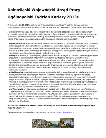 Dolnośląski Wojewódzki Urząd Pracy Ogólnopolski Tydzień Kariery 2013r. W dniach 14-20.10.2013r. odbyła się V edycja Ogólnopolskiego Tygodnia Kariery-imprezy zainicjowanej przez Stowarzyszenie Doradców Szkolnych i Zawodowych, w tym roku pod hasłem „ Odkryj talenty swojego dziecka”. Inicjatywa ta skierowana jest zarówno do zainteresowanych uczniów i ich rodziców, studentów, osób dorosłych bezrobotnych i zatrudnionych. Doradcy zawodowi z Centrów Informacji i Planowania Kariery Zawodowej DWUP uczestniczą w OTK od jego pierwszej edycji. W tym roku zorganizowali ponad 30 imprez, do najciekawszych należały: ● ● ● ● w Jeleniej Górze: warsztaty uczniów z klas o profilach kucharz i hotelarz z Zespołu Szkół i Placówek. Celem zajęć było odkrywanie talentów młodzieży, obserwacja i poznanie ról pełnionych w zespole oraz pobudzenie do kreatywnego, twórczego podejścia do zadania, stymulacja wyobraźni. Uczniowie w trakcie zadania mieli możliwość doskonalenia umiejętności rozwiązywania problemów jak również rozwijania umiejętności improwizacji i wchodzenia w role. w Legnicy: IV edycja „Gry Miejskiej” pod hasłem „Kariera w Legnicy” będąca rywalizacją pomiędzy drużynami legnickich szkół. Motywem przewodnim był Festiwal Talentów. Uczestnicy Gry wykonywali zadania pozwalające wykorzystać wiedzę, ale także umiejętności i różnorodne talenty. Zgromadzona publiczność mogła podziwiać popisy wokalne, kulinarne, gimnastyczne, taneczne, żonglerskie, monocyklingowe oraz sztuk walki. W zamian za prezentacje talentów, publiczność zaprezentowała istny festiwal radości, kolorów i dźwięków podczas zaciętego dopingu swoich koleżanek i kolegów. w Wałbrzychu: dwa niekonwencjonalne wydarzenia, których oryginalność wynikała ze spotkania niezwykłych kobiet, obdarzonych wieloma talentami. Pierwsze warsztaty zgromadziły osoby bezrobotne, obdarzone zmysłem artystycznym i zdolnościami manualnymi, które zaprezentowały swoje prace m.in. piękną biżuterię, zaprojektowane przez siebie unikalne ubrania, czy papierowe fantazje z wykorzystaniem techniki origami. Uczestniczki miały okazję zapoznać się i wypróbować metodę haftu wstążeczkowego. Drugi warsztat zgromadził miłośniczki malarstwa, które próbowały swoich sił, malując farbami na tkaninach oraz pastelami. we Wrocławiu: wystawa prac plastycznych osadzonych w Zakładzie Karnym nr 1 we Wrocławiu, wykonywanych różnymi technikami ; olejem, akrylem, pastelami. Malowano kopie dzieł znanych artystów: da Vinci, Rembrandta, Vermeera, np. „Mona Lisa”, „Saskia jako Flora”, „Dziewczyna z perłą”, jak również tworzono własne kompozycje. Z dużym zainteresowaniem wystawę prac obejrzeli pracownicy DWUP, a także studenci Uniwersytetu Wrocławskiego oraz Dolnośląskiej Szkoły Wyższej we Wrocławiu. Wszystkim partnerom serdecznie dziękujemy za współpracę w ramach Ogólnopolskiego Tygodnia Kariery. Zainteresowanych szczegółami zapraszamy na stronę : www.ciipkz.dwup.pl