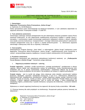 Tyczyn, 02.01.2015 roku ZAPYTANIE OFERTOWE NR 70/RTRP/SC/2015 NAORGANIZACJĘ KONFERENCJI NAUKOWEJ POD NAZWĄ „ PODKARPACKIE FORUM BIZNESU W DOLINIE STRUGU” 1. Zamawiający Regionalne Towarzystwo Rolno-Przemysłowe „Dolina Strugu”. ul. Myśliwska 16, 36-030 Błażowa. Osoba upoważniona przez Zamawiającego do bieżących kontaktów, w tym udzielania odpowiedzi na zapytania oferentów: Przemysław Grzebyk- 17 2305 577. 2. Tryb udzielenia zamówienia Zamawiający realizując niniejsze postępowanie nie jest zobowiązany stosować przepisów ustawy Prawo zamówień publicznych. W celu zapewnienia wydatkowania przyznanych środków w sposób celowy i oszczędny, z zachowaniem zasady terminowego uzyskiwania najlepszych efektów z danych nakładów oraz zasady uczciwej konkurencji, transparentności i równego traktowania potencjalnych wykonawców niniejsze postępowanie toczy się w oparciu o zasadę konkurencyjności – tj. skierowania zapytania ofertowego o identycznej treści do co najmniej 3 oferentów. 3. Tytuł projektu Wieloaspektowy Program Rozwoju „Sami Sobie” w mikroregionie „Dolina Strugu”,realizowany przez Regionalne Towarzystwo Rolno–Przemysłowe „Dolina Strugu”, współfinansowany przez Szwajcarię w ramach szwajcarskiego programu współpracy z nowymi krajami członkowskimi Unii Europejskiej. 4. Przedmiot zamówienia Przedmiotem zamówienia jest organizacja jednodniowej konferencji naukowej Forum Biznesu w Dolinie Strugu”. Zamawiana usługa obejmuje: I. pn. „Podkarpackie Degustacja produktów lokalnych – catering. Produkt regionalny - produkty i środki żywnościowe „znanego pochodzenia”, produkowane w danym regionie, których jakość jest zdecydowanie wyższa od przeciętnej. Cechą charakterystyczną tych produktów jest to, iż proces wytwarzania, przetwarzania i prezentacji odbywa się na obszarze powiązanym z danym produktem lub też jedna z faz produkcji ma miejsce w regionie pochodzenia. Produkt lokalny – jest to wyrób lub usługa, która obejmuje wiele dziedzin wytwórczości ludzkiej [kulinaria, rękodzieło, rzemiosło i działalność artystyczną, w tym m.in.: wikliniarstwo, bibułkarstwo, bukieciarstwo haft, szydełkarstwo, koronkarstwo, rzeźbę, malarstwo, poezję, wyroby z drewna (w tym zabawki), wyroby ze sznurka, wyroby ze słomy, szycie strojów ludowych]. Produkt lokalny jest ściśle związany z danym regionem geograficznym, jest to wyrób lub usługa, z którą utożsamiają się mieszkańcy regionu, produkowany w sposób niemasowy i przyjazny dla środowiska, z surowców lokalnie dostępnych. Wykonawca w ramach organizacji konferencji ma zapewnić dla łącznej liczby uczestników- 100 osób: 1.1 Przerwę kawową dla osób przybyłych na konferencję. Poczęstunek podczas przerwy kawowej ma obejmować : DOLINA S TR UGU Regionalne Towarzystwo Rolno-Przemysłowe „Dolina Strugu” ul. Myśliwska 16; 36-030 Błażowa Tel.: +48 17 230 55 77 Fax :+48 17 230 12 10 e-mail: [email protected] www.dolinastrugu.pl Strona 1 z 19 kawę, herbatę, wodę mineralną butelkowaną 0,33/na osobę, śmietankę do kawy, cytryna, cukier,ciastka 3 rodzaje po 100 g każdego rodzaju na osobę 1.2 Stół lokalnych produktów w formie degustacji Potrawy powinny być przygotowane przez lokalnych wykonawców z Doliny Strugu według receptur wybranych przez Zamawiającego zawartych w publikacji pt. „Kuchnia Doliny Strugu” wydanej przez Stowarzyszenie „Lider Dolina Strugu” ( przepisy - załącznik nr 4) 1.3 Poczęstunek w formie obiadu dla wszystkich osób uczestniczących w konferencji składający się z następującego menu: zupa tradycyjna, (np. rosół, zupa krem), 350 ml na osobę; ciepłe danie obiadowe, (ziemniaki 250 g na osobę, mięso schab/drób 150 g na osobę); surówki / sałatki: 3 rodzaje, po 150 g każdego rodzaju na osobę; sok 0,33/na osobę , 1.4 Poczęstunek podczas przerwy kawowej, stół lokalnych produktów oraz poczęstunek w formie obiadu łącznie powinien mieścić się w limicie do 65 zł brutto/osobę 1.5 Wykonawca zapewnia również: przygotowanie stołów (naczynia, nakrycia, serwetki ) uzupełnianie poczęstunku w trakcie trwania konferencji sprzątanie brudnych naczyń po zakończeniu konferencji obecność personelu do obsługi na miejscu odbywającej się konferencji 1.6 Wykonawca powinien prowadzić działalność na terenie Doliny Strugu spełniającą wymogi sanepidu. Kryterium to będzie weryfikowane przez Zamawiającego na podstawie podpisanego przez Wykonawcę oświadczenia stanowiące załącznik nr 2. II. Wynajem Sali konferencyjnej wraz z wyposażeniem. Lokalizacja obiektu z salą konferencyjną powinna się znajdować na terenie Doliny Strugu tj. gmin Błażowa, Chmielnik, Hyżne i Tyczyn. Sala konferencyjna, w której będzie się odbywała konferencja powinna być odpowiednia dla tego rodzaju imprez (z dostępem w budynku do sanitariatów o wysokim standardzie wyposażenia i utrzymania). Wykonawca zapewni : - nagłośnienie (dwa mikrofony), - sprzęt do prezentacji wykładów (projektor podłączony do komputera, tablica do projekcji), - ilość miejsc siedzących dla uczestników : 100 miejsc. - szatnię z obsługą, obsługę recepcji konferencji, z miejscem (stolikiem) do rejestracji uczestników, i dystrybucji materiałów (w recepcji stale powinna znajdować się min. 1 osoba). Wykonawca zapewni (z dostarczonych materiałów przez zamawiającego) i wyłoży w recepcji lub przed salą konferencyjną listę uczestników, na której swoje podpisy składać będą przybyli na konferencję uczestnicy. III. Zabezpieczenie miejsc parkingowych dla uczestników konferencji. - zabezpieczenie minimum 50 miejsc parkingowych. - zarówno dojazd od drogi głównej jak i parking powinny być odśnieżone. DOLINA S TR UGU Regionalne Towarzystwo Rolno-Przemysłowe „Dolina Strugu” ul. Myśliwska 16; 36-030 Błażowa Tel.: +48 17 230 55 77 Fax :+48 17 230 12 10 e-mail: [email protected] www.dolinastru