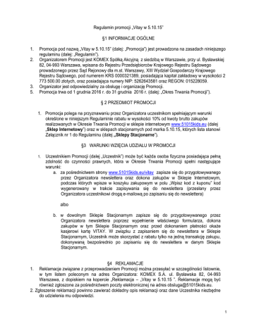 Regulamin promocji „Vitay w 5.10.15” §1 INFORMACJE OGÓLNE 1. 2. 3. 5. Promocja pod nazwą „Vitay w 5.10.15” (dalej: „Promocja”) jest prowadzona na zasadach niniejszego regulaminu (dalej: „Regulamin”). Organizatorem Promocji jest KOMEX Spółką Akcyjną z siedzibą w Warszawie, przy ul. Bysławskiej 82, 04-993 Warszawa, wpisana do Rejestru Przedsiębiorców Krajowego Rejestru Sądowego prowadzonego przez Sąd Rejonowy dla m.st. Warszawy, XIII Wydział Gospodarczy Krajowego Rejestru Sądowego, pod numerem KRS 0000321389, posiadająca kapitał zakładowy w wysokości 2 773 500.00 złotych, oraz posiadająca numery NIP: 5262643581 oraz REGON: 015228059. Organizator jest odpowiedzialny za obsługę i organizację Promocji. Promocja trwa od 1 grudnia 2016 r. do 31 grudnia 2016 r. (dalej: „Okres Trwania Promocji”). § 2 PRZEDMIOT PROMOCJI 1. Promocja polega na przyznawaniu przez Organizatora uczestnikom spełniającym warunki określone w niniejszym Regulaminie rabatu w wysokości 10% od kwoty brutto zakupów realizowanych w Okresie Trwania Promocji w sklepie internetowym www.51015kids.eu (dalej „Sklep Internetowy”) oraz w sklepach stacjonarnych pod marka 5.10.15, których lista stanowi Załącznik nr 1 do Regulaminu (dalej „Sklepy Stacjonarne”). §3 WARUNKI WZIĘCIA UDZIAŁU W PROMOCJI 1. Uczestnikiem Promocji (dalej „Uczestnik”) może być każda osoba fizyczna posiadająca pełną zdolność do czynności prawnych, która w Okresie Trwania Promocji spełni następujące warunki: a. za pośrednictwem strony www.51015kids.eu/vitay zapisze się do przygotowywanego przez Organizatora newslettera oraz dokona zakupów w Sklepie Internetowym, podczas których wpisze w koszyku zakupowym w polu „Wpisz kod z kuponu” kod wygenerowany w trakcie zapisywania się do newslettera (przesłany przez Organizatora uczestnikowi drogą e-mailową po zapisaniu się do newslettera) albo b. w dowolnym Sklepie Stacjonarnym zapisze się do przygotowywanego przez Organizatora newslettera poprzez wypełnienie właściwego formularza, dokona zakupów w tym Sklepie Stacjonarnym oraz przed dokonaniem płatności okaże kasjerowi kartę VITAY. W związku z zapisaniem się do newslettera w Sklepie Stacjonarnym, Uczestnik może skorzystać z rabatu tylko na jedną transakcję zakupu, dokonywaną bezpośrednio po zapisaniu się do newslettera w danym Sklepie Stacjonarnym. §4 REKLAMACJE Reklamacje związane z przeprowadzeniem Promocji można przesyłać w szczególności listownie, w tym listem poleconym na adres Organizatora: KOMEX S.A. ul. Bysławska 82, 04-993 Warszawa, z dopiskiem na kopercie „Reklamacja – „Vitay w 5.10.15 ”. Reklamacje mogą być również zgłoszone za pośrednictwem poczty elektronicznej na adres [email protected]. 2. Zgłoszenie reklamacji powinno zawierać dokładny opis reklamacji oraz dane Uczestnika niezbędne do udzielenia mu odpowiedzi. 1. 1 3. Reklamacje będą rozpatrywane przez Organizatora w terminie 14 dni od daty ich otrzymania. Organizator rozpatrując reklamację stosować będzie postanowienia niniejszego Regulaminu. O decyzji Organizatora Uczestnik Promocji zostanie powiadomiony emailem (o ile będzie podany) albo rejestrowaną przesyłką pocztową lub kurierską. §5 PRZETWARZANIE DANYCH OSOBOWYCH 1. Administratorem danych osobowych Uczestników Promocji jest Organizator. Organizator przetwarza dane osobowe zgodnie z ustawą z dnia 29 sierpnia 1997 r. o ochronie danych osobowych (t.j. Dz.U. z 2016 r., poz. 922) w celu przeprowadzenia Promocji. Podanie danych osobowych przez Uczestników Promocji jest dobrowolne, aczkolwiek niezbędne do skorzystania z Promocji, w celu rozpatrzenia ewentualnych reklamacji dotyczących przebiegu Promocji lub wyjaśnienia wątpliwości związanych z warunkami udziału w Promocji. Uczestnicy mają prawo do wglądu do swoich danych osobowych oraz do ich poprawiania. Korespondencja dotycząca danych osobowych powinna być kierowana na adres: [email protected]. z dopiskiem „Dane Osobowe”. §6 POSTANOWIENIA KOŃCOWE 1. Treść Regulaminu jest dostępna na stronie internetowej www.51015kids.eu. 2. Do procedury składania i realizowania zamówień w Sklepie Internetowym stosuje się Regulamin korzystania ze Sklepu Internetowego który jest dostępny na stronie internetowej: http://www.51015kids.eu/regulamin-serwisu. 3. W kwestiach nieuregulowanych niniejszym Regulaminem zastosowanie znajdują postanowienia prawa powszechnie obowiązującego. 2 Załącznik nr 1 do Regulaminu Promocji „Vitay w 5.10.15” SKLEP ULICA KOD POCZTOWY MIASTO KRAKÓW CH KROKUS al. T. Bora-Komorowskiego 37 31-876 KRAKÓW WARSZAWA CH WILEŃSKA ul. Targowa 72 03-734 WARSZAWA CZĘSTOCHOWA CH AUCHAN ul. Krakowska 10 42-262 POCZESNA BYDGOSZCZ GEANT ul. Kruszwicka 1 85-213 BYDGOSZCZ POZNAŃ CH AUCHAN KOMORNIKI ul. Głogowska 432 60-004 POZNAŃ MIKOŁÓW CH AUCHAN ul. Gliwicka 3 43-190 MIKOŁÓW WARSZAWA CH ARKADIA al. Jana Pawła II 82 00-175 WARSZAWA WARSZAWA CH KING CROSS PRAGA ul. Jubilerska 1/3 04-190 WARSZAWA SZCZECIN CH TURZYN al. Bohaterów Warszawy 42 70-342 SZCZECIN WARSZAWA CH JANKI ul. Mszczonowska 3 05-090 JANKI POZNAŃ CH PLAZA ul. Kaspra Drużbickiego 2 61-693 POZNAŃ KRASNE CH AUCHAN K. RZESZOWA Krasne 20b 36-007 KRASNE PUŁAWY GALERIA ZIELONA ul. Lubelska 2 24-100 PUŁAWY KONIN GALERIA NAD JEZIOREM ul. Paderewskiego 8 62-510 KONIN WARSZAWA CH WOLA PARK ul. Górczewska 124 01-460 WARSZAWA WARSZAWA CH TARGÓWEK ul. Głębocka 15 03-287 WARSZAWA WAŁBRZYCH TESCO ul. Łączyńskiego 44 58-310 SZCZAWNO-ZDRÓJ DĘBICA CH RAJ ul. Rzeszowska 114 39-200 DĘBICA RACIBÓRZ CH AUCHAN ul. Rybnicka 97 47-400 RACIBÓRZ GŁOGÓW GALERIA GŁOGÓW ul. Ks. Józefa Poniatowskiego 12 67-200 GŁOGÓW SOSNOWIEC CH AUCHAN ul. Zuzanny 20 41-200 SOSNOWIEC RZESZÓW CH TESCO al. Powstańców Warszawy 13 35-329 RZESZÓW GDAŃSK CH ALFA ul. Kołobrzeska 41c 80-391 GDAŃSK KWIDZYN GALERIA HANDLOWA KOPERNIK ul. Kopernika 25a 82-500 KWIDZYN GORZÓW WIELKOPOL