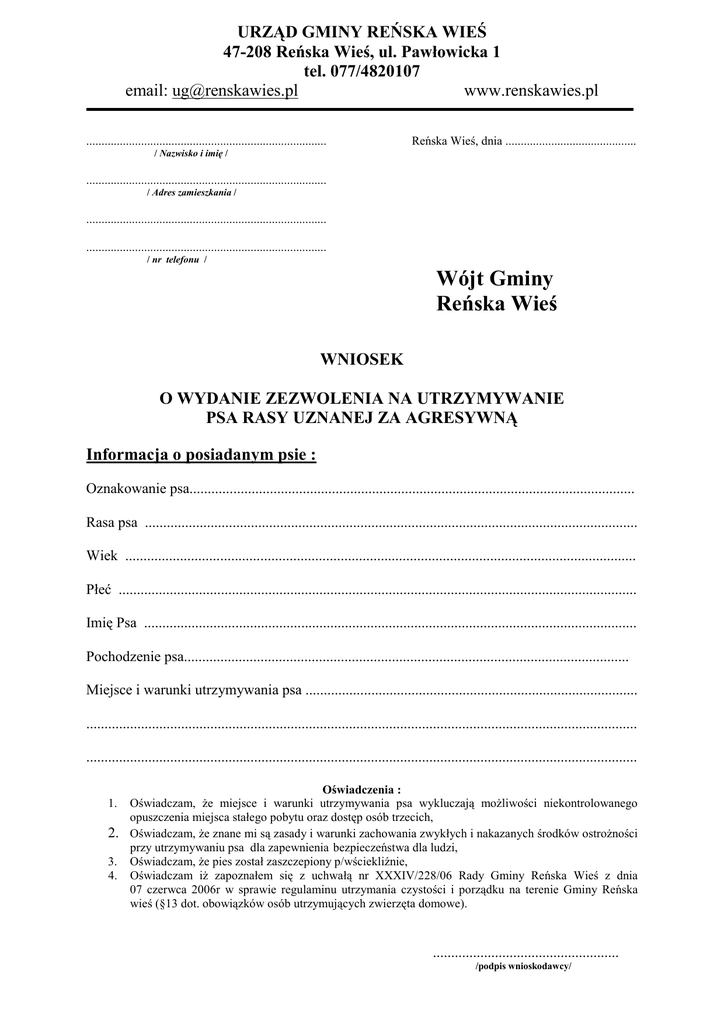 URZĄD GMINY REŃSKA WIEŚ 47-208 Reńska Wieś, ul. Pawłowicka 1 tel. 077/4820107 email: [email protected] www.renskawies.pl ............................................................................... Reńska Wieś, dnia ........................................... / Nazwisko i imię / ............................................................................... / Adres zamieszkania / ............................................................................... ............................................................................... / nr telefonu / Wójt Gminy Reńska Wieś WNIOSEK O WYDANIE ZEZWOLENIA NA UTRZYMYWANIE PSA RASY UZNANEJ ZA AGRESYWNĄ Informacja o posiadanym psie : Oznakowanie psa.......................................................................................................................... Rasa psa ....................................................................................................................................... Wiek ............................................................................................................................................ Płeć .............................................................................................................................................. Imię Psa ....................................................................................................................................... Pochodzenie psa.......................................................................................................................... Miejsce i warunki utrzymywania psa ........................................................................................... ....................................................................................................................................................... ....................................................................................................................................................... 1. 2. 3. 4. Oświadczenia : Oświadczam, Ŝe miejsce i warunki utrzymywania psa wykluczają moŜliwości niekontrolowanego opuszczenia miejsca stałego pobytu oraz dostęp osób trzecich, Oświadczam, Ŝe znane mi są zasady i warunki zachowania zwykłych i nakazanych środków ostroŜności przy utrzymywaniu psa dla zapewnienia bezpieczeństwa dla ludzi, Oświadczam, Ŝe pies został zaszczepiony p/wściekliźnie, Oświadczam iŜ zapoznałem się z uchwałą nr XXXIV/228/06 Rady Gminy Reńska Wieś z dnia 07 czerwca 2006r w sprawie regulaminu utrzymania czystości i porządku na terenie Gminy Reńska wieś (§13 dot. obowiązków osób utrzymujących zwierzęta domowe). ................................................... /podpis wnioskodawcy/ Zgodnie z Rozporządzeniem Ministra Spraw Wewnętrznych i Administracji z 28 kwietnia 2003r. w sprawie wykazu ras psów uznawanych za agresywne (Dz. U. Nr 77, poz. 687). wykaz ras psów uznawanych za agresywne obejmuje następujące rasy: 1) Amerykański pit bull terrier, 2) Perro de Presa Mallorquin, 3) Buldog amerykański, 4) Dog argentyński, 5) Perro de Presa Canario, 6) Tosa inu, 7) Rottweiler, 8) Akbash dog, 9) Anatolian karabash, 10) Moskiewski stróŜujący, 11) Owczarek kaukaski.