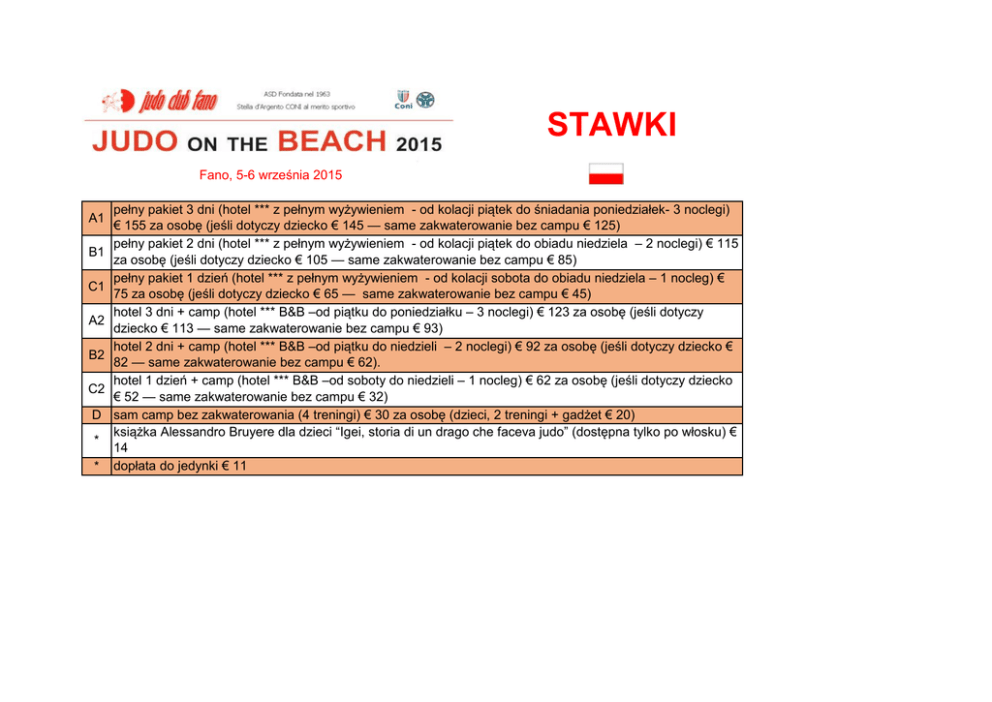 STAWKI Fano, 5-6 września 2015 A1 B1 C1 A2 B2 C2 D * * pełny pakiet 3 dni (hotel *** z pełnym wyżywieniem - od kolacji piątek do śniadania poniedziałek- 3 noclegi) € 155 za osobę (jeśli dotyczy dziecko € 145 — same zakwaterowanie bez campu € 125) pełny pakiet 2 dni (hotel *** z pełnym wyżywieniem - od kolacji piątek do obiadu niedziela – 2 noclegi) € 115 za osobę (jeśli dotyczy dziecko € 105 — same zakwaterowanie bez campu € 85) pełny pakiet 1 dzień (hotel *** z pełnym wyżywieniem - od kolacji sobota do obiadu niedziela – 1 nocleg) € 75 za osobę (jeśli dotyczy dziecko € 65 — same zakwaterowanie bez campu € 45) hotel 3 dni + camp (hotel *** B&B –od piątku do poniedziałku – 3 noclegi) € 123 za osobę (jeśli dotyczy dziecko € 113 — same zakwaterowanie bez campu € 93) hotel 2 dni + camp (hotel *** B&B –od piątku do niedzieli – 2 noclegi) € 92 za osobę (jeśli dotyczy dziecko € 82 — same zakwaterowanie bez campu € 62). hotel 1 dzień + camp (hotel *** B&B –od soboty do niedzieli – 1 nocleg) € 62 za osobę (jeśli dotyczy dziecko € 52 — same zakwaterowanie bez campu € 32) sam camp bez zakwaterowania (4 treningi) € 30 za osobę (dzieci, 2 treningi + gadżet € 20) książka Alessandro Bruyere dla dzieci “Igei, storia di un drago che faceva judo” (dostępna tylko po włosku) € 14 dopłata do jedynki € 11