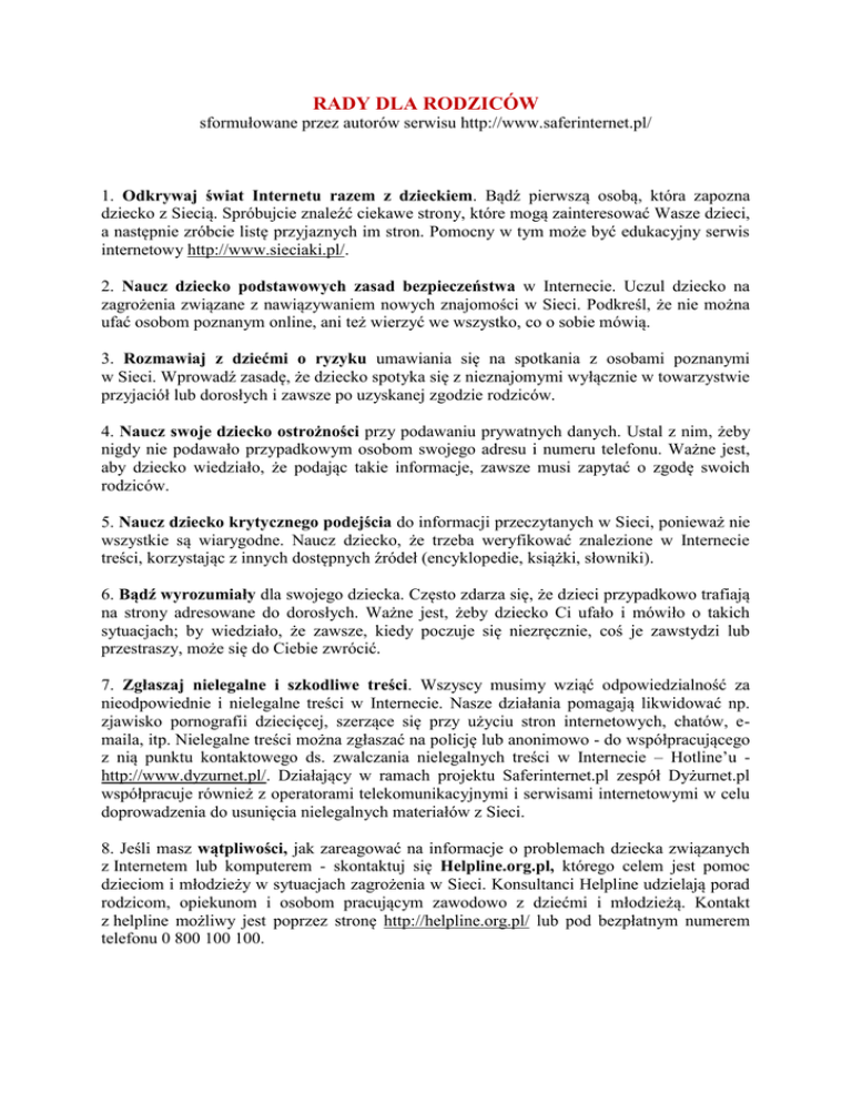 RADY DLA RODZICÓW sformułowane przez autorów serwisu http://www.saferinternet.pl/ 1. Odkrywaj świat Internetu razem z dzieckiem. Bądź pierwszą osobą, która zapozna dziecko z Siecią. Spróbujcie znaleźć ciekawe strony, które mogą zainteresować Wasze dzieci, a następnie zróbcie listę przyjaznych im stron. Pomocny w tym może być edukacyjny serwis internetowy http://www.sieciaki.pl/. 2. Naucz dziecko podstawowych zasad bezpieczeństwa w Internecie. Uczul dziecko na zagrożenia związane z nawiązywaniem nowych znajomości w Sieci. Podkreśl, że nie można ufać osobom poznanym online, ani też wierzyć we wszystko, co o sobie mówią. 3. Rozmawiaj z dziećmi o ryzyku umawiania się na spotkania z osobami poznanymi w Sieci. Wprowadź zasadę, że dziecko spotyka się z nieznajomymi wyłącznie w towarzystwie przyjaciół lub dorosłych i zawsze po uzyskanej zgodzie rodziców. 4. Naucz swoje dziecko ostrożności przy podawaniu prywatnych danych. Ustal z nim, żeby nigdy nie podawało przypadkowym osobom swojego adresu i numeru telefonu. Ważne jest, aby dziecko wiedziało, że podając takie informacje, zawsze musi zapytać o zgodę swoich rodziców. 5. Naucz dziecko krytycznego podejścia do informacji przeczytanych w Sieci, ponieważ nie wszystkie są wiarygodne. Naucz dziecko, że trzeba weryfikować znalezione w Internecie treści, korzystając z innych dostępnych źródeł (encyklopedie, książki, słowniki). 6. Bądź wyrozumiały dla swojego dziecka. Często zdarza się, że dzieci przypadkowo trafiają na strony adresowane do dorosłych. Ważne jest, żeby dziecko Ci ufało i mówiło o takich sytuacjach; by wiedziało, że zawsze, kiedy poczuje się niezręcznie, coś je zawstydzi lub przestraszy, może się do Ciebie zwrócić. 7. Zgłaszaj nielegalne i szkodliwe treści. Wszyscy musimy wziąć odpowiedzialność za nieodpowiednie i nielegalne treści w Internecie. Nasze działania pomagają likwidować np. zjawisko pornografii dziecięcej, szerzące się przy użyciu stron internetowych, chatów, emaila, itp. Nielegalne treści można zgłaszać na policję lub anonimowo - do współpracującego z nią punktu kontaktowego ds. zwalczania nielegalnych treści w Internecie – Hotline’u http://www.dyzurnet.pl/. Działający w ramach projektu Saferinternet.pl zespół Dyżurnet.pl współpracuje również z operatorami telekomunikacyjnymi i serwisami internetowymi w celu doprowadzenia do usunięcia nielegalnych materiałów z Sieci. 8. Jeśli masz wątpliwości, jak zareagować na informacje o problemach dziecka związanych z Internetem lub komputerem - skontaktuj się Helpline.org.pl, którego celem jest pomoc dzieciom i młodzieży w sytuacjach zagrożenia w Sieci. Konsultanci Helpline udzielają porad rodzicom, opiekunom i osobom pracującym zawodowo z dziećmi i młodzieżą. Kontakt z helpline możliwy jest poprzez stronę http://helpline.org.pl/ lub pod bezpłatnym numerem telefonu 0 800 100 100. 9. Zapoznaj dziecko z NETYKIETĄ – Kodeksem Dobrego Zachowania w Internecie. Przypominaj dzieciom o zasadach dobrego wychowania. Zasady Netykiety znajdziesz na stronie http://www.sieciaki.pl/. 10. Poznaj sposoby korzystania z Internetu przez Twoje dziecko. Przyglądnij się, jak Twoje dziecko korzysta z Internetu, jakie strony lubi oglądać i jak zachowuje się w Sieci. Staraj się poznać znajomych, z którymi dziecko koresponduje za pośrednictwem Internetu. Ustalcie zasady korzystania z Sieci (wzory Umów Rodzic-Dziecko znajdziesz na stronie http://www.sieciaki.pl/) oraz sposoby postępowania w razie nietypowych sytuacji. 11. Pamiętaj o zainstalowaniu programu filtrującego szkodliwe treści. Na stronie projektu Saferinternet.pl prezentujemy wyniki testów skuteczności programów filtrujących, wykonane przez NASK w ramach projektu Saferinternet.pl. Zapraszamy do zapoznania się z raportem "Jak skutecznie filtrować zawartość Internetu?". 12. Jeśli podejrzewasz, że zostało złamane prawo, powiadom policję. Nie usuwaj dowodów przestępstwa – nawet jeśli będzie to wulgarny lub nieprzyjemny list, bądź inny plik. 13. Jeśli sprawa wymaga przesłuchania dziecka, domagaj się możliwości skorzystania z tzw. niebieskiego pokoju (więcej informacji o procedurach związanych z udziałem dziecka w postępowaniu karnym można znaleźć na stronach Fundacji Dzieci Niczyje – http://www.fdn.pl/). 14. Jeśli stwierdzisz przypadek włamania lub próby włamania do swojego komputera, jesteś nękany spamem przesyłanym za pośrednictwem polskich serwerów lub atakami hackerów, zgłoś się do zespołu CERT Polska - http://www.cert.pl/