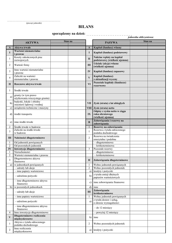 …………………………………………………………… (pieczęć jednostki) BILANS sporządzony na dzień: . . . . . . . . . . . . . . . . . . . . . . . . . . jednostka obliczeniowa: AKTYWA A I 1 2 3 4 Aktywa trwałe Wartości niematerialne i prawne Koszty zakończonych prac rozwojowych Wartość firmy Inne wartości niematerialne i prawne Zaliczki na wartości niematerialne i prawne II Rzeczowe aktywa trwałe 1 Środki trwałe grunty (w tym prawo użytkowania wieczystego gruntu) budynki, lokale i obiekty b) inżynierii lądowej i wodnej c) urządzenia techniczne i maszyny Stan na PASYWA A Kapitał (fundusz) własny I Kapitał (fundusz) podstawowy II III IV V VI Należne wpłaty na kapitał podstawowy (wielkość ujemna) Udziały (akcje) własne (wielkość ujemna) Kapitał (fundusz) zapasowy Kapitał (fundusz) z aktualizacji wyceny Pozostałe kapitały (fundusze) rezerwowe a) d) środki transportu e) inne środki trwałe 2 3 III Środki trwałe w budowie Zaliczki na środki trwałe w budowie Należności długoterminowe 1 2 IV 1 2 Od jednostek powiązanych Od pozostałych jednostek Inwestycje długoterminowe Nieruchomości Wartości niematerialne i prawne Długoterminowe aktywa 3 finansowe a) w jednostkach powiązanych – udziały lub akcje – inne papiery wartościowe – udzielone pożyczki – inne długoterminowe aktywa finansowe b) w pozostałych jednostkach – udziały lub akcje – inne papiery wartościowe – udzielone pożyczki 4 V 1 2 – inne długoterminowe aktywa finansowe Inne inwestycje długoterminowe Długoterminowe rozliczenia międzyokresowe Aktywa z tytułu odroczonego podatku dochodowego Inne rozliczenia międzyokresowe VII Zysk (strata) z lat ubiegłych VIII Zysk (strata) netto Odpisy z zysku netto w ciągu IX roku obrotowego (wielkość ujemna) Zobowiązania i rezerwy na B zobowiązania I Rezerwy na zobowiązania Rezerwa z tytułu odroczonego 1 podatku dochodowego Rezerwa na świadczenia 2 emerytalne i podobne – długoterminowa – krótkoterminowa 3 Pozostałe rezerwy – długoterminowe – krótkoterminowe II Zobowiązania długoterminowe 1 Wobec jednostek powiązanych 2 Wobec pozostałych jednostek a) kredyty i pożyczki z tytułu emisji dłużnych b) papierów wartościowych c) inne zobowiązania finansowe d) inne Zobowiązania III krótkoterminowe 1 Wobec jednostek powiązanych z tytułu dostaw i usług, a) o okresie wymagalności: – do 12 miesięcy – powyżej 12 miesięcy b) inne 2 Wobec pozostałych jednostek a) kredyty i pożyczki Stan na B Aktywa obrotowe I Zapasy 1 Materiały 2 3 Półprodukty i produkty w toku Produkty gotowe z tytułu emisji dłużnych papierów wartościowych c) inne zobowiązania finansowe z tytułu dostaw i usług, d) o okresie wymagalności: – do 12 miesięcy – powyżej 12 miesięcy 4 Towary e) zaliczki otrzymane na dostawy 5 Zaliczki na dostawy II Należności krótkoterminowe f) zobowiązania wekslowe z tytułu podatków, ceł, g) ubezpieczeń i innych świadczeń 1 a) b) 2 a) b) c) d) III 1 a) b) c) 2 IV Należności od jednostek powiązanych z tytułu dostaw i usług, o okresie spłaty: – do 12 miesięcy – powyżej 12 miesięcy inne Należności od pozostałych jednostek z tytułu dostaw i usług, o okresie spłaty: – do 12 miesięcy – powyżej 12 miesięcy z tytułu podatków, dotacji, ceł, ubezpieczeń społecznych i zdrowotnych oraz innych świadczeń inne dochodzone na drodze sądowej Inwestycje krótkoterminowe Krótkoterminowe aktywa finansowe w jednostkach powiązanych – udziały lub akcje – inne papiery wartościowe – udzielone pożyczki – inne krótkoterminowe aktywa finansowe w pozostałych jednostkach – udziały lub akcje – inne papiery wartościowe – udzielone pożyczki – inne krótkoterminowe aktywa finansowe środki pieniężne i inne aktywa pieniężne – środki pieniężne w kasie i na rachunkach – inne środki pieniężne – inne aktywa pieniężne Inne inwestycje krótkoterminowe Krótkoterminowe rozliczenia międzyokresowe b) h) z tytułu wynagrodzeń i) inne 3 IV 1 2 Fundusze specjalne Rozliczenia międzyokresowe Ujemna wartość firmy Inne rozliczenia międzyokresowe – długoterminowe – krótkoterminowe AKTYWA razem PASYWA razem (suma poz. A i B) (suma poz. A i B) .................................................................................................................. (Data i podpis osoby, której powierzono prowadzenie ksiąg rachunkowych) Druk: Wydawnictwo Podatkowe GOFIN sp. z o.o., 66-400 Gorzów Wlkp., ul. Owocowa 8. ............................................................................................................ (Data i podpis kierownika jednostki, a jeżeli jednostką kieruje organ wieloosobowy, wszystkich członków tego organu)