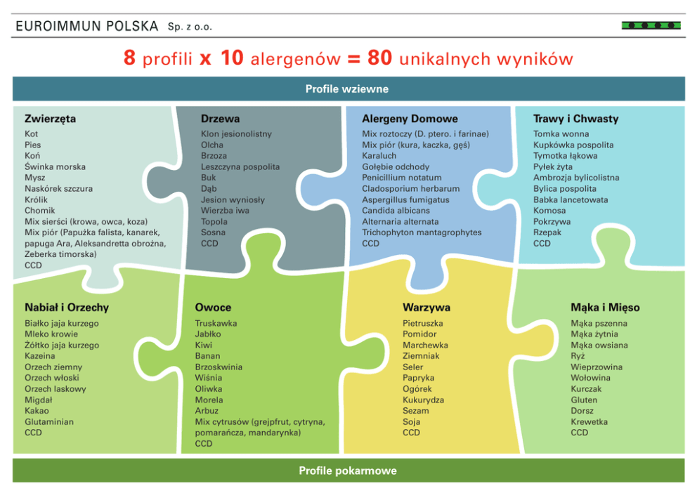 8 profili x 10 alergenów = 80 unikalnych wyników Profile wziewne Zwierzęta Drzewa Alergeny Domowe Trawy i Chwasty Kot Pies Koń Świnka morska Mysz Naskórek szczura Królik Chomik Mix sierści (krowa, owca, koza) Mix piór (Papużka falista, kanarek, papuga Ara, Aleksandretta obrożna, Zeberka timorska) CCD Klon jesionolistny Olcha Brzoza Leszczyna pospolita Buk Dąb Jesion wyniosły Wierzba iwa Topola Sosna CCD Mix roztoczy (D. ptero. i farinae) Mix piór (kura, kaczka, gęś) Karaluch Gołębie odchody Penicillium notatum Cladosporium herbarum Aspergillus fumigatus Candida albicans Alternaria alternata Trichophyton mantagrophytes CCD Tomka wonna Kupkówka pospolita Tymotka łąkowa Pyłek żyta Ambrozja bylicolistna Bylica pospolita Babka lancetowata Komosa Pokrzywa Rzepak CCD Nabiał i Orzechy Owoce Warzywa Mąka i Mięso Białko jaja kurzego Mleko krowie Żółtko jaja kurzego Kazeina Orzech ziemny Orzech włoski Orzech laskowy Migdał Kakao Glutaminian CCD Truskawka Jabłko Kiwi Banan Brzoskwinia Wiśnia Oliwka Morela Arbuz Mix cytrusów (grejpfrut, cytryna, pomarańcza, mandarynka) CCD Pietruszka Pomidor Marchewka Ziemniak Seler Papryka Ogórek Kukurydza Sezam Soja CCD Mąka pszenna Mąka żytnia Mąka owsiana Ryż Wieprzowina Wołowina Kurczak Gluten Dorsz Krewetka CCD Profile pokarmowe