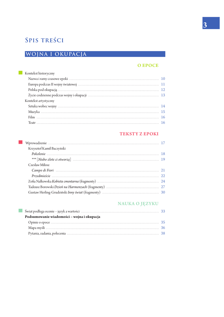 33 Spis treści W OJN A I OK U PAC JA O EPOCE Kontekst historyczny Nazwa i ramy czasowe epoki . . . . . . . . . . . . . . . . . . . . . . . . . . . . . . . . . . . . . . . . . . . . . . . . .. . . . . . . . . . . . . . . . . . . . . . . . . . . . . . . . . . . . . . . . Europa podczas II wojny światowej . . . . . . . . . . . . . . . . . . . . . . . . . . . . . . . . . . . . . . . . . . . . . . . . . .. . . . . . . . . . . . . . . . . . . . . . . . . . . . . . Polska pod okupacją . . . . . . . . . . . . . . . . . . . . . . . . . . . . . . . . . . . . . . . . . . . . . . . . . .. . . . . . . . . . . . . . . . . . . . . . . . . . . . . . . . . . . . . . . . . . . . . . . . . . Życie codzienne podczas wojny i okupacji . . . . . . . . . . . . . . . . . . . . . . . . . . . . . . . . . . . . . . . . . . . . . . . . . .. . . . . . . . . . . . . . . . . . . . Kontekst artystyczny Sztuka wobec wojny . . . . . . . . . . . . . . . . . . . . . . . . . . . . . . . . . . . . . . . . . . . . . . . . .. . . . . . . . . . . . . . . . . . . . . . . . . . . . . . . . . . . . . . . . . . . . . . . . . . . Muzyka . . . . . . . . . . . . . . . . . . . . . . . . . . . . . . . . . . . . . . . . . . . . . . . . . . . . . . . . . . . . . . . . . . . . . . . . . . . . . . . . . . . . . . . . . . . . . . . . . . . .. . . . . . . . . . . . . . . . . Film . . . . . . . . . . . . . . . . . . . . . . . . . . . . . . . . . . . . . . . . . . . . . . . . . . . . . . . . . . . . . . . . . . . . . . . . . . . . . . . . . . . . . . . . . . . . . . . . . . . .. . . . . . . . . . . . . . . . . . . . . Teatr . . . . . . . . . . . . . . . . . . . . . . . . . . . . . . . . . . . . . . . . . . . . . . . . . . . . . . . . . . . . . . . . . . . . . . . . . . . . . . . . . . . . . . . . . . . . . . . . . . . .. . . . . . . . . . . . . . . . . . . . . 10 11 12 13 14 15 16 16 TEKSTY Z EPOKI Wprowadzenie . . . . . . . . . . . . . . . . . . . . . . . . . . . . . . . . . . . . . . . . . . . . . . . . .. . . . . . . . . . . . . . . . . . . . . . . . . . . . . . . . . . . . . . . . . . . . . . . . . . .. . . . . . . . . . Krzysztof Kamil Baczyński Pokolenie . . . . . . . . . . . . . . . . . . . . . . . . . . . . . . . . . . . . . . . . . . . . . . . . . . . . . . . . . . . . . . . . . . . . . . . . . . . . . . . . . . . . . . . . . . . . . . . . . . . .. . . . . . . . . . . *** [Niebo złote ci otworzę] . . . . . . . . . . . . . . . . . . . . . . . . . . . . . . . . . . . . . . . . . . . . . . . . . . . . . . . . . . . . . . . . . . . . . . . . . . . . . . . . . . . . . Czesław Miłosz Campo di Fiori . . . . . . . . . . . . . . . . . . . . . . . . . . . . . . . . . . . . . . . . . . . . . . . . . . . . . . . . . . . . . . . . . . . . . . . . . . . . . . . . . . . . . . . . . . . . . . . . . . . . .. Przedmieście . . . . . . . . . . . . . . . . . . . . . . . . . . . . . . . . . . . . . . . . . . . . . . . . . . . . . . . . . . . . . . . . . . . . . . . . . . . . . . . . . . . . . . . . . . . . . . . . . . . .. . . . . . Zofia Nałkowska Kobieta cmentarna (fragmenty) . . . . . . . . . . . . . . . . . . . . . . . . . . . . . . . . . . . . . . . . . . . . . . . . . .. . . . . . . . . . . Tadeusz Borowski Dzień na Harmenzach (fragmenty) . . . . . . . . . . . . . . . . . . . . . . . . . . . . . . . . . . . . . . . . . . . . . . . . .. . . Gustaw Herling-Grudziński Inny świat (fragmenty) . . . . . . . . . . . . . . . . . . . . . . . . . . . . . . . . . . . . . . . . . . . . . . . . .. . . . . . . 17 18 19 21 22 24 27 30 NAUKA O JĘZYKU Świat podlega ocenie – język a wartości . . . . . . . . . . . . . . . . . . . . . . . . . . . . . . . . . . . . . . . . . . . . . . . . .. . . . . . . . . . . . . . . . . . . . . . . . . . . . Podsumowanie wiadomości – wojna i okupacja Opinie o epoce . . . . . . . . . . . . . . . . . . . . . . . . . . . . . . . . . . . . . . . . . . . . . . . . . . . . . . . . . . . . . . . . . . . . . . . . . . . . . . . . . . . . . . . . . . . . . . . . . . . . .. . . . . . Mapa myśli . . . . . . . . . . . . . . . . . . . . . . . . . . . . . . . . . . . . . . . . . . . . . . . . . . . . . . . . . . . . . . . . . . . . . . . . . . . . . . . . . . . . . . . . . . . . . . . . . . . .. . . . . . . . . . . . Pytania, zadania, polecenia . . . . . . . . . . . . . . . . . . . . . . . . . . . . . . . . . . . . . . . . . . . . . . . . . . . . . . . . . . . . . . . . . . . . . . . . . . . . . . . . . . . . . . . . . . . 33 35 36 38 4 NAWIĄZANIA Śladami wojny i okupacji . . . . . . . . . . . . . . . . . . . . . . . . . . . . . . . . . . . . . . . . . . . . . . . . .. . . . . . . . . . . . . . . . . . . . . . . . . . . . . . . . . . . . . . . . . . . . .. . . Kazimierz Moczarski Rozmowy z katem (fragmenty) . . . . . . . . . . . . . . . . . . . . . . . . . . . . . . . . . . . . . . . . . . . . . . . . .. . . . . Hannah Arendt Eichmann w Jerozolimie. Rzecz o banalności zła (fragmenty) . . . . . . . . . . . . . . . . . . . . Hanna Krall Zdążyć przed Panem Bogiem (fragmenty) . . . . . . . . . . . . . . . . . . . . . . . . . . . . . . . . . . . . . . . . . . . . . . . . .. . Zdzisław Beksiński Pełzająca śmierć . . . . . . . . . . . . . . . . . . . . . . . . . . . . . . . . . . . . . . . . . . . . . . . . .. . . . . . . . . . . . . . . . . . . . . . . . . . . . Lao Che Godzina W . . . . . . . . . . . . . . . . . . . . . . . . . . . . . . . . . . . . . . . . . . . . . . . . .. . . . . . . . . . . . . . . . . . . . . . . . . . . . . . . . . . . . . . . . . . . . . . . . . . Popiół i diament, reż. Andrzej Wajda . . . . . . . . . . . . . . . . . . . . . . . . . . . . . . . . . . . . . . . . . . . . . . . . .. . . . . . . . . . . . . . . . . . . . . . . . . . . . Pianista, reż. Roman Polański . . . . . . . . . . . . . . . . . . . . . . . . . . . . . . . . . . . . . . . . . . . . . . . . .. . . . . . . . . . . . . . . . . . . . . . . . . . . . . . . . . . .. . . 39 40 41 42 43 44 45 46 PRZYGOTOWANIE DO MATURY Czytanie z