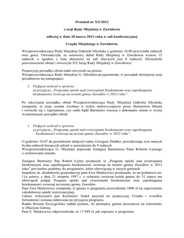 Protokół nr XX/2012 z sesji Rady Miejskiej w Zawidowie odbytej w dniu 28 marca 2012 roku w sali konferencyjnej Urzędu Miejskiego w Zawidowie. Wiceprzewodnicząca Rady Miejskiej Gabriela Micińska o godzinie 16.00 przywitała radnych oraz gości. Oświadczyła, że ustawowy skład Rady Miejskiej w Zawidowie wynosi 15 radnych, a zgodnie z listą obecności na sali obecnych jest 8 radnych. Stwierdziła prawomocność obrad i otworzyła XX Sesję Rady Miejskiej w Zawidowie. Propozycję porządku obrad radni otrzymali na piśmie. Wiceprzewodnicząca Rady Miejskiej G. Micińska przypomniała, iż porządek dzisiejszej sesji przedstawia się następująco: 1. Podjęcie uchwał w sprawie: a) przyjęcia „Programu opieki nad zwierzętami bezdomnymi oraz zapobiegania bezdomności zwierząt na terenie gminy Zawidów w 2012 roku”. Po odczytaniu porządku obrad Wiceprzewodnicząca Rady Miejskiej Gabriela Micińska oznajmiła, iż sesja została zwołana w trybie nadzwyczajnym przez Burmistrza Miasta i zwróciła się z zapytaniem, czy radni bądź Burmistrz wnoszą o dokonanie zmian w wyżej wymienionym porządku obrad. 1. Podjęcie uchwał w sprawie: a) przyjęcia „Programu opieki nad zwierzętami bezdomnymi oraz zapobiegania bezdomności zwierząt na terenie gminy Zawidów w 2012 roku”. O godzinie 16.07 do posiedzenie dołączył radny Grzegorz Drabko, powiększając tym samych liczbę radnych biorących udział w posiedzeniu do 9 radnych. Wiceprzewodnicząca G. Micińska poprosiła Zastępcę Burmistrza Pana Roberta Łężnego o zreferowanie tematu. Zastępca Burmistrz Pan Robert Łężny przekazał, iż „Program opieki nad zwierzętami bezdomnymi oraz zapobiegania bezdomności zwierząt na terenie gminy Zawidów w 2012 roku” jest bardzo podobny do programów, które obowiązują w innych gminach. Inspektor ds. działalności gospodarczej pani Ewa Markiewicz przekazała, że na podstawie art. 11a ustawy z dnia 21 sierpnia 1997 r. o ochronie zwierząt każda gmina do 31 marca ma obowiązek podjąć Program opieki nad zwierzętami bezdomnymi oraz zapobiegania bezdomności zwierząt na terenie gminy Zawidów. Pani Ewa Markiewicz oznajmiła, iż gmina w programie przewidziała 1000 zł na zapewnienie całodobowej opieki weterynaryjnej. Lekarz weterynarii pan Kazimierz Sudoł przystał na propozycję Urzędu i wszelkie formalności zostaną załatwione po przyjęciu programu. Radna Bożena Szczygielska zadała pytanie, ile pieniędzy gmina przeznacza na schronisko w Dłużynie Górnej. Pani E. Markiewicz odpowiedziała, że 17.949 zł, jak zapisano w programie. Radna B. Szczygielska zadała pytanie, czy mieszkańcy zostaną poinformowani, jak postępować w przypadku sytuacji, które zawarte zostały w programie. Pani E. Markiewicz wyjaśniła, że w przypadku podjęcia uchwały należy powiadomić Komendę Powiatowa Policji o zawarciu umowy z weterynarzem, aby w razie wypadku z udziałem zwierzęcia funkcjonariusze policji wiedzieli kogo zawiadomić. Ponadto trzeba będzie wystąpić z pismami do spółdzielni mieszkaniowej oraz wspólnot mieszkaniowych z zapytaniem, kto z mieszkańców dokarmia bezdomne zwierzęta. Gmina zakupi karmę, która zostanie wydawana osobom dokarmiającym koty. Z tymi osobami będą podpisywane oświadczenia w tej sprawie. Radna B. Szczygielska zadała pytanie, czy ustawa reguluje postępowanie w przypadku zwierząt bezdomnych zagrażających mieszkańcom. Pani E. Markiewicz oznajmiła, iż ustawa mówi o tym, że gmina musi podjąć taki program. Zastępca Burmistrza R. Łężny przekazał, że w przypadku, kiedy pojawi się zwierzę zagrażające mieszkańcom informowane jest schronisko, które przyjeżdża i wyłapuje takie zwierzęta. Radna B. Szczygielska zadała pytanie, czy jest prowadzona ewidencja szczepień psów. Pani E. Markiewicz odpowiedziała, że nie ma takiej ewidencji. Radny Adam Żuk zadał pytanie, jaka kwota wpływa do budżetu z tytułu podatku od psa. Skarbnik K. Bilmon odpowiedziała, że w ubiegłym roku podatek od psa wpłaciło 60 mieszkańców i jest to niewielka kwota. Radna G. Micińska zadała pytanie, jak wyglądają zapisy programu w innych gminach mówiące o wysokości środków na dokarmianie zwierząt. Zastępca Burmistrza R. Łężny odpowiedział, że kwoty są zbliżone. Radna G. Micińska zadała pytanie, jak będzie wyglądała w praktyce kastracja i sterylizacja ślepych miotów. Pani E. Markiewicz oznajmiła, że jeśli zajdzie potrzeba wykonania takich zabiegów osoby zajmujące się zwierzętami zostaną o tym poinformowane w należyty sposób. Radna G. Micińska zadała pytanie, jaka ilość takich zabiegów mieści się w kwocie 1000zł. Pani E. Markiewicz odpowiedziała, że lekarz weterynarii nie określił konkretnej kwoty na ten cel, lecz konieczność wykonania takiego zabiegu zdarza się bardzo rzadko. Radny Grzegorz Drabko zadał pytanie, w jaki sposób można odróżnić karmiciela od właściciela. Pani E. Markiewicz odpowiedziała, że nie ma definicji, lecz łatwością można odróżnić koty, które są bezdomne. Radna G. Micińska zadała pytanie, czy lekarz weterynarii będzie miał całodobową opiekę weterynaryjną w przypadku zdarzeń drogowych z udziałem zwierząt i czy będzie otrzymywał za to 1000 zł rocznie. Pani E. Markiewicz odpowiedziała, że tak to będzie wyglądało. Radna G. Micińska ogłosiła 5 minut przerwy. Po zakończeniu przerwy Wiceprzewodnicząca G. Micińska poinformowała, że na sali obecnych jest 9 radnych. Radny Grzegorz Drabko wniósł poprawkę do § 10 projektu uchwały, a mianowicie o wykreślenie pkt 1, który mówi o tym, że właściciele psów zobowiązani są do ich elektronicznego znakowania we własnym zakresie i na własny koszt z § 10 pkt 4. Radny G. Drabko oznajmił, iż ustawa nie nakłada takiego obowiązku na właścicieli psów. Mecenas Violetta Lemek wyjaśniła, iż ustawa mówi o tym, że program może obejmować plan znakowania zwierząt w gmi