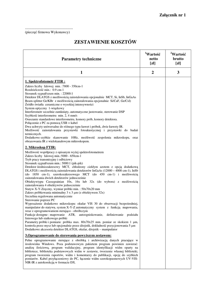 Załącznik nr 1 ............................................. (pieczęć firmowa Wykonawcy) ZESTAWIENIE KOSZTÓW 1 Parametry techniczne Wartość netto [zł] 1 2 1. Spektrofotometr FTIR : Zakres liczby falowej min. :7800 - 350cm-1 Rozdzielczość min.: 0.9 cm-1 Stosunek sygnał/szum min. : 22000:1 Detektor DLATGS z moŜliwością zainstalowania opcjonalnie MCT, Si, InSb, InGaAs Beam-splitter Ge/KBr z moŜliwością zainstalowania opcjonalnie Si/CaF, Ge/CsI) Źródło światła ceramiczne o wysokiej intensywności System optyczny 1-wiązkowy Interferometr szczelnie zamknięty, automatyczne justowanie, sterowanie DSP Szybkość interferometru min. 2, 4 mm/s Osuszanie standardowe interferometru, komory prób, komory detektora. Połączenie z PC za pomocą USB + kabel Dwa uchwyty uniwersalne do róŜnego typu kuwet i próbek, dwie kuwety IR. MoŜliwość zainstalowania przystawki fotoakustycznej i przystawki do badań termicznych. Dodatkowe szybkie skanowanie 10Hz, moŜliwość zespolenia mikroskopu, oraz obrazowania IR z wielokanałowym mikroskopem. 2. Mikroskop FTIR: MoŜliwość współpracy z opisanym wyŜej spektrofotometrem Zakres liczby falowej min.:5000 - 650cm-1 Tryb pracy transmisyjny i odbiciowy Stosunek sygnał/szum min.: 5000:1 (pik-pik) Detektor średniozakresowy MCT, chłodzony ciekłym azotem z opcją dodatkową DLATGS i moŜliwością zainstalowania detektorów InGaAs (12000 – 4000 cm-1), InSb (do 1850 cm-1), szerokozakresowego MCT (do 450 cm-1) i moŜliwością zainstalowania dwóch detektorów jednocześnie Obiektywtypu Cassegrainian 10x, 16x lub 32x (do wyboru) z moŜliwością zainstalowania 4 obiektywów jednocześnie Statyw X-Y-Zręczny, wymiar próbki min. : 50x70x20 mm Zakres próbkowania minimalny 3 x 3 µm (z obiektywem 32x) Szczelina regulowana automatycznie Sterowanie poprzez PC WyposaŜenie dodatkowe mikroskopu: okular VIS 30 do obserwacji bezpośredniej, manipulator do statywu, system X-Y-Z automatyczny system z funkcją mapowania, wraz z oprogramowaniem sterująco - obróbczym Funkcje dostępne : mapowanie ATR, autoogniskowanie, definiowanie podziału liniowego lub siatkowego próbki Parametry próbki i pomiaru: próbka max. 80x70x25 mm. pomiar ze skokiem 1 µm, kontrola przez mysz lub opcjonalnie przez dŜojstik, dokładność pozycjonowania 5 µm Dodatkowe akcesoria detektor DLATGS, okular, dŜojstik – manipulator 3.Oprogramowanie do sterowania powyŜszym zestawem: Pełne oprogramowanie sterujące z obróbką i archiwizacją danych pracujące w środowisku Windows. Poza podstawowym pakietem program powinien zawierać: analizę ilościową, program walidacyjny, program identyfikacji widm oparty na bibliotece, biblioteka podstawowych widm w zestawie, tworzenie własnej biblioteki, program tworzenia raportów, widm i komentarzy do publikacji, opcję do szybkich pomiarów. Kabel przyłączeniowy do PC, łączenie widm szerokopasmowych UV-VISNIR-IR z autokorekcją w formacie DX. 2 Wartość brutto [zł] 3 Załącznik nr 1 4. Drukarka atramentowa HP DeskJet 5940 lub równowaŜna –parametry minimalne: technologia druku termiczna atramentowa druk Photo tak maks. rozmiar nośnika A4 maks. szybkość druku mono 30 str./min. maks. szybkość druku w kolorze 24 str./min. rozdzielczość w pionie mono 1 200 dpi rozdzielczość w poziomie mono 1 200 dpi rozdzielczość w pionie kolor 4 800 dpi rozdzielczość w poziomie kolor 1 200 dpi złącze USB tak + kabel pojemność podajnika papieru 100 arkuszy gramatura papieru 60 - 280 g/m² oprogramowanie oprogramowanie HP Image Zone Photo & Imaging zainstalowana pamięć 32 MB normatywny cykl pracy 3 000 str./mies. dodatkowe informacje druk bez marginesów we wszystkich formatach 5. Monitora LCD 17” LG Flatron L17528 SF lub równowaŜny -parametry minimalne: typ matrycy rozdzielczość nominalna kontrast jasność maks. częst. odchylania pionowego maks. częst. odchylania poziomego wielkość plamki czas reakcji plamki kąt widzenia pion kąt widzenia poziom ilość wyświetlanych kolorów TN 1280 x 1024 piksele 1400:1 300 cd/m² 75 Hz 83 kHz 0,264 mm 8 ms 160 ° 160 ° 16,2 mln 6. Komputer Celeron 1,6 GHz lub równowaŜny –parametry minimalne: pamięć RAM 512 MB HDD 60 GB nagrywarka DVD USB – 4szt, 2 wyprowadzone na przód karta graficzna, dźwiękowa, sieciowa 100Mbps mogą być zintegrowane obudowa stojąco-leŜąca z zasilaniem 350 Wat FDD 1,44 MB klawiatura mysz optyczna z rolką system Windows XP Pro (lub Vista) Uwaga: Sprzęt komputerowy ujęty w powyŜszej tabeli ma zapewnić pełną obsługę urządzeń wyszczególnionych w tej tabeli. 1 wartość netto - to cena (bez podatku VAT) całego urządzenia składającego się z sześciu elementów wyszczególnionych w powyŜszej tabeli; 2 wartość brutto - to cena (z podatkiem VAT) całego urządzenia składającego się z sześciu elementów wyszczególnionych w powyŜszej tabeli; ...................... Data ...................................................... Podpis osób uprawnionych do składania oświadczeń woli w imieniu Wykonawcy
