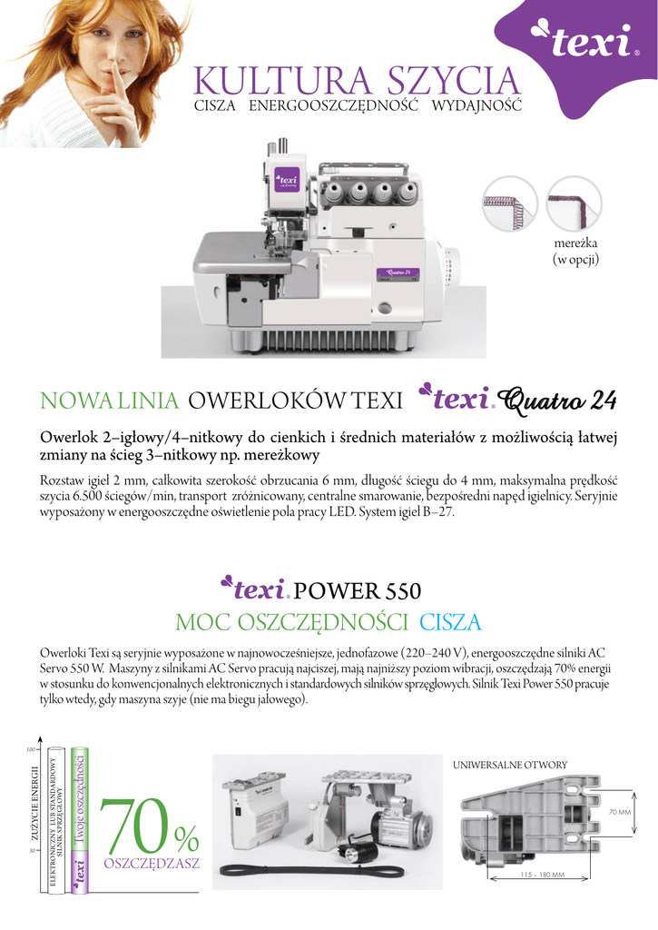 KULTURA SZYCIA cisza energooszczędność wydajność mereżka (w opcji) Quatro 24 nowa linia owerloków texi Owerlok 2–igłowy/4–nitkowy do cienkich i średnich materiałów z możliwością łatwej zmiany na ścieg 3–nitkowy np. mereżkowy Rozstaw igieł 2 mm, całkowita szerokość obrzucania 6 mm, długość ściegu do 4 mm, maksymalna prędkość szycia 6.500 ściegów/min, transport zróżnicowany, centralne smarowanie, bezpośredni napęd igielnicy. Seryjnie wyposażony w energooszczędne oświetlenie pola pracy LED. System igieł B–27. POWER 550 moc oszczędności cisza Owerloki Texi są seryjnie wyposażone w najnowocześniejsze, jednofazowe (220–240 V), energooszczędne silniki AC Servo 550 W. Maszyny z silnikami AC Servo pracują najciszej, mają najniższy poziom wibracji, oszczędzają 70% energii w stosunku do konwencjonalnych elektronicznych i standardowych silników sprzęgłowych. Silnik Texi Power 550 pracuje tylko wtedy, gdy maszyna szyje (nie ma biegu jałowego). 30 Twoje oszczędności elektroniczny lub standardowy silnik sprzęgłowy zużycie energii 100 UNIWERSALNE OTWORY 70% oszczędzasz 70 MM 115 – 180 MM kultura szycia texi premium ex cisza i oszczędności więcej światła Sygnowano Texi Premium EX Silnik TexiPower 550 Zobacz różnicę Najwyższa jakość podstaw, blatów i wyposażenia maszyn do szycia. Silnik TexiPower 550 Servo pracuje cicho i tylko wtedy, gdy maszyna szyje. Silnik AC Servo oszczędza 70 % energii w stosunku do konwencjonalnych elektronicznych i standardowych silników sprzęgłowych Stebnówki Texi są seryjnie wyposażone w energooszczędne oświetlenie pola pracy LED. ergonomia i odporność stabilność pracuj wygodnie Płyta stołu TABLE TOP QC PREMIUM EX Podstawa stołu STAND PREMIUM EX SILVER Ergolinia Obrotowe krzesła przemysłowe do szwalni i atelier Płyty stołów do maszyn Texi wykonujemy z najwyższej jakości 30 warstwowej sklejki brzozowej. Są odporne na wilgoć i olej. Powierzchnia płyt jest pokryta laminatem o zoptymalizowanej strukturze dla przemysłu odzieżowego. Jest maksymalnie odporna na uderzenia, odpryski oraz ścieranie. Boki zabezpieczone listwami ochronnymi ABS. Owerloki Texi w wersji wpuszczanej są montowane na podblacie ze sklejki (unikalne, najlepsze rozwiązanie). Płyty Texi nie zawierają szkodliwych składników. Sztywna, stabilna, trwała i uniwersalna podstawa przemysłowych maszyn do szycia. Regulowana wysokość (bez blatu – min. 72 cm, max. 82 cm). Szeroki pedał w komplecie, wąski pedał w opcji. Kolor srebrny metalic RAL 9006 (z linii krzeseł przemysłowych Ergolinia). Stalowa, pięcioramienna podstawa z niskich profili mieści się pod pedałem maszyny i pozwala ustawić krzesło w wygodnej pozycji. Regulowana wysokość 44 do 67 cm. Amortyzator oparcia ze stali resorowej. Wersja tapicerowana (Ergolinia 10002) ze specjalnej tkaniny odpornej na piling i ścieranie. Wersja ze sklejki (Ergolinia 10004) zmywalna, odporna na tłuszcz i zabrudzenia. Idealna do wielozmianowej pracy. Lakierowane proszkowo RAL 9006. podblat ze sklejki Jedyne krzesła do szwalni z 3–letnią przemysłową gwarancją. przemysł sprzedaż on-line www.strima.com Producent zastrzega sobie prawo do wprowadzania, bez uprzedzenia, zmian parametrów technicznych, wyposażenia i specyfikacji oferowanych urządzeń. atelier sklep dom ciesz się ciszą oszczędzaj energię