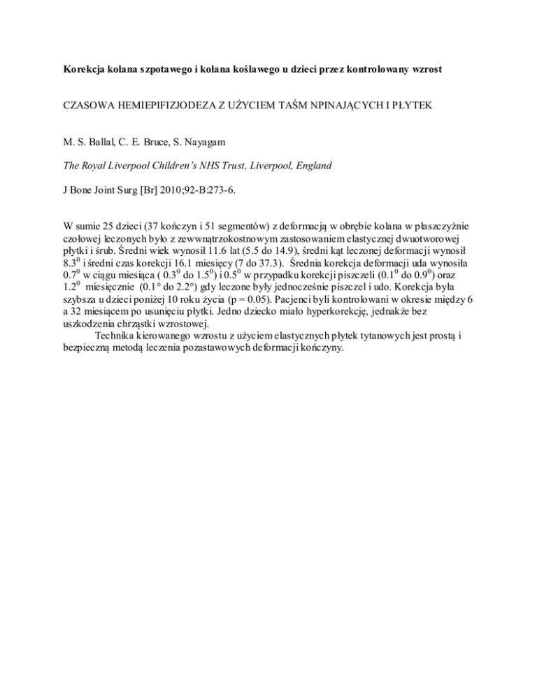 Korekcja kolana s zpotawego i kolana koślawego u dzieci prze z kontrolowany wzrost CZASOWA HEMIEPIFIZJODEZA Z UŻYCIEM TAŚM NPINAJĄCYCH I PŁYTEK M. S. Ballal, C. E. Bruce, S. Nayagam The Royal Liverpool Children’s NHS Trust, Liverpool, England J Bone Joint Surg [Br] 2010;92-B:273-6. W sumie 25 dzieci (37 kończyn i 51 segmentów) z deformacją w obrębie kolana w płaszczyźnie czołowej leczonych było z zewwnątrzokostnowym zastosowaniem elastycznej dwuotworowej płytki i śrub. Średni wiek wynosił 11.6 lat (5.5 do 14.9), średni kąt leczonej deformacji wynosił 8.30 i średni czas korekcji 16.1 miesięcy (7 do 37.3). Średnia korekcja deformacji uda wynosiła 0.70 w ciągu miesiąca ( 0.30 do 1.50 ) i 0.50 w przypadku korekcji piszczeli (0.10 do 0.90 ) oraz 1.20 miesięcznie (0.1° do 2.2°) gdy leczone były jednocześnie piszczel i udo. Korekcja była szybsza u dzieci poniżej 10 roku życia (p = 0.05). Pacjenci byli kontrolowani w okresie między 6 a 32 miesiącem po usunięciu płytki. Jedno dziecko miało hyperkorekcję, jednakże bez uszkodzenia chrząstki wzrostowej. Technika kierowanego wzrostu z użyciem elastycznych płytek tytanowych jest prostą i bezpieczną metodą leczenia pozastawowych deformacji kończyny.