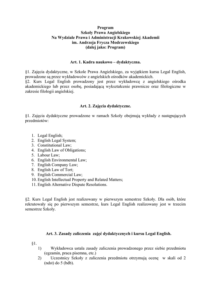 Program Szkoły Prawa Angielskiego Na Wydziale Prawa i Administracji Krakowskiej Akademii im. Andrzeja Frycza Modrzewskiego (dalej jako: Program) Art. 1. Kadra naukowo – dydaktyczna. §1. Zajęcia dydaktyczne, w Szkole Prawa Angielskiego, za wyjątkiem kursu Legal English, prowadzone są przez wykładowców z angielskich ośrodków akademickich. §2. Kurs Legal English prowadzony jest przez wykładowcę z angielskiego ośrodka akademickiego lub przez osobę, posiadającą wykształcenie prawnicze oraz filologiczne w zakresie filologii angielskiej. Art. 2. Zajęcia dydaktyczne. §1. Zajęcia dydaktyczne prowadzone w ramach Szkoły obejmują wykłady z następujących przedmiotów: 1. Legal English; 2. English Legal System; 3. Constitutional Law; 4. English Law of Obligations; 5. Labour Law; 6. English Environmental Law; 7. English Company Law; 8. English Law of Tort; 9. English Commercial Law; 10. English Intellectual Property and Related Matters; 11. English Alternative Dispute Resolutions. §2. Kurs Legal English jest realizowany w pierwszym semestrze Szkoły. Dla osób, które rekrutowały się po pierwszym semestrze, kurs Legal English realizowany jest w trzecim semestrze Szkoły. Art. 3. Zasady zaliczenia zajęć dydaktycznych i kursu Legal English. §1. 1) Wykładowca ustala zasady zaliczenia prowadzonego przez siebie przedmiotu (egzamin, praca pisemna, etc.) 2) Uczestnicy Szkoły z zaliczenia przedmiotu otrzymują ocenę w skali od 2 (ndst) do 5 (bdb). Art. 4. Warunki ukończenia Szkoły Prawa Angielskiego. §1. Dyplom ukończenia Szkoły Prawa Angielskiego KA otrzymują studenci KA oraz innych uczelni, którzy uzyskali zaliczenie wszystkich przedmiotów, objętych programem Szkoły. §2. Student na swój wniosek może otrzymać zaświadczenie o zaliczeniu przedmiotów, objętych danym semestrem nauki w Szkole. Art. 5. Postanowienia końcowe §.1 Wszelkie decyzje nie uregulowane niniejszym programem podejmuje Kierownik Szkoły. §.2 Niniejszy program stanowi integralną część Regulaminu Szkoły Prawa Angielskiego.
