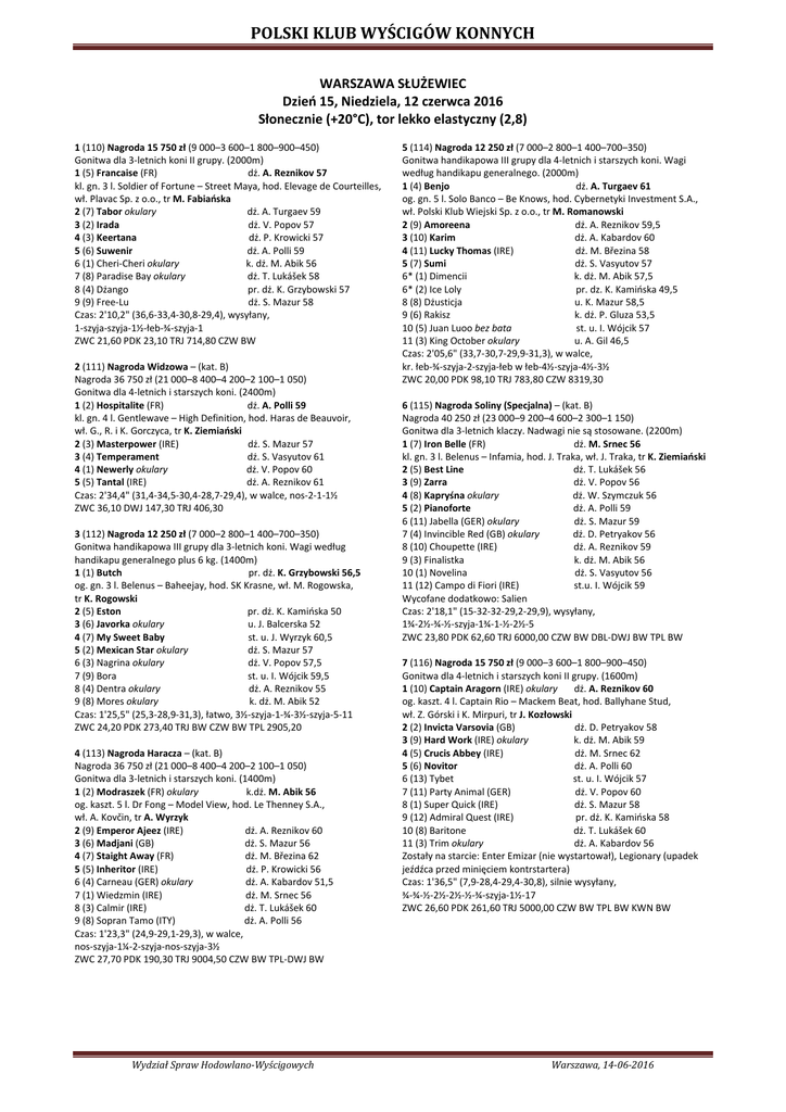 POLSKI KLUB WYŚCIGÓW KONNYCH WARSZAWA SŁUŻEWIEC Dzień 15, Niedziela, 12 czerwca 2016 Słonecznie (+20°C), tor lekko elastyczny (2,8) 1 (110) Nagroda 15 750 zł (9 000–3 600–1 800–900–450) Gonitwa dla 3-letnich koni II grupy. (2000m) 1 (5) Francaise (FR) dż. A. Reznikov 57 kl. gn. 3 l. Soldier of Fortune – Street Maya, hod. Elevage de Courteilles, wł. Plavac Sp. z o.o., tr M. Fabiańska 2 (7) Tabor okulary dż. A. Turgaev 59 3 (2) Irada dż. V. Popov 57 4 (3) Keertana dż. P. Krowicki 57 5 (6) Suwenir dż. A. Polli 59 6 (1) Cheri-Cheri okulary k. dż. M. Abik 56 7 (8) Paradise Bay okulary dż. T. Lukášek 58 8 (4) Dżango pr. dż. K. Grzybowski 57 9 (9) Free-Lu dż. S. Mazur 58 Czas: 2'10,2" (36,6-33,4-30,8-29,4), wysyłany, 1-szyja-szyja-1½-łeb-¾-szyja-1 ZWC 21,60 PDK 23,10 TRJ 714,80 CZW BW 2 (111) Nagroda Widzowa – (kat. B) Nagroda 36 750 zł (21 000–8 400–4 200–2 100–1 050) Gonitwa dla 4-letnich i starszych koni. (2400m) 1 (2) Hospitalite (FR) dż. A. Polli 59 kl. gn. 4 l. Gentlewave – High Definition, hod. Haras de Beauvoir, wł. G., R. i K. Gorczyca, tr K. Ziemiański 2 (3) Masterpower (IRE) dż. S. Mazur 57 3 (4) Temperament dż. S. Vasyutov 61 4 (1) Newerly okulary dż. V. Popov 60 5 (5) Tantal (IRE) dż. A. Reznikov 61 Czas: 2'34,4" (31,4-34,5-30,4-28,7-29,4), w walce, nos-2-1-1½ ZWC 36,10 DWJ 147,30 TRJ 406,30 3 (112) Nagroda 12 250 zł (7 000–2 800–1 400–700–350) Gonitwa handikapowa III grupy dla 3-letnich koni. Wagi według handikapu generalnego plus 6 kg. (1400m) 1 (1) Butch pr. dż. K. Grzybowski 56,5 og. gn. 3 l. Belenus – Baheejay, hod. SK Krasne, wł. M. Rogowska, tr K. Rogowski 2 (5) Eston pr. dż. K. Kamińska 50 3 (6) Javorka okulary u. J. Balcerska 52 4 (7) My Sweet Baby st. u. J. Wyrzyk 60,5 5 (2) Mexican Star okulary dż. S. Mazur 57 6 (3) Nagrina okulary dż. V. Popov 57,5 7 (9) Bora st. u. I. Wójcik 59,5 8 (4) Dentra okulary dż. A. Reznikov 55 9 (8) Mores okulary k. dż. M. Abik 52 Czas: 1'25,5" (25,3-28,9-31,3), łatwo, 3½-szyja-1-¾-3½-szyja-5-11 ZWC 24,20 PDK 273,40 TRJ BW CZW BW TPL 2905,20 4 (113) Nagroda Haracza – (kat. B) Nagroda 36 750 zł (21 000–8 400–4 200–2 100–1 050) Gonitwa dla 3-letnich i starszych koni. (1400m) 1 (2) Modraszek (FR) okulary k.dż. M. Abik 56 og. kaszt. 5 l. Dr Fong – Model View, hod. Le Thenney S.A., wł. A. Kovčin, tr A. Wyrzyk 2 (9) Emperor Ajeez (IRE) dż. A. Reznikov 60 3 (6) Madjani (GB) dż. S. Mazur 56 4 (7) Staight Away (FR) dż. M. Březina 62 5 (5) Inheritor (IRE) dż. P. Krowicki 56 6 (4) Carneau (GER) okulary dż. A. Kabardov 51,5 7 (1) Wiedzmin (IRE) dż. M. Srnec 56 8 (3) Calmir (IRE) dż. T. Lukášek 60 9 (8) Sopran Tamo (ITY) dż. A. Polli 56 Czas: 1'23,3" (24,9-29,1-29,3), w walce, nos-szyja-1¼-2-szyja-nos-szyja-3½ ZWC 27,70 PDK 190,30 TRJ 9004,50 CZW BW TPL-DWJ BW Wydział Spraw Hodowlano-Wyścigowych 5 (114) Nagroda 12 250 zł (7 000–2 800–1 400–700–350) Gonitwa handikapowa III grupy dla 4-letnich i starszych koni. Wagi według handikapu generalnego. (2000m) 1 (4) Benjo dż. A. Turgaev 61 og. gn. 5 l. Solo Banco – Be Knows, hod. Cybernetyki Investment S.A., wł. Polski Klub Wiejski Sp. z o.o., tr M. Romanowski 2 (9) Amoreena dż. A. Reznikov 59,5 3 (10) Karim dż. A. Kabardov 60 4 (11) Lucky Thomas (IRE) dż. M. Březina 58 5 (7) Sumi dż. S. Vasyutov 57 6* (1) Dimencii k. dż. M. Abik 57,5 6* (2) Ice Loly pr. dz. K. Kamińska 49,5 8 (8) Dżusticja u. K. Mazur 58,5 9 (6) Rakisz k. dż. P. Gluza 53,5 10 (5) Juan Luoo bez bata st. u. I. Wójcik 57 11 (3) King October okulary u. A. Gil 46,5 Czas: 2'05,6" (33,7-30,7-29,9-31,3), w walce, kr. łeb-¾-szyja-2-szyja-łeb w łeb-4½-szyja-4½-3½ ZWC 20,00 PDK 98,10 TRJ 783,80 CZW 8319,30 6 (115) Nagroda Soliny (Specjalna) – (kat. B) Nagroda 40 250 zł (23 000–9 200–4 600–2 300–1 150) Gonitwa dla 3-letnich klaczy. Nadwagi nie są stosowane. (2200m) 1 (7) Iron Belle (FR) dż. M. Srnec 56 kl. gn. 3 l. Belenus – Infamia, hod. J. Traka, wł. J. Traka, tr K. Ziemiański 2 (5) Best Line dż. T. Lukášek 56 3 (9) Zarra dż. V. Popov 56 4 (8) Kapryśna okulary dż. W. Szymczuk 56 5 (2) Pianoforte dż. A. Polli 59 6 (11) Jabella (GER) okulary dż. S. Mazur 59 7 (4) Invincible Red (GB) okulary dż. D. Petryakov 56 8 (10) Choupette (IRE) dż. A. Reznikov 59 9 (3) Finalistka k. dż. M. Abik 56 10 (1) Novelina dż. S. Vasyutov 56 11 (12) Campo di Fiori (IRE) st.u. I. Wójcik 59 Wycofane dodatkowo: Salien Czas: 2'18,1" (15-32-32-29,2-29,9), wysyłany, 1¾-2½-¾-½-szyja-1¾-1-½-2½-5 ZWC 23,80 PDK 62,60 TRJ 6000,00 CZW BW DBL-DWJ BW TPL BW 7 (116) Nagroda 15 750 zł (9 000–3 600–1 800–900–450) Gonitwa dla 4-letnich i starszych koni II grupy. (1600m) 1 (10) Captain Aragorn (IRE) okulary dż. A. Reznikov 60 og. kaszt. 4 l. Captain Rio – Mackem Beat, hod. Ballyhane Stud, wł. Z. Górski i K. Mirpuri, tr J. Kozłowski 2 (2) Invicta Varsovia (GB) dż. D. Petryakov 58 3 (9) Hard Work (IRE) okulary k. dż. M. Abik 59 4 (5) Crucis Abbey (IRE) dż. M. Srnec 62 5 (6) Novitor dż. A. Polli 60 6 (13) Tybet st. u. I. Wójcik 57 7 (11) Party Animal (GER) dż. V. Popov 60 8 (1) Super Quick (IRE) dż. S. Mazur 58 9 (12) Admiral Quest (IRE) pr. dż. K. Kamińska 58 10 (8) Baritone dż. T. Lukášek 60 11 (3) Trim okulary dż. A. Kabardov 56 Zostały na starcie: Enter Emizar (nie wystartował), Legionary (upadek jeźdźca przed minięciem kontrstartera) Czas: 1'36,5" (7,9-28,4-29,4-30,8), silnie wysyłany, ¾-¾-½-2½-2½-½-¾-szyja-1½-17 ZWC 26,60 PDK 261,60 TRJ 5000,00 CZW BW TPL BW KWN BW Warszawa, 14-06-2016 POLSKI KLUB WYŚCIGÓW KONNYCH 8 (117) Nagroda Iwna (Przychówku) – L (kat. A) Nagroda 57 750 zł (33 000–13 200–6 600–3 300–1 650) Gonitwa międzynarodowa dla 3-letnich ogierów i klaczy. (2200m) 1 (1) Caccini (FR) dż. T. Lukášek 59 og. gn. 3 l. American Post – Courances, hod. Bloodstock Agency Ltd, M.-F. Mathet, wł. A. Zieliński, R. Zieliński i A. Wyrzyk, tr A. Wyrzyk 2 (6) E