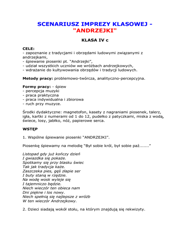 SCENARIUSZ IMPREZY KLASOWEJ "ANDRZEJKI" KLASA IV c CELE: - zapoznanie z tradycjami i obrzędami ludowymi związanymi z andrzejkami, - śpiewanie piosenki pt. “Andrzejki”, - udział wszystkich uczniów we wróżbach andrzejkowych, - wdrażanie do kultywowania obrzędów i tradycji ludowych. Metody pracy: problemowo-twórcza, analityczno-percepcyjna. Formy pracy: - śpiew - percepcja muzyki - praca praktyczna - praca indywidualna i zbiorowa - ruch przy muzyce. Środki dydaktyczne: magnetofon, kasety z nagraniami piosenek, talerz, igła, kartki z numerami od 1 do 12, pudełko z patyczkami, miska z wodą, świece, losy, jabłko, nóż, papierowe serca. WSTĘP 1. Wspólne śpiewanie piosenki “ANDRZEJKI”. Piosenkę śpiewamy na melodię “Był sobie król, był sobie paź.......” Listopad gdy już kończy dzień I gwiazdka się pokaże. Spotkamy się przy blasku świec Tak jak tradycja każe. Zaszczeka pies, gęś złapie ser I buty staną w rzędzie. Na wodę wosk wyleje się I tajemniczo będzie. Niech wieczór ten obieca nam Dni piękne i los nowy. Niech spełnią się najlepsze z wróżb W ten wieczór Andrzejkowy. 2. Dzieci siadają wokół stołu, na którym znajdują się rekwizyty. 3. Nauczyciel zapala świece, aby stworzyć atmosferę tajemniczości. Następnie przyciszonym głosem opowiada dzieciom, jak to dawniej, szczególnie na wsiach było: W ostatni wieczór przed Adwentem (w dzień świętego Andrzeja lub w wigilię świętego Andrzeja) wszystkie dziewczęta ze wsi schodziły się razem w jednej izbie, by spędzić miło czas. Od następnego dnia aż do Bożego Narodzenia obowiązywała powaga w oczekiwaniu na narodziny Pana Jezusa i przez prawie miesiąc nie można było urządzać zabaw i śpiewać wesołych piosenek. Ponieważ święty Andrzej jest patronem panienek, więc podczas tego spotkania dziewczęta za pomocą wróżb starały się uzyskać odpowiedź na pytanie, czy w następnym roku wyjdą za mąż i co je czeka. Chłopcy już znali tajemnice ich przyszłości, gdyż w imieniny ich patronki, świętej Katarzyny, dnia 25 listopada była pora wróżb dla chłopców. Natomiast “Na świętego Andrzeja wszystkim pannom nadzieja na szczęście i szczęśliwe rychłe zamążpójście”. Dlatego dziewczęta wróżąc sobie prosiły: ,,Święty Andrzeju, daj mi znać, co się ze mną będzie dziać”. Obecnie oba obrzędy zostały połączone i są obchodzone jako tradycyjne andrzejki. Są one dziś rozpowszechnione w całej Polsce i stanowią doskonały pretekst do zabawy. Na ogół nikt nie traktuje ich poważnie, chociaż wiele osób uważa, że wprawdzie jest to tylko zabawa, ale czasem się sprawdza. CZĘŚĆ WŁAŚCIWA Dla podtrzymania tradycji andrzejkowych rozpoczynamy wróżby. Oczywiście wróżby nie będą dotyczyły zamążpójścia, lecz będą związane z przyszłością szkolną i rodzinną dzieci na rok następny- do andrzejek przyszłego roku. I Wróżba – trzy talerze. Pod trzema odwróconymi do góry dnem talerzami znajdują się piątka, czwórka i znak zapytania. Wybór piątki i czwórki nie wymaga tłumaczenia, natomiast znak zapytania daje dziecku do myślenia, że należy zająć się nauką. II Wróżba- obierzyna z jabłek. Każde z dzieci obiera jabłko tak, aby obierzyna była najdłuższa. Następnie rzuca ją za siebie. Kształt, w jaki ułożyła się obierzyna wskazuje pierwszą literę przyjaciela. III Wróżba- łączenie w pary sztachet w płocie. Dzieci nabierają z pudełka garść drobnych klocków lub patyczków, odkładają je po dwa do pudełka. Jeśli na zakończenie będzie klocków lub patyczków “do pary”, to na pewno w następnym roku wróżące dziecko będzie miało koleżankę lub kolegę. Jeżeli pozostanie jeden klocek lub patyczek, to dziecko będzie musiało starać się i zabiegać o przyjaźń. IV Wróżba- wyciąganie losów. Dzieci z dużego pojemnika wybierają swój los- numerek. Po podaniu numerku zostaje odczytana wróżba. Odczytywane wróżby są zredagowane w trybie przypuszczającym, by dzieci nie przywiązywały zbyt dużej wagi do wróżby w przypadku jej niespełnienia. V Wróżba- lanie wosku. Rozgrzany wosk dzieci kolejno wylewają na wodę przez duże ucho od klucza, gdyż klucz zamyka wszelkie sekrety i tajemnice. Gdy wosk zastygnie, wyjmujemy go z naczynia i ustawiamy między źródłem światła, a ścianą i tak długo obracamy, aż cień na ścianie przybierze kształt nasuwający skojarzenia. Podczas lania wosku, możemy recytować wierszyk: ,,Oj, dadaże, oj babaże, Niechaj przyszłość się ukaże, Czary- mary, wosku lanie, Co ma stać się, niech się stanie” VI Wróżba- serce. Dwa papierowe serca pomalowane z jednej strony na czerwono, z drugiej zaś z wypisanymi imionami (jedno- męskimi, drugieżeńskimi).Dziewczynki przekłuwały igłą serce od strony czerwonej z imionami męskimi, chłopcy- z imionami żeńskimi. Następnie uczniowie odczytywali imię najlepszej koleżanki lub kolegi. VII Wróżba- kominiarz. Na zakończenie wróżb pojawia się nowa postać- kominiarz. Jego wróżba polega na humorystycznym przedstawieniu losów całej klasy w najbliższym roku i zrobieniu na czołach uczestników ,,znaku szczęścia” palcem ubrudzonym sadzą. ZAKOŃCZENIE 1. 2. 3. 4. Sprzątnięcie klasy. Wspólne śpiewanie piosenki “Andrzejki”. Słodki poczęstunek. Zabawa taneczna.