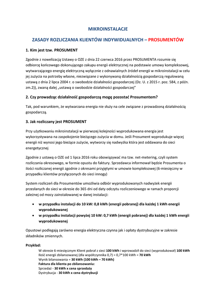 MIKROINSTALACJE ZASADY ROZLICZANIA KLIENTÓW INDYWIDUALNYCH – PROSUMENTÓW 1. Kim jest tzw. PROSUMENT Zgodnie z nowelizacją Ustawy o OZE z dnia 22 czerwca 2016 przez PROSUMENTA rozumie się odbiorcę końcowego dokonującego zakupu energii elektrycznej na podstawie umowy kompleksowej, wytwarzającego energię elektryczną wyłącznie z odnawialnych źródeł energii w mikroinstalacji w celu jej zużycia na potrzeby własne, niezwiązane z wykonywaną działalnością gospodarczą regulowaną ustawą z dnia 2 lipca 2004 r. o swobodzie działalności gospodarczej (Dz. U. z 2015 r. poz. 584, z późn. zm.2)), zwaną dalej „ustawą o swobodzie działalności gospodarczej” 2. Czy prowadząc działalność gospodarczą mogę pozostać Prosumentem? Tak, pod warunkiem, że wytwarzana energia nie służy na cele związane z prowadzoną działalnością gospodarczą. 3. Jak rozliczany jest PROSUMENT Przy użytkowaniu mikroinstalacji w pierwszej kolejności wyprodukowana energia jest wykorzystywana na zaspokojenie bieżącego zużycia w domu. Jeśli Prosument wyprodukuje więcej energii niż wynosi jego bieżące zużycie, wytworzy się nadwyżka która jest oddawana do sieci energetycznej Zgodnie z ustawą o OZE od 1 lipca 2016 roku obowiązywać ma tzw. net-metering, czyli system rozliczania okresowego, w formie opustu do faktury. Sprzedawca informował będzie Prosumenta o ilości rozliczanej energii zgodnie z okresami przyjętymi w umowie kompleksowej (6-miesięczny w przypadku klientów przyłączonych do sieci innogy) System rozliczeń dla Prosumentów umożliwia odbiór wyprodukowanych nadwyżek energii przesłanych do sieci w okresie do 365 dni od daty odczytu rozliczeniowego w ramach proporcji zależnej od mocy zainstalowanej w danej instalacji: w przypadku instalacji do 10 kW: 0,8 kWh (energii pobranej) dla każdej 1 kWh energii wyprodukowanej w przypadku instalacji powyżej 10 kW: 0,7 kWh (energii pobranej) dla każdej 1 kWh energii wyprodukowanej Opustowi podlegają zarówno energia elektryczna czynna jak i opłaty dystrybucyjne w zakresie składników zmiennych. Przykład: W okresie 6-miesięcznym Klient pobrał z sieci 100 kWh i wprowadził do sieci (wyprodukował) 100 kWh Ilość energii zbilansowanej (dla współczynnika 0,7) = 0,7*100 kWh = 70 kWh Wynik bilansowania = 30 kWh (100 kWh – 70 kWh) Faktura dla klienta po zbilansowaniu: Sprzedaż - 30 kWh x cena sprzedaży Dystrybucja - 30 kWh x cena dystrybucji 4. Co się stanie z nadwyżkami w przypadku ich nie wykorzystania? Na wykorzystanie nadwyżek wyprodukowanej energii oraz wprowadzonej do sieci nie wcześniej niż 01.07.2016 Prosument posiada aż 365 dni od daty odczytu rozliczeniowego, po upływie powyższego okresu traci taką możliwość. 5. Czy Prosument może posiadać rozdzielne umowy dotyczące zakupu energii elektrycznej (oddzielna umowa dla energii i dla dystrybucji)? Zgodnie z obecnie obowiązującą nowelizacją ustawy o OZE, Prosument ma obowiązek rozliczenia energii elektrycznej w oparciu o zawartą umowę kompleksową. Prosument nie może posiadać rozdzielonych umów na sprzedaż energii i jej dystrybucję. Podmiot posiadający rozdzielone Umowy nie może zostać uznany za Prosumenta i podlegać rozliczeniom uwzględniającym opusty. 6. Jakie obowiązki informacyjne posiada właściciel Prosumenckiej mikroinstalacji fotowoltaicznej, która została przyłączona do sieci: Konieczność informowania o zmianie rodzaju odnawialnego źródła energii użytego w mikroinstalacji lub jej mocy zainstalowanej elektrycznej w terminie 14 dni od dnia zmiany tych danych, Konieczność informowania o zawieszeniu trwającym od 30 dni do 24 miesięcy lub zakończeniu wytwarzania energii elektrycznej w mikroinstalacji – w terminie 45 dni od dnia zawieszenia lub zakończenia wytwarzania energii elektrycznej z odnawialnych źródeł energii w mikroinstalacji, SZCZEGÓŁOWE ZASADY ROZLICZENIA PROSUMENTA W ZAKRESIE WPROWADZONEJ ENERGII ELEKTRYCZNEJ DO SIECI innogy, REGULUJE ANEKS DO UMOWY KOMPLEKSOWEJ NA SPRZDAŻ I DYSTRYBUCJĘ ENERGII ELEKTRYCZNEJ