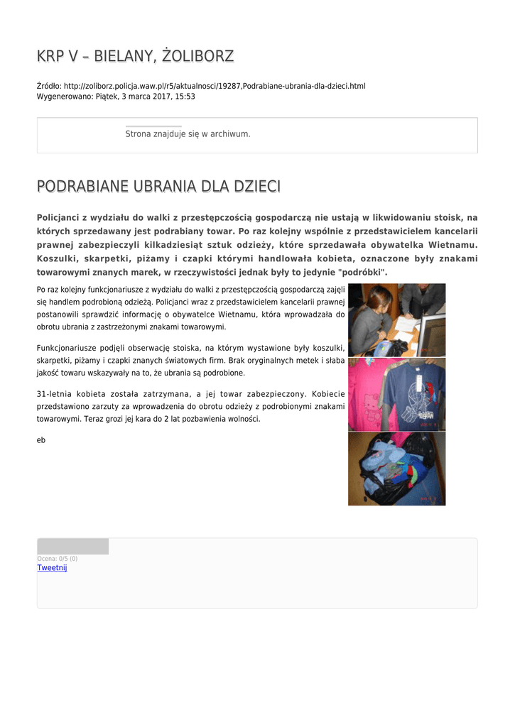KRP V – BIELANY, ŻOLIBORZ Źródło: http://zoliborz.policja.waw.pl/r5/aktualnosci/19287,Podrabiane-ubrania-dla-dzieci.html Wygenerowano: Piątek, 3 marca 2017, 15:53 Strona znajduje się w archiwum. PODRABIANE UBRANIA DLA DZIECI Policjanci z wydziału do walki z przestępczością gospodarczą nie ustają w likwidowaniu stoisk, na których sprzedawany jest podrabiany towar. Po raz kolejny wspólnie z przedstawicielem kancelarii prawnej zabezpieczyli kilkadziesiąt sztuk odzieży, które sprzedawała obywatelka Wietnamu. Koszulki, skarpetki, piżamy i czapki którymi handlowała kobieta, oznaczone były znakami towarowymi znanych marek, w rzeczywistości jednak były to jedynie "podróbki". Po raz kolejny funkcjonariusze z wydziału do walki z przestępczością gospodarczą zajęli się handlem podrobioną odzieżą. Policjanci wraz z przedstawicielem kancelarii prawnej postanowili sprawdzić informację o obywatelce Wietnamu, która wprowadzała do obrotu ubrania z zastrzeżonymi znakami towarowymi. Funkcjonariusze podjęli obserwację stoiska, na którym wystawione były koszulki, skarpetki, piżamy i czapki znanych światowych firm. Brak oryginalnych metek i słaba jakość towaru wskazywały na to, że ubrania są podrobione. 31-letnia kobieta została zatrzymana, a jej towar zabezpieczony. Kobiecie przedstawiono zarzuty za wprowadzenia do obrotu odzieży z podrobionymi znakami towarowymi. Teraz grozi jej kara do 2 lat pozbawienia wolności. eb Ocena: 0/5 (0) Tweetnij