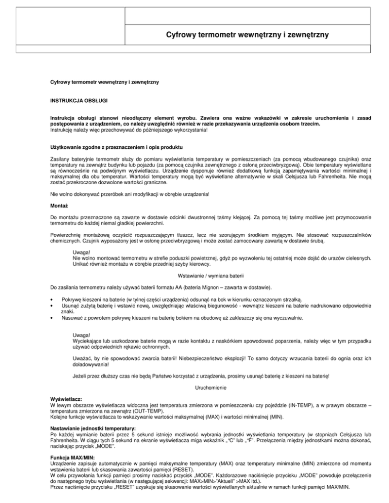 Cyfrowy termometr wewnętrzny i zewnętrzny Cyfrowy termometr wewnętrzny i zewnętrzny m725 34 r8 . Nz a INSTRUKCJA OBSŁUGI Instrukcja obsługi stanowi nieodłączny element wyrobu. Zawiera ona ważne wskazówki w zakresie uruchomienia i zasad postępowania z urządzeniem, co należy uwzględnić również w razie przekazywania urządzenia osobom trzecim. Instrukcję należy więc przechowywać do późniejszego wykorzystania! Użytkowanie zgodne z przeznaczeniem i opis produktu Zasilany bateryjnie termometr służy do pomiaru wyświetlania temperatury w pomieszczeniach (za pomocą wbudowanego czujnika) oraz temperatury na zewnątrz budynku lub pojazdu (za pomocą czujnika zewnętrznego z osłoną przeciwbryzgową). Obie temperatury wyświetlane są równocześnie na podwójnym wyświetlaczu. Urządzenie dysponuje również dodatkową funkcją zapamiętywania wartości minimalnej i maksymalnej dla obu temperatur. Wartości temperatury mogą być wyświetlane alternatywnie w skali Celsjusza lub Fahrenheita. Nie mogą zostać przekroczone dozwolone wartości graniczne. Nie wolno dokonywać przeróbek ani modyfikacji w obrębie urządzenia! Montaż Do montażu przeznaczone są zawarte w dostawie odcinki dwustronnej taśmy klejącej. Za pomocą tej taśmy możliwe jest przymocowanie termometru do każdej niemal gładkiej powierzchni. Powierzchnię montażową oczyścić rozpuszczającym tłuszcz, lecz nie szorującym środkiem myjącym. Nie stosować rozpuszczalników chemicznych. Czujnik wyposażony jest w osłonę przeciwbryzgową i może zostać zamocowany zawartą w dostawie śrubą. Uwaga! Nie wolno montować termometru w strefie poduszki powietrznej, gdyż po wyzwoleniu tej ostatniej może dojść do urazów cielesnych. Unikać również montażu w obrębie przedniej szyby kierowcy. Wstawianie / wymiana baterii Do zasilania termometru należy używać baterii formatu AA (bateria Mignon – zawarta w dostawie). • • • Pokrywę kieszeni na baterie (w tylnej części urządzenia) odsunąć na bok w kierunku oznaczonym strzałką. Usunąć zużytą baterię i wstawić nową, uwzględniając właściwą biegunowość - wewnątrz kieszeni na baterie nadrukowano odpowiednie znaki. Nasuwać z powrotem pokrywę kieszeni na baterię bokiem na obudowę aż zakleszczy się ona wyczuwalnie. Uwaga! Wyciekające lub uszkodzone baterie mogą w razie kontaktu z naskórkiem spowodować poparzenia, należy więc w tym przypadku używać odpowiednich rękawic ochronnych. Uważać, by nie spowodować zwarcia baterii! Niebezpieczeństwo eksplozji! To samo dotyczy wrzucania baterii do ognia oraz ich doładowywania! Jeżeli przez dłuższy czas nie będą Państwo korzystać z urządzenia, prosimy usunąć baterię z kieszeni na baterię! Uruchomienie Wyświetlacz: W lewym obszarze wyświetlacza widoczna jest temperatura zmierzona w pomieszczeniu czy pojeździe (IN-TEMP), a w prawym obszarze – temperatura zmierzona na zewnątrz (OUT-TEMP). Kolejne funkcje wyświetlacza to wskazywanie wartości maksymalnej (MAX) i wartości minimalnej (MIN). Nastawianie jednostki temperatury: Po każdej wymianie baterii przez 5 sekund istnieje możliwość wybrania jednostki wyświetlania temperatury (w stopniach Celsjusza lub Fahrenheita. W ciągu tych 5 sekund na ekranie wyświetlacza miga wskaźnik „°C” lub „°F”. Przełączenia między jednostkami można dokonać, naciskając przycisk „MODE”. Funkcja MAX/MIN: Urządzenie zapisuje automatycznie w pamięci maksymalne temperatury (MAX) oraz temperatury minimalne (MIN) zmierzone od momentu wstawienia baterii lub skasowania zawartości pamięci (RESET). W celu przywołania funkcji pamięci prosimy naciskać przycisk „MODE”. Każdorazowe naciśnięcie przycisku „MODE” powoduje przełączenie do następnego trybu wyświetlania (w następującej sekwencji: MAX>MIN>”Aktuell” >MAX itd.). Przez naciśnięcie przycisku „RESET” uzyskuje się skasowanie wartości wyświetlanych aktualnie w ramach funkcji pamięci MAX/MIN. Konserwacja i czyszczenie Urządzenie nie wymaga konserwacji poza wymianą baterii i sporadycznym czyszczeniem. Do czyszczenia obudowy urządzenia prosimy używać miękkiej lekko zwilżonej ściereczki. Nigdy nie stosować środków szorujących ani chemicznych środków czyszczących. Dane techniczne Zasilanie: 1,5 VDC Baterie: 1 x typ AA Zakres pomiarów temp. wew. -10°C do +50°C Zakres pomiarów temp. zew. -50°C do +70°C Długość kabla czujnika: ok. 3 m Tolerancja: +/- 1°C