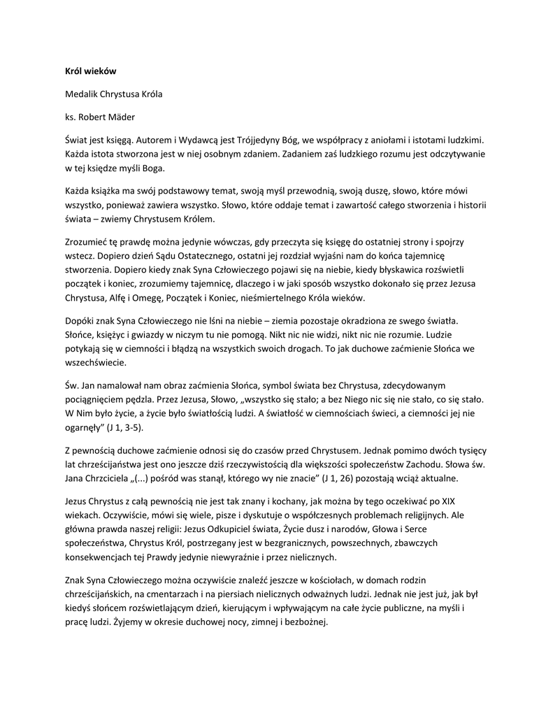 Król wieków Medalik Chrystusa Króla ks. Robert Mäder Świat jest księgą. Autorem i Wydawcą jest Trójjedyny Bóg, we współpracy z aniołami i istotami ludzkimi. Każda istota stworzona jest w niej osobnym zdaniem. Zadaniem zaś ludzkiego rozumu jest odczytywanie w tej księdze myśli Boga. Każda książka ma swój podstawowy temat, swoją myśl przewodnią, swoją duszę, słowo, które mówi wszystko, ponieważ zawiera wszystko. Słowo, które oddaje temat i zawartość całego stworzenia i historii świata – zwiemy Chrystusem Królem. Zrozumieć tę prawdę można jedynie wówczas, gdy przeczyta się księgę do ostatniej strony i spojrzy wstecz. Dopiero dzień Sądu Ostatecznego, ostatni jej rozdział wyjaśni nam do końca tajemnicę stworzenia. Dopiero kiedy znak Syna Człowieczego pojawi się na niebie, kiedy błyskawica rozświetli początek i koniec, zrozumiemy tajemnicę, dlaczego i w jaki sposób wszystko dokonało się przez Jezusa Chrystusa, Alfę i Omegę, Początek i Koniec, nieśmiertelnego Króla wieków. Dopóki znak Syna Człowieczego nie lśni na niebie – ziemia pozostaje okradziona ze swego światła. Słońce, księżyc i gwiazdy w niczym tu nie pomogą. Nikt nic nie widzi, nikt nic nie rozumie. Ludzie potykają się w ciemności i błądzą na wszystkich swoich drogach. To jak duchowe zaćmienie Słońca we wszechświecie. Św. Jan namalował nam obraz zaćmienia Słońca, symbol świata bez Chrystusa, zdecydowanym pociągnięciem pędzla. Przez Jezusa, Słowo, „wszystko się stało; a bez Niego nic się nie stało, co się stało. W Nim było życie, a życie było światłością ludzi. A światłość w ciemnościach świeci, a ciemności jej nie ogarnęły” (J 1, 3-5). Z pewnością duchowe zaćmienie odnosi się do czasów przed Chrystusem. Jednak pomimo dwóch tysięcy lat chrześcijaństwa jest ono jeszcze dziś rzeczywistością dla większości społeczeństw Zachodu. Słowa św. Jana Chrzciciela „(...) pośród was stanął, którego wy nie znacie” (J 1, 26) pozostają wciąż aktualne. Jezus Chrystus z całą pewnością nie jest tak znany i kochany, jak można by tego oczekiwać po XIX wiekach. Oczywiście, mówi się wiele, pisze i dyskutuje o współczesnych problemach religijnych. Ale główna prawda naszej religii: Jezus Odkupiciel świata, Życie dusz i narodów, Głowa i Serce społeczeństwa, Chrystus Król, postrzegany jest w bezgranicznych, powszechnych, zbawczych konsekwencjach tej Prawdy jedynie niewyraźnie i przez nielicznych. Znak Syna Człowieczego można oczywiście znaleźć jeszcze w kościołach, w domach rodzin chrześcijańskich, na cmentarzach i na piersiach nielicznych odważnych ludzi. Jednak nie jest już, jak był kiedyś słońcem rozświetlającym dzień, kierującym i wpływającym na całe życie publiczne, na myśli i pracę ludzi. Żyjemy w okresie duchowej nocy, zimnej i bezbożnej. Zagrożeniem dla świata jest dziś ignorancja. Ona poprzedza zwykle serie katastrof, przychodzących, gdy zaślepieni przywódcy narodów nie potrafią już odróżnić dnia od nocy, prawdy od kłamstwa, ścieżki od przepaści. A jeszcze gorsze niż ślepota i niemożność dostrzeżenia niebezpieczeństwa jest pragnienie pozostania ślepym. W takim właśnie stanie znajduje się dziś ogromna część rodzaju ludzkiego. Jakąkolwiek nazwę przyjmie to zaślepienie: czy liberalizmu, czy neutralności, czy bezwyznaniowości, czy też laicyzmu – grzechem współczesnego świata jest to, że nie pragnie, nie chce już dostrzec na niebie znaku Syna Człowieczego. Jezus Chrystus nie jest już traktowany jako publiczna, życiodajna, władcza Siła. Według dzisiejszych konstytucji nie ma On już nic do powiedzenia w parlamentach, w gabinetach ministrów, w sądach, w szkołach czy w zakładach pracy. Najczęściej Jego Imię jest zaledwie tolerowane w dyskusjach. Jeśli ktoś wie, kim naprawdę jest Chrystus: Stwórca, Zbawiciel, Pan Ziemi, musi też zrozumieć grzech liberalizmu, musi uznać, że ta totalna odmowa uznania duchowego królowania Chrystusa w społeczeństwie jest najcięższym grzechem popełnionym od dnia Wielkiego Piątku. To jest prawdziwe bogobójstwo, popełniane w imię prawa i szatana, prawdziwe antychrześcijaństwo. Kard. Mercier słusznie nazwał oficjalną apostazję narodów największą zbrodnią naszych czasów. Tak traktuje się dziś znak Syna Człowieczego. Ludzie nie chcą, aby błyszczał on na niebie, podobnie jak w Wielki Piątek, gdy wołali „Nie chcemy, aby Ten panował nad nami!”. Ale kiedyś to się zmieni. Świat nie pozostanie liberalny na zawsze. Sztuczne gwiazdy ziemskich rozmiarów, które próbują zaćmić Słońce naszego Pana, runą z nieba. Znak Syna Człowieczego zajaśnieje na nim ponownie, a oni wszyscy ujrzą „Syna Człowieczego siedzącego po prawicy mocy Bożej i przychodzącego w obłokach niebieskich” (Mt 26, 64). Dzień Sądu będzie dniem wielkich objawień, nie tylko w tym sensie, że odtąd nie będzie już więcej tajemnic pomiędzy ludźmi, ale przede wszystkim dlatego, że tego dnia objawiona całemu światu zostanie tajemnica Chrystusa Króla. Będzie to rodzaj koronacji w obliczu wszystkich narodów ziemi i wszystkich mieszkańców nieba. Dogmat o absolutnym, wyłącznym, nieograniczonym Królestwie Chrystusa nad całym rodzajem ludzkim i całym wszechświatem jest jedną z najwspanialszych, ale również najczęściej zapominaną prawdą wiary. Nazwaliśmy świat księgą. W tej księdze Chrystus jest nie tylko najbardziej interesującym i najpiękniejszym rozdziałem, ale też centralną, główną jej myślą. Musimy szukać Jego świętego Imienia na każdej stronie, i wszystko odczytywać w Jego blasku. Kiedy Bóg zachciał powołać stworzenie do istnienia, miał tylko jedną wielką myśl, ogromny plan, główną ideę, jedno słowo, Słowo – Jezusa Chrystusa. Wszystko co istnieje, posiada wartość i znaczenie w Bogu o tyle, o ile jest czł