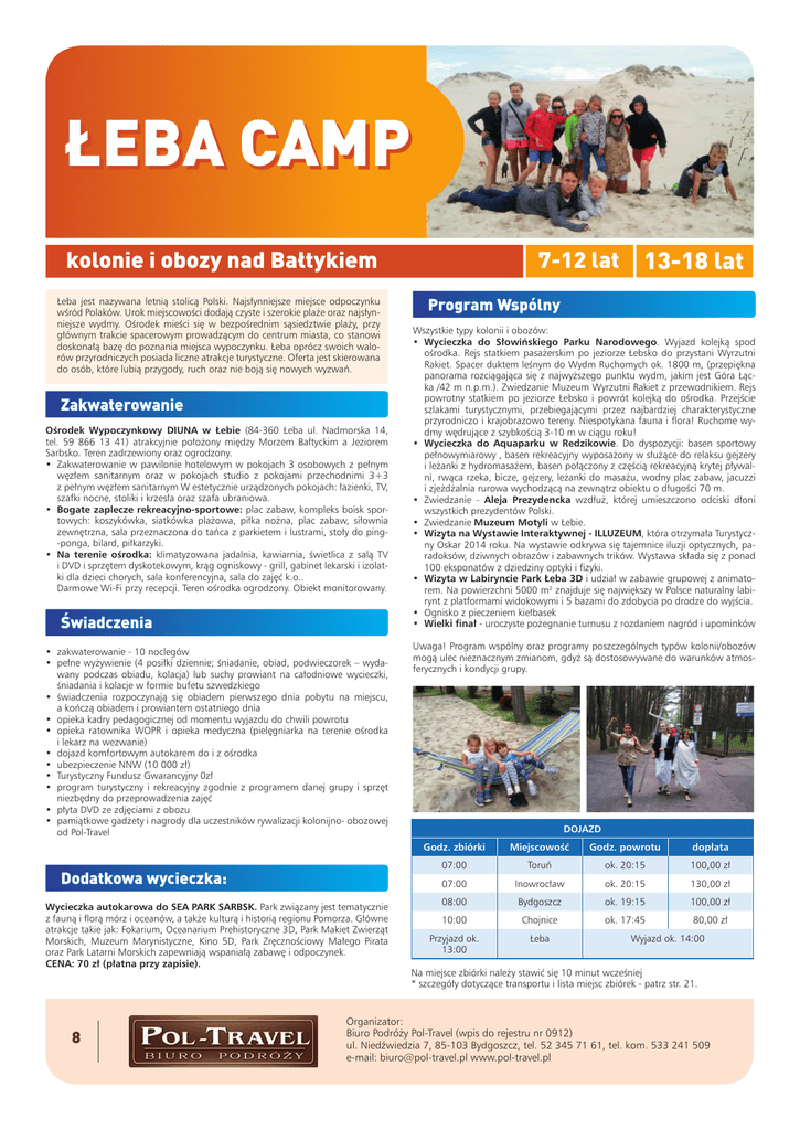 ŁEBA CAMP kolonie i obozy nad Bałtykiem Łeba jest nazywana letnią stolicą Polski. Najsłynniejsze miejsce odpoczynku wśród Polaków. Urok miejscowości dodają czyste i szerokie plaże oraz najsłynniejsze wydmy. Ośrodek mieści się w bezpośrednim sąsiedztwie plaży, przy głównym trakcie spacerowym prowadzącym do centrum miasta, co stanowi doskonałą bazę do poznania miejsca wypoczynku. Łeba oprócz swoich walorów przyrodniczych posiada liczne atrakcje turystyczne. Oferta jest skierowana do osób, które lubią przygody, ruch oraz nie boją się nowych wyzwań. Zakwaterowanie Ośrodek Wypoczynkowy DIUNA w Łebie (84-360 Łeba ul. Nadmorska 14, tel. 59 866 13 41) atrakcyjnie położony między Morzem Bałtyckim a Jeziorem Sarbsko. Teren zadrzewiony oraz ogrodzony. • Zakwaterowanie w pawilonie hotelowym w pokojach 3 osobowych z pełnym węzłem sanitarnym oraz w pokojach studio z pokojami przechodnimi 3+3 z pełnym węzłem sanitarnym W estetycznie urządzonych pokojach: łazienki, TV, szafki nocne, stoliki i krzesła oraz szafa ubraniowa. • Bogate zaplecze rekreacyjno-sportowe: plac zabaw, kompleks boisk sportowych: koszykówka, siatkówka plażowa, piłka nożna, plac zabaw, siłownia zewnętrzna, sala przeznaczona do tańca z parkietem i lustrami, stoły do ping-ponga, bilard, piłkarzyki. • Na terenie ośrodka: klimatyzowana jadalnia, kawiarnia, świetlica z salą TV i DVD i sprzętem dyskotekowym, krąg ogniskowy - grill, gabinet lekarski i izolatki dla dzieci chorych, sala konferencyjna, sala do zajęć k.o.. Darmowe Wi-Fi przy recepcji. Teren ośrodka ogrodzony. Obiekt monitorowany. Świadczenia • zakwaterowanie - 10 noclegów • pełne wyżywienie (4 posiłki dziennie; śniadanie, obiad, podwieczorek – wydawany podczas obiadu, kolacja) lub suchy prowiant na całodniowe wycieczki, śniadania i kolacje w formie bufetu szwedzkiego • świadczenia rozpoczynają się obiadem pierwszego dnia pobytu na miejscu, a kończą obiadem i prowiantem ostatniego dnia • opieka kadry pedagogicznej od momentu wyjazdu do chwili powrotu • opieka ratownika WOPR i opieka medyczna (pielęgniarka na terenie ośrodka i lekarz na wezwanie) • dojazd komfortowym autokarem do i z ośrodka • ubezpieczenie NNW (10 000 zł) • Turystyczny Fundusz Gwarancyjny 0zł • program turystyczny i rekreacyjny zgodnie z programem danej grupy i sprzęt niezbędny do przeprowadzenia zajęć • płyta DVD ze zdjęciami z obozu • pamiątkowe gadżety i nagrody dla uczestników rywalizacji kolonijno- obozowej od Pol-Travel Dodatkowa wycieczka: Wycieczka autokarowa do SEA PARK SARBSK. Park związany jest tematycznie z fauną i florą mórz i oceanów, a także kulturą i historią regionu Pomorza. Główne atrakcje takie jak: Fokarium, Oceanarium Prehistoryczne 3D, Park Makiet Zwierząt Morskich, Muzeum Marynistyczne, Kino 5D, Park Zręcznościowy Małego Pirata oraz Park Latarni Morskich zapewniają wspaniałą zabawę i odpoczynek. CENA: 70 zł (płatna przy zapisie). 8 7-12 lat 13-18 lat Program Wspólny Wszystkie typy kolonii i obozów: • Wycieczka do Słowińskiego Parku Narodowego. Wyjazd kolejką spod ośrodka. Rejs statkiem pasażerskim po jeziorze Łebsko do przystani Wyrzutni Rakiet. Spacer duktem leśnym do Wydm Ruchomych ok. 1800 m, (przepiękna panorama rozciągająca się z najwyższego punktu wydm, jakim jest Góra Łącka /42 m n.p.m.). Zwiedzanie Muzeum Wyrzutni Rakiet z przewodnikiem. Rejs powrotny statkiem po jeziorze Łebsko i powrót kolejką do ośrodka. Przejście szlakami turystycznymi, przebiegającymi przez najbardziej charakterystyczne przyrodniczo i krajobrazowo tereny. Niespotykana fauna i flora! Ruchome wydmy wędrujące z szybkością 3-10 m w ciągu roku! • Wycieczka do Aquaparku w Redzikowie. Do dyspozycji: basen sportowy pełnowymiarowy , basen rekreacyjny wyposażony w służące do relaksu gejzery i leżanki z hydromasażem, basen połączony z częścią rekreacyjną krytej pływalni, rwąca rzeka, bicze, gejzery, leżanki do masażu, wodny plac zabaw, jacuzzi i zjeżdżalnia rurowa wychodzącą na zewnątrz obiektu o długości 70 m. • Zwiedzanie - Aleja Prezydencka wzdłuż, której umieszczono odciski dłoni wszystkich prezydentów Polski. • Zwiedzanie Muzeum Motyli w Łebie. • Wizyta na Wystawie Interaktywnej - ILLUZEUM, która otrzymała Turystyczny Oskar 2014 roku. Na wystawie odkrywa się tajemnice iluzji optycznych, paradoksów, dziwnych obrazów i zabawnych trików. Wystawa składa się z ponad 100 eksponatów z dziedziny optyki i fizyki. • Wizyta w Labiryncie Park Łeba 3D i udział w zabawie grupowej z animatorem. Na powierzchni 5000 m2 znajduje się największy w Polsce naturalny labirynt z platformami widokowymi i 5 bazami do zdobycia po drodze do wyjścia. • Ognisko z pieczeniem kiełbasek • Wielki finał - uroczyste pożegnanie turnusu z rozdaniem nagród i upominków Uwaga! Program wspólny oraz programy poszczególnych typów kolonii/obozów mogą ulec nieznacznym zmianom, gdyż są dostosowywane do warunków atmosferycznych i kondycji grupy. DOJAZD Godz. zbiórki Miejscowość Godz. powrotu dopłata 07:00 Toruń ok. 20:15 100,00 zł 07:00 Inowrocław ok. 20:15 130,00 zł 08:00 Bydgoszcz ok. 19:15 100,00 zł 10:00 Chojnice ok. 17:45 80,00 zł Przyjazd ok. 13:00 Łeba Wyjazd ok. 14:00 Na miejsce zbiórki należy stawić się 10 minut wcześniej * szczegóły dotyczące transportu i lista miejsc zbiórek - patrz str. 21. Organizator: Biuro Podróży Pol-Travel (wpis do rejestru nr 0912) ul. Niedźwiedzia 7, 85-103 Bydgoszcz, tel. 52 345 71 61, tel. kom. 533 241 509 e-mail: [email protected] www.pol-travel.pl ŁEBA CAMP KOLONIE MORSKA PRZYGODA (7-12 LAT) Młodym uczestnikom proponujemy program opierający się na zdobywaniu różnych umiejętności, połączony z bogatą ofertą rekreacyjno- sportową. Wszystkie zajęcia prowadzone są w formie zabaw przez kadrę pedagogiczną, pomagającą odkryć dziecku świata nie ogra