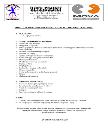 turystyka dzieci i młodzieży 31-534 Kraków, ul. Masarska 9/98 fax (+48 12) 656-61-24 REGON 357052776 NIP 945-133-90-18 PROPOZYCJE PODSTAWOWEGO WYPOSAŻENIA UCZESTNIKA WYJAZDU LETNIEGO 1. DOKUMENTY: • legitymację szkolną 2. • • • • • • • • • • • • • • • • SPRZĘT I WYPOSAŻENIE OSOBISTE: Walizka lub torba podróżna mały plecak na wycieczki buty /najlepiej typu „Pionier” z karbowanymi podeszwami, umożliwiającymi odbywanie wycieczek na szlak turystyczny lekkie obuwie do chodzenia po budynku tenisówki lub adidasy spodnie, kurtka przeciwdeszczowa z kapturem Ciepła bluza typu polar, gruby sweter lub dwa Skarpety /większa ilość/ Dres lub coś sportowego tzw. na luzie Bielizna osobista Strój kąpielowy Podkoszulki , spodenki większa ilość Strój do gimnastyki Sweter gruby, sweter typu golf z długimi rękawami Piżama okulary przeciwsłoneczne 3. • • • • • PRZYBORY TOALETOWE: Chusteczki do nosa /przynajmniej trzy paczki/ Ręcznik, mydło, szczotka i pasta do zębów Grzebień, krem do rąk i twarzy Szampon krem przeciwsłoneczny z filtrem do opalania 4. INNE: • • Zasada: „ Brać ze sobą wszystko, co jest konieczne, potrzebne, nie brać niczego, co zbędne” na czas przejazdu autokarem proponujemy dać dziecku kanapeczkę i napój Każdy uczestnik powinien zabrać ze sobą pieniążki dodatkowo na ewentualne wydatki typu pamiątka Pieniądze (drobne) prosimy wsadzić do koperty z imieniem i nazwiskiem dziecka- będą przechowywane u wychowawcy ŻYCZYMY MIŁYCH WRAŻEŃ !