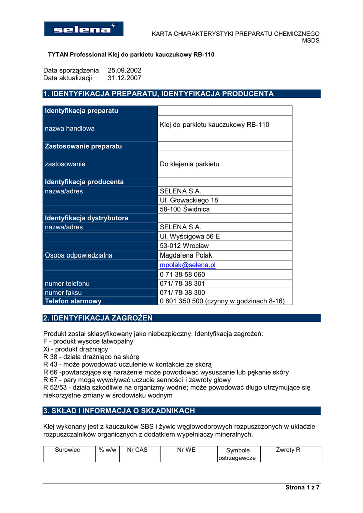 KARTA CHARAKTERYSTYKI PREPARATU CHEMICZNEGO MSDS TYTAN Professional Klej do parkietu kauczukowy RB-110 Data sporządzenia Data aktualizacji 25.09.2002 31.12.2007 1. IDENTYFIKACJA PREPARATU, IDENTYFIKACJA PRODUCENTA Identyfikacja preparatu Klej do parkietu kauczukowy RB-110 nazwa handlowa Zastosowanie preparatu zastosowanie Do klejenia parkietu Identyfikacja producenta nazwa/adres SELENA S.A. Ul. Głowackiego 18 58-100 Świdnica Identyfikacja dystrybutora nazwa/adres Osoba odpowiedzialna numer telefonu numer faksu Telefon alarmowy SELENA S.A. Ul. Wyścigowa 56 E 53-012 Wrocław Magdalena Polak [email protected] 0 71 38 58 060 071/ 78 38 301 071/ 78 38 300 0 801 350 500 (czynny w godzinach 8-16) 2. IDENTYFIKACJA ZAGROśEŃ Produkt został sklasyfikowany jako niebezpieczny. Identyfikacja zagroŜeń: F - produkt wysoce łatwopalny Xi - produkt draŜniący R 38 - działa draŜniąco na skórę R 43 - moŜe powodować uczulenie w kontakcie ze skórą R 66 -powtarzające się naraŜenie moŜe powodować wysuszanie lub pękanie skóry R 67 - pary mogą wywoływać uczucie senności i zawroty głowy R 52/53 - działa szkodliwie na organizmy wodne; moŜe powodować długo utrzymujące się niekorzystne zmiany w środowisku wodnym 3. SKŁAD I INFORMACJA O SKŁADNIKACH Klej wykonany jest z kauczuków SBS i Ŝywic węglowodorowych rozpuszczonych w układzie rozpuszczalników organicznych z dodatkiem wypełniaczy mineralnych. Surowiec % w/w Nr CAS Nr WE Symbole ostrzegawcze Zwroty R Strona 1 z 7 KARTA CHARAKTERYSTYKI PREPARATU CHEMICZNEGO MSDS TYTAN Professional Klej do parkietu kauczukowy RB-110 Benzyna lekka traktowana wodorem Aceton Izopropanol Kalafonia < 25 64742-49-0 265-151-9 F, Xn, Xi, N R11, R38, R51/53, R65, R66, R67 <5 <5 < 20 67-64-1 67-63-0 8050-09-7 200-662-2 200-661-7 232-457-7 F, Xi F, Xi Xi R11, R36, R66, R67 R11, R36, R67 R 43 * zawartość benzenu < 0,1% (v/v) , zastosowano Notę H i Notę P 4. PIERWSZA POMOC Zatrucia inhalacyjne Poszkodowanego wyprowadzić/wynieść z miejsca naraŜenia na opary, przytomnego ułoŜyć w pozycji półsiedzącej, zapewnić spokój, nieprzytomnego ułoŜyć w pozycji bocznej ustalonej, oczyścić jamę ustną i nos z wydzielin. W przypadku duszności podawać tlen. W przypadku braku oddechu stosować sztuczne oddychanie za pomocą aparatu oddechowego. Zapewnić opiekę lekarską. Kontakt ze skórą Zdjąć zanieczyszczoną odzieŜ, zanieczyszczoną skórę zmyć wodą z detergentem. Kontakt z oczami Płukać przy otwartych powiekach pod strumieniem bieŜącej wody przez kilka minut. Skonsultować się z lekarzem. Zatrucia doustne Przy trwałych dolegliwościach skontaktować się z lekarzem. 5. POSTĘPOWANIE W PRZYPADKU POśARU Odpowiednie środki gaśnicze Dwutlenek węgla, proszek gaśniczy lub mgła wodna. Większy poŜar zwalczać strumieniem wody lub pianą odporną na działanie alkoholu. Środki gaśnicze, których nie wolno uŜywać ze względów bezpieczeństwa Woda pełnym strumieniem. Środki ochrony indywidualnej W przypadku poŜaru kleju naleŜy uŜywać aparatów tlenowych. 6. POSTĘPOWANIE W PRZYPADKU NIEZAMIERZONEGO UWOLNIENIA DO ŚRODOWISKA Indywidualne środki ostroŜności Zapewnić wystarczającą wentylację. Źródła zapłonu trzymać w bezpiecznej odległości. Środki ostroŜności w zakresie ochrony środowiska Nie dopuścić do przedostania się do kanalizacji , rowów odwadniających, wód powierzchniowych i gruntowych oraz do gleby. Metody oczyszczania Strona 2 z 7 KARTA CHARAKTERYSTYKI PREPARATU CHEMICZNEGO MSDS TYTAN Professional Klej do parkietu kauczukowy RB-110 Zebrać za pomocą materiału wiąŜącego (piasek, ziemia okrzemkowa, uniwersalna substancja wiąŜąca, trociny). 7. POSTĘPOWANIE Z PREPARATEM I JEGO MAGAZYNOWANIE Obchodzenie się z substancją Środki ostroŜności gwarantujące bezpieczne obchodzenie się z substancją: unikać wdychania oparów unikać rozpylania niezbędna wentylacja miejscowa i ogólna Metody zapobiegania poŜarom i eksplozji trzymać z dala od źródeł zapłonu - nie palić tytoniu zabezpieczyć przed wyładowaniami elektryczności statycznej Magazynowanie Składować w miejscu suchym i chłodnym (w temp. do 30oC), unikać miejsc nasłonecznionych, źródeł ciepła i zapłonu. Nie palić papierosów. OpróŜnione pojemniki ze względu na duŜe ciśnienie par otworzyć i dokładnie wysezonować. Przechowywać w pomieszczeniach zamkniętych, oznakowanych. 8. KONTROLA NARAśENIA I ŚRODKI OCHRONY INDYWIDUALNEJ W przypadkach, w których istnieje prawdopodobieństwo krótkiego kontaktu ze skórą naleŜy stosować indywidualną odzieŜ ochronną oraz środki ochrony indywidualnej (szczelne okulary ochronne, rękawice gumowe). W przypadku moŜliwego kontaktu z oczami zaleca się uŜywanie szczelnych okularów ochronnych . Klej ze względu na skład chemiczny moŜe w przypadku kontaktu z okiem wywołać jego podraŜnienie. Składniki wraz z kontrolowanymi wartościami granicznymi na stanowisku pracy: (zgodnie z Rozporządzeniem Ministra Pracy i Polityki Socjalnej z dnia 29.11.2002r. w sprawie najwyŜszych dopuszczalnych stęŜeń i natęŜeń czynników szkodliwych dla zdrowia w środowisku pracy ( Dz.U. Nr 217, poz. 1833 z późn.zm.)) aceton: NDS: NDSCh: NDSP: - 600 mg/m3 1800 mg/m3 izopropanol: NDS: 900 mg/m3 NDSCh: 1200 mg/m3 NDSP: - 9. WŁAŚCIWOŚCI FIZYCZNE I CHEMICZNE Postać fizyczna Barwa wysokolepka ciecz BeŜowa Zapach słaby, rozpuszczalników alifatycznych Strona 3 z 7 KARTA CHARAKTERYSTYKI PREPARATU CHEMICZNEGO MSDS TYTAN Professional Klej do parkietu kauczukowy RB-110 Temperatura wrzenia Temperatura topnienia o 62-100 C (mieszanina izomerycznych węglowodorów) o 56 C (aceton) Nie dotyczy 4 o PręŜność par 10,13 x 10 Pa (760 mm Hg) w temp. 56,1 C 3 Gęstość 1,20 ± 0,05 g/cm o Temperatura zapłonu -30 C Granica wybuchowości dolna granica 0,9% (mieszanina węglowodorów) 3,0% (dla acetonu) górna granica 8,0% (mieszanina węglowodorów) 11,0% (dla acetonu) Temperatura 