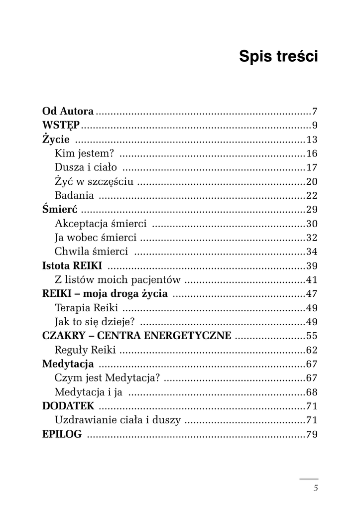 Spis treœci Od Autora .........................................................................7 WSTĘP ..............................................................................9 śycie ..............................................................................13 Kim jestem? ...............................................................16 Dusza i ciało ..............................................................17 śyć w szczęściu .........................................................20 Badania ......................................................................22 Śmierć ............................................................................29 Akceptacja śmierci ....................................................30 Ja wobec śmierci ........................................................32 Chwila śmierci ..........................................................34 Istota REIKI ...................................................................39 Z listów moich pacjentów .........................................41 REIKI – moja droga Ŝycia .............................................47 Terapia Reiki ..............................................................49 Jak to się dzieje? ........................................................49 CZAKRY – CENTRA ENERGETYCZNE ........................55 Reguły Reiki ...............................................................62 Medytacja ......................................................................67 Czym jest Medytacja? ................................................67 Medytacja i ja ............................................................68 DODATEK ......................................................................71 Uzdrawianie ciała i duszy .........................................71 EPILOG ..........................................................................79 5 6 Od autora Kocham cię Ŝycie. Kocham wszystko, co istnieje na Ziemi – kaŜde źdźbło trawy, kamień leŜący na drodze, powiew wiatru, deszcz, śnieg skrzypiący pod nogami i ciebie słońce, które oświetlasz mą drogę, abym nie zbłądziła. śycie, jesteś dla mnie nauczycielem – cierpliwym, wymagającym, stawiającym coraz to nowe wyzwania. Abecadłem, dzięki któremu uczę się, jak dojrzeć to, czego nie widzą oczy, usłyszeć to, co ukryte w zgiełku codzienności, mówić całą sobą. Obdarowałeś mnie radością, cierpieniem, samotnością, rozczarowaniami, problemami oraz poraŜkami, wszystkim co budzi we mnie świadomość mocy mojej Duszy. To doświadczanie emocji przygotowuje mnie do wypełnienia mojego zadania na Ziemi. KaŜdy nowy dzień sprawia, Ŝe pomimo niepogody, wciąŜ zbliŜam się do światła, które potrafi odsłonić tajemnicę sensu naszego istnienia. Wiem, Ŝe kiedy robię to, do czego jestem stworzona, otula mnie energia Reiki. Mam poczucie celu, angaŜuję się w pracę duszy. Wówczas rozkwitam, otrzymując w zamian słodycz spełnienia, która po prostu jest. Wystarczy wyciągnąć rękę. Dziękuję za dar, jaki otrzymałam. Barbara 7 8 WSTÊP KaŜdego dnia rodzimy się i umieramy. Mamy róŜne doświadczenia – pokonujemy przeciwności losu, przeŜywamy chwile radości, a jednak wciąŜ czujemy niedosyt. Stawiamy sobie cele – zdobywamy wykształcenie, poszukujemy prawdziwej miłości, budujemy dom, sadzimy drzewo, zwiedzamy świat i nawet jeśli osiągamy sukcesy jesteśmy zagubieni. Pragniemy znaleźć sens Ŝycia wszędzie i we wszystkim – tylko nie w sobie. „Uwięzieni w ciemnej, ciasnej celi, którą zbudowaliśmy własnymi rękami i którą uwaŜamy za własny wszechświat, nawet nie umiemy zacząć sobie wyobraŜać innego wymiaru rzeczywistości”.* Jednym z naszych Ŝyciowych zadań jest nauka. NaleŜy ją jednak pojmować nie tylko jako zdobywanie wiedzy czy gromadzenie doświadczeń, ale równieŜ czerpanie mądrości, przekazywanej z pokolenia na pokolenie. Owa docierająca w róŜnych formach mądrość przodków stanowi o nas źródło prawdy, a jednocześnie jest rozwiązaniem trosk i obaw. Dzięki niej moŜemy znaleźć odpowiedź na pytania, które jakŜe często zadajemy sobie w trudnych momentach Ŝycia: Po co? Dlaczego? W jakim celu? Mądrość tę stanowi Reiki, znajdziemy ją teŜ w medytacji. To dziedzictwo, z którego warto korzystać, nie * Sogjal Rinpocze, Tybetańska Księga śycia i Umierania, Bertelsmann Media, Waszawa 2001, str. 61 9 kryje w sobie Ŝadnych tajemnic, ani nie wyposaŜy nas w magiczne siły. Jest jednak ścieŜką pozwalającą na lepsze poznanie siebie, którą moŜe podąŜać kaŜdy człowiek. Reiki i medytację moŜna porównać do alfabetu. Jego znajomość pomaga w rozmowie z własnym wnętrzem, rozwija intuicję. Taka rozmowa uzmysłowi nam, jakich cierpień przysparza pogoń za Ŝyciem zewnętrznym, jeśli nie zadbamy o nasze wnętrze, pozwoli pojąć, Ŝe człowiek sam dla siebie moŜe być źródłem zmartwień i kłopotów – brakiem szczęścia. Obie techniki uspakajają umysł, wyciszają emocje, zrywają łańcuchy ograniczeń, a wprowadzając harmonię uzdrawiają ciało, duszę i umysł. To jeden z wielu etapów rozwoju duchowego, który wskazuje drogę ku światłu. Staje się ona wówczas bardziej zrozumiała, mniej kręta, po prostu łatwiejsza. To klucz do bramy spełnienia, którą kaŜdy z nas moŜe otworzyć, sposób na powrót do siebie samych. „Jeśli jesteśmy przygotowani, to zarówno śycie, jak i Śmierć niosą za sobą wielką nadzieję. Nauki te odkryw ją przed nami szansę na zdobycie zdumiewającej, nieograniczonej wolności, która pozwoli nam wybrać śmierć i narodziny”. * Celem niniejszej publikacji jest wykazanie przydatności medytacji i Reiki na drodze do oświecenia. Uczą nas one czytania „księgi Ŝycia”, dzięki czemu stajemy się bardziej świadomi jego sensu, z większą pokorą przyjmujemy to, co daje nam * TamŜe, str. 31 10 los. Zaczynamy rozumieć, Ŝe wszystk