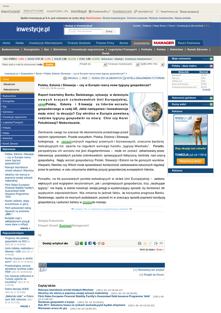 Grupa: Spółka Inwestycje.pl S.A. jest notowana na rynku akcji NewConnect. Strona korporacyjna, Centrum prasowe , Relacje Inwestorskie, Nasze portale. Szukaj w Inwestycje.pl Kontakt | Reklama | Mapa Strony | Forum | Inwestycje.pl dla komórek | RSS Szukaj Home Giełda Inwestycje Alternatywne Finanse Osobiste Finanse Firmy Biznes Gospodarka Pasa ż finansowy Budownictwo | Energetyka | Gaz | Górnictwo | Inwestycje zagraniczne | Logistyka/Transport | Polityka | Polska | Rolnictwo | Rynek Zdrowia | Świat Moje notowania WIG 47899.5 -1.0% | WIG20 2757.30 -1.3% | DOLAR 2.88 +0.11% | EURO 3.88 +0.53% Notowania» Katalogi» Inwestycje mieszkaniowe» l ter.. Wpisz swój e-mail by otrzymywać newse Fundusze inwestycyjne: Przejdź do: Zapisz Spółki GPW I NC: Polska - dane makro Wska źnik inwestycje.pl > Gospodarka > Świat > Polska, Estonia i Słowacja – czy w Europie rosną nowe tygrysy gospodarcze? > DRUKUJ Świat RSS DODAJ DO ULUBIONYCH Bezrobocie WYŚLIJ ZNAJOMEMU FORUM PKB (r/r) Inflacja (r/r) Aktualności Stopa referencyjna Polska, Estonia i Słowacja – czy w Europie rosną nowe tygrysy gospodarcze? Produkcja przemysłowa (r/r) 20.01.2011 08:08 czwartek Makroekonomia (rozwi ń) (zwi ń) Warto ść 11,7% 4,2% 3,1% 3,75% 10,1% [więcej] Raport kwartalny Banku Światowego, sytuację w dziesi ęciu Budownictwo n o w y c h k r a j a c h c z ło n k o w s k i c h U n i i E u r o p e j s k i e j , Energetyka uznałPolskę, Gaz Estonię i S łowację z a l i d e r ó w w z r o s t u gospodarczego w całej UE. Jakie następstwa i konsekwencje Górnictwo rodzime tygrysy gospodarki na miar ę Chin czy Korei Logistyka/Transport Południowej? Niekoniecznie. (rozwi ń) Kursy walut (rozwi ń) Reklama może mie ć ta decyzja? Czy wkrótce w Europie powstan ą Inwestycje zagraniczne Notowania giełdowe Polityka Zwrócenie uwagi na szersze t ło ekonomiczne przestrzega przed Polska zbytnim optymizmem. Przede wszystkim, Polska, Estonia i Słowacja Rolnictwo funkcjonują w ramach unijnych regulacji prawnych i biznesowych, znacznie bardziej Rynek Zdrowia restrykcyjnych ni ż oparte na regu łach wolnego handlu „tygrysy Wschodu ”. Ponadto, Najnowsze perspektywa ich wzrostu nie jest d ługoterminowa – może on zosta ć zahamowany przez Polska, Estonia i Słowacja – czy w Europie rosną nowe tygrysy gospodarcze? Rosnące bezrobocie wśród młodych Włochów Ukraińcy nie wierzą w poprawę swojej sytuacji materialnej Fitch Rates European Financial Stability Facility's Guaranteed Debt Issuance Programme 'AAA' Koniec sielanki, stopy procentowe w gór ę interwencję pozostałych pa ństw członkowskich, sprawujących faktyczną kontrolę nad unijną gospodarką. Nagły wzrost gospodarczy Polski, S łowacji i Estonii na tle gorszych wyników Hiszpanii, Niemiec czy Włoch może spowodować konieczność zastosowania sztucznych regulacji przez te państwa, w celu utrzymania stabilnej pozycji gospodarczej europejskich liderów. Ponadto, na tle pozosta łych pa ństw wchodzących w sk ład Unii Europejskiej – zarówno większych pod wzgl ędem terytorialnym, jak i pot ężniejszych gospodarczo, trzy „raczkujące tygrysy” nie b ędą w stanie rozwinąć swojej potęgi w wystarczający sposób, by dorównać ich azjatyckim odpowiednikom. Nie zmienia to jednak faktu, że korzystna prognoza Banku Światowego, oparta na mocnych podstawach, pozwoli im w znaczący sposób poprawić kondycję gospodarczą i pokonać bariery w drodze do rozwoju. Fitch potwierdził rating Aquanet na poziomie „BBB-” Brytyjski rząd z zakłopotaniem przyjął nowe dane o inflacji więcej » Najpopularniejsze Prognozy dla polskiej gospodarki na 2011 r. (2011-01-17 16:24:02) Reklama >> Lokata 7% z codzienną kapitalizacj ą odsetek << Siergiej Krasulenko Ekspert Growth Business Management kg Dodaj artykuł do: Jutro indeksy nastrojów z Niemiec i USA (2011-01-17 Wróć do działu: Świat » 14:49:38) Koniec kryzysu w strefie euro? (2011-01-17 10:48:01) Przedwstępna umowa sprzedaży cywilnej części HSW (2011-01-18 09:40:43) Komentarze (0) [+] Skomentuj ten artykuł [»] Przejdź do Forum Czy sytuacja polityczna w Tunezji wpłynie na turystykę? (2011-01-18 13:53:49) Czytaj także: Dobra decyzja UOKiK Rosnące bezrobocie wśród młodych Włochów [2011 -01 -19 18:35:17] Ukraińcy nie wierzą w poprawę swojej sytuacji materialnej [2011 -01 -19 18:28:05] Fitch Rates European Financial Stability Facility's Guaranteed Debt Issuance Programme 'AAA' (2011-01-17 13:33:05) „Bałkański szlak” w Polsce wart 600 milionów (201101-18 12:17:03) więcej » [2011 -01 - 19 17:48:19] Światowe gospodarki a kryzys [2011 -01 -19 13:20:01] Rok 2011: Sekularna hossa na rynkach wschodzących będzie utrzymana [2011 -01 -19 12:25:33] Warszawa wraca do gry [2011 -01 -19 10:05:47] W Tunezji i Algierii już wrze – rekordowe ceny żywności coraz większym zagrożeniem [2011 -01 -19 W Tunezji i Algierii już wrze – rekordowe ceny żywności coraz większym zagrożeniem [2011 -01 -19 09:47:28] Dolar tanieje w Azji, akcje nadal drożeją [2011 -01 -19 09:11:27] Solidarność krytycznie o propozycji zmian w OFE [2011 -01 -18 18:44:45] PO krytykuje projekt PiS w sprawie OFE [2011 -01 -18 18:05:48] Produkty finansowe w inwestycje.pl Giełda: IPO Inwestycje Alternatywne: Waluty Instrumenty Dłużne GPW Finanse Osobiste: Fundusze Inwestycyjne Biznes: E-biznes Fuzje Przetargi Rynek i konkurencja NewConnect Fundusze Hedgingowe Gospodarka: Inwestycje zagraniczne Finanse Firmy: Venture Capital Narzędzia: Wywiady Pasaż finansowy: Emerytura Faktoring Windykacja Oferty nieruchomości: Mieszkania Oferty pracy: Finanse Forum-prawne.pl: Prawo administracyjne Kredyty Banki Energetyka Nowo ści inwestycyjne Fundusze Inwestycyjne Działki Lokale u żytkowe Prawo Nieruchomo ści Prawo autorskie Gaz Oferty zagraniczne Logistyka Rolnictwo Ubezpieczenia w Firmie Lokaty Strefa VIP Rynek Zdrowia Media Psychologia biznesu Polityka Kadry i Płace Notowania giełdowe