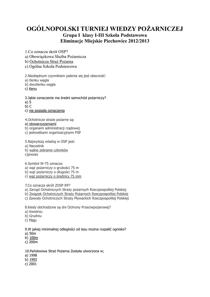OGÓLNOPOLSKI TURNIEJ WIEDZY POŻARNICZEJ Grupa I klasy I-III Szkoła Podstawowa Eliminacje Miejskie Piechowice 2012/2013 1.Co oznacza skrót OSP? a) Obowiązkowa Służba Pożarnicza b) Ochotnicza Straż Pożarna c) Ogólna Szkoła Podstawowa 2.Niezbędnym czynnikiem palenia się jest obecność: a) tlenku węgla b) dwutlenku węgla c) tlenu 3.Jakie oznaczenie ma średni samochód pożarniczy? a) Ś b) C c) nie posiada oznaczenia 4.Ochotnicze straże pożarne są: a) stowarzyszeniami b) organami administracji rządowej c) jednostkami organizacyjnymi PSP 5.Najwyższą władzą w OSP jest: a) Naczelnik b) walne zebranie członków c)prezes 6.Symbol W-75 oznacza: a) wąż pożarniczy o grubości 75 m b) wąż pożarniczy o długości 75 m c) wąż pożarniczy o średnicy 75 mm 7.Co oznacza skrót ZOSP RP? a) Zarząd Ochotniczych Straży pożarnych Rzeczpospolitej Polskiej b) Związek Ochotniczych Straży Pożarnych Rzeczpospolitej Polskiej c) Zawody Ochotniczych Straży Pływackich Rzeczpospolitej Polskiej 8.Kiedy obchodzone są dni Ochrony Przeciwpożarowej? a) Kwietniu b) Grudniu c) Maju 9.W jakiej minimalnej odległości od lasu można rozpalić ognisko? a) 50m b) 100m c) 200m 10.Państwowa Straż Pożarna Została utworzona w; a) 1998 b) 1992 c) 2001 11.Odznaka `Wzorowy Strażak` nadawana jest przez: a) Komendanta Wojewódzkiego b) Związek OSP RP c) Prezesa jednostki do której należy strażak 12.Jaki jest numer alarmowy do Straży Pożarnej? a) 998 lub 112 b) 997 c) 999 13.Czy udzielenie pierwszej pomocy należy do obowiązków strażaka? a) nie b) tak c) tak,jeżeli posieda odpowiednie uprawnienia 14.Jaki narząd jest najbardziej wrażliwy na niedotlenienie? a) serce b) mózg c) nerki 15.Do podręcznego sprzętu gaśniczego nie zaliczany: a) prądownicy pianowej b) koca gaśniczego c) gaśnicy 16.Jakich urządzeń strażacy używają do uwalniania poszkodowanych w wypadkach samochodowych? a) pił do cięcia drewna b) narzędzi hydraulicznych c) toporków strażackich 17.Czy istnieją gaśnice uruchamiane poprzez odwrócenie dnem do góry?: a) tak b) nie c) tak(np. Gaśnica pianowa) 18.Ile razy w roku należy usuwać zanieczyszczenia z przewodów kominowych w budynku mieszkalnym? a) raz na rok b) co najmniej 4 razy c) co miesiąc 19.Kto jest patronem strażaków? a) Św. Florian b) Św. Piotr i Paweł c) nie ma patrona strażaków 20.Kiedy obchodzony jest Międzynarodowy Dzień Strażaka? a) 4 maja b) 11 września c) 24 grudnia 21.Co oznacza skrót JOT? a) Jednostka Ogólno-Taktyczna b) Jednostka Operacyjno - Techniczna c) Jednostki Operacyjna i Techniczna 22.Co oznacza skrót MDP? a) Mała drabina pożarnicza b) Młodzieżowa Drużyna Pożarnicza c) Mała Drużyna Pożarnicza 23.Co oznacza skrót KSRG? a) Krajowy System Ratowniczo-Gaśniczy b) Koordynacja Systemu Ratownictwa Gaśniczego c)Krakowski Skład Ratowniczo Gaśniczy 24.Minimum ile osób potrzeba do stworzenia OSP? a) 25 b) 15 c) nie ma określonej liczy osób 25.Poszkodowany oparzony wymaga: a) polania spirytusem rany b) chłodzenia rany c) bandażowania rany 26.Jaki gaz wydziela się podczas pożaru stwarzając zatrucie się: a) wodór b) tlenek węgla c) tlen 27.Odpady niebezpieczne to: a) szkło b) baterie c) papier 28.Do gaszenia pożarów urządzeń elektrycznych używamy: a) gaśnicy pianowej b)gaśnicy proszkowej c) wody 29.Wypalanie słomy i pozostałości roślinnych na polach jest: a) dozwolone, w odległości co najmniej 100 m od zabudowań, b) zabronione, c) dozwolone, w odległości co najmniej 150 m od lasów, 30. U nieprzytomnej ofiary wypadku akcję reanimacyjną należy prowadzić: a) do chwili przybycia karetki pogotowia, b) przez co najmniej 30min, c) według uznania ratownika