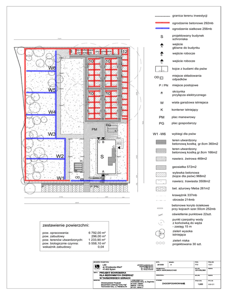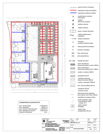 granica terenu inwestycji ogrodzenie betonowe 292mb ogrodzenie siatkowe 256mb psy podlegające psy agresywne kwarantannie 2% 2% projektowany budynek schroniska A wejście główne do budynku 12 B 2% wejście robocze 2% 2% 2% 8 S 2% C wejście robocze 2% 2% W6 2% 10 2% 10 2% 2% 2% 2% 2% kojce z budami dla psów miejsce składowania odpadków OD P / PN PG PM SE skrzynka przyłącza elektrycznego W wiata garażowa istniejaca K kontener istniejący 2% 2% 2% 2% W4 2% 2% 2% 2% 10 2% 10 2% W5 miejsce postojowe PM plac manewrowy PG plac gospodarczy K W3 W1 -W6 teren utwardzony betonową kostką gr.6cm 360m2 C B C W2 S H wybiegi dla psów teren utwardzony betonową kostką gr.8cm 166m2 nawierz. żwirowa 469m2 geosiatka 572m2 W A W1 OD - 0 ,10 K IERU NEK SPADKU N AWIE RZCHNI 1% - 0 ,04 K IERU NEK SPADKU N AWIE RZCHNI 2% +- 0 ,00 - 0 ,10 SE P P PN wylewka betonowa (kojce dla psów) 968m2 nawierz. trawiasta 3508m2 bet. ażurowy Meba 261m2 krawężnik 337mb obrzeże 214mb betonowe koryto ściekowe przy kojcach szer.50cm 252mb oświetlenie punktowe 22szt. zestawienie powierzchni: pow. opracowania: pow. zabudowy pow. terenów utwardzonych: pow. biologicznie czynna: wskaźnik zabudowy: 6 792,00 m² 296,00 m² 1 233,90 m² 5 558,10 m² 0,04 punkt czerpalny wody z końcówką do węża - zasięg 15 m zieleń wysoka istniejąca zieleń niska projektowana 30 szt. PW 1501 AW-01
