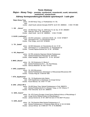 Tenis Stołowy Rejon - Nowy Targ - powiaty: myślenicki, nowotarski, suski, tatrzański, wadowicki, oświęcimski Adresy korespondencyjne klubów sportowych i sale gier Rejon Nowy Targ adres: 34-400 Nowy Targ, ul. Podhalańska 14 / 55, sala: osoba: Józef Guzik członek Zarządu KOZTS tel./0-18/ 2668524 , 0 504 175 989 1. KS „Gorce” adres: 34-400 Nowy Targ, Al. 1000-lecia 74, tel. fax. /0-18/ 2662661 sala: Sala KS „Gorce” Al. 1000-lecia 74, Osoba: Józef Guzik tel./0-18/ 2668524 , 0 504 175 989 2. ULKS „Lachowice” adres: 34-232 Lachowice, Lachowice 232 B tel. /0-33/ 8748017 sala: Gimnazjum Nr 2 w Lachowicach 232 B Osoba: Piotr Grajny tel./0-33/ 8748428 3. TS „Sokół” adres: 34-500 Zakopane, Ul. Nowotarska 42, tel. /0-18/ sala: Gimnazjum nr 1 w Zakopanem, Ul. Nowotarska 42 Osoba: Tomasz Nędza-Kubiniec tel. /0-18/ 2079248 4. KS „Napravia” adres: 34-785 Jordanów Naprawa Szkoła Podstawowa sala: Szkoła Podstawowa Naprawa tel. 2672003 Osoba: Adam Matejko Naprawa 374 /0-18/ 2672487 5. MKS „Skawa” adres: 34- 100 Wadowice Ul. Błonie 2 sala: Szkoła Podstawowa Nr 1, Oś. Pod Skarpą Osoba: Dariusz Bielański tel. 502 119 535 6. UKS „Lepietnica” adres: 34- 404 Klikuszowa sala: Szkoła Podstawowa i Gimnazjum w Klikuszowej Klikuszowa 240 Osoba: Tomasz Klag tel. 0 508 061 883 7. KTS „Spytkowice” adres: 34- 116 Spytkowice kolo Zatora sala: GOK Spytkowice ul Zamkowa 12 /Urząd Gminy/ Osoba: Kciuk Mariusz tel. 0 607 777 367 8. UKS „Orkan SP 5 adres: 34-400 Nowy Targ, Szkoła Podstawowa nr 5 tel. 2662574 sala: Szkoła Podstawowa Nr 5 w Nowym Targu, ul. Wł. Orkana 17 Osoba: Piotr Obrochta tel./0-18/ 2668575 9. GKS „Czarni” adres: 34- 470 Czarny Dunajec Urząd Gminy Referat Kultury ul.Piłsudskiego 2 sala: Urząd Gminy Referat Kultury ul.Piłsudskiego 2 Osoba: Janusz Komar tel. /0-18/ 2657123 dom /0-18/ 2657179 praca 10. UKS „Zenit” adres: 34- 734 Kasinka Mała Szkoła Podstawowa nr 2 sala: Szkoła Podstawowa nr 2 Kasinka Mała 432 tel /0 18/ 3313006 Osoba: Janusz Klimas tel. 0 696 037 776 /0 18 2682962