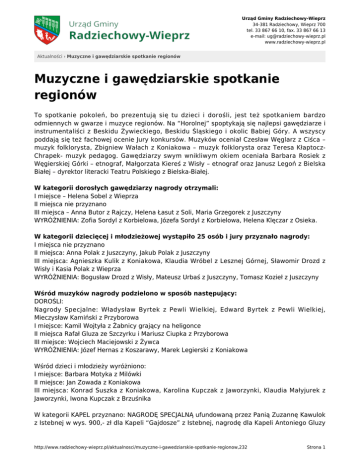 Urząd Gminy Radziechowy-Wieprz 34-381 Radziechowy, Wieprz 700 tel. 33 867 66 10, fax. 33 867 66 13 e-mail: [email protected] www.radziechowy-wieprz.pl Aktualności › Muzyczne i gawędziarskie spotkanie regionów Muzyczne i gawędziarskie spotkanie regionów To spotkanie pokoleń, bo prezentują się tu dzieci i dorośli, jest też spotkaniem bardzo odmiennych w gwarze i muzyce regionów. Na “Horolnej” spoptykają się najlepsi gawędziarze i instrumentaliści z Beskidu Żywieckiego, Beskidu Śląskiego i okolic Babiej Góry. A wszyscy poddają się też fachowej ocenie Jury konkursów. Muzyków oceniał Czesław Węglarz z Ciśca – muzyk folklorysta, Zbigniew Wałach z Koniakowa – muzyk folklorysta oraz Teresa KłaptoczChrapek- muzyk pedagog. Gawędziarzy swym wnikliwym okiem oceniała Barbara Rosiek z Węgierskiej Górki – etnograf, Małgorzata Kiereś z Wisły – etnograf oraz Janusz Legoń z Bielska Białej – dyrektor literacki Teatru Polskiego z Bielska-Białej. W kategorii dorosłych gawędziarzy nagrody otrzymali: I miejsce – Helena Sobel z Wieprza II miejsca nie przyznano III miejsca – Anna Butor z Rajczy, Helena Łasut z Soli, Maria Grzegorek z Juszczyny WYRÓŻNIENIA: Zofia Sordyl z Korbielowa, Józefa Sordyl z Korbielowa, Helena Klęczar z Osieka. W kategorii dziecięcej i młodzieżowej wystąpiło 25 osób i jury przyznało nagrody: I miejsca nie przyznano II miejsca: Anna Polak z Juszczyny, Jakub Polak z Juszczyny III miejsca: Agnieszka Kulik z Koniakowa, Klaudia Wróbel z Lesznej Górnej, Sławomir Drozd z Wisły i Kasia Polak z Wieprza WYRÓŻNIENIA: Bogusław Drozd z Wisły, Mateusz Urbaś z Juszczyny, Tomasz Kozieł z Juszczyny Wśród muzyków nagrody podzielono w sposób następujący: DOROŚLI: Nagrody Specjalne: Władysław Byrtek z Pewli Wielkiej, Edward Byrtek z Pewli Wielkiej, Mieczysław Kamiński z Przyborowa I miejsce: Kamil Wojtyła z Żabnicy grający na heligonce II miejsca Rafał Gluza ze Szczyrku i Mariusz Ciupka z Przyborowa III miejsce: Wojciech Maciejowski z Żywca WYRÓŻNIENIA: Józef Hernas z Koszarawy, Marek Legierski z Koniakowa Wśród dzieci i młodzieży wyróżniono: I miejsce: Barbara Motyka z Milówki II miejsce: Jan Zowada z Koniakowa III miejsca: Konrad Suszka z Koniakowa, Karolina Kupczak z Jaworzynki, Klaudia Małyjurek z Jaworzynki, Iwona Kupczak z Brzuśnika W kategorii KAPEL przyznano: NAGRODĘ SPECJALNĄ ufundowaną przez Panią Zuzannę Kawulok z Istebnej w wys. 900,- zł dla Kapeli “Gajdosze” z Istebnej, nagrodę dla Kapeli Antoniego Gluzy http://www.radziechowy-wieprz.pl/aktualnosci/muzyczne-i-gawedziarskie-spotkanie-regionow,232 Strona 1 Urząd Gminy Radziechowy-Wieprz 34-381 Radziechowy, Wieprz 700 tel. 33 867 66 10, fax. 33 867 66 13 e-mail: [email protected] www.radziechowy-wieprz.pl Aktualności › Muzyczne i gawędziarskie spotkanie regionów ze Szczyrku oraz nagrodę ufundowaną przez Panią Zuzannę Kawulok na ręce instruktora Moniki Wałach dla dzieci z Kapeli “Mała Jetelinka” z Jaworzynki. Nagrody w obu kategoriach przeglądu ufundowali: Samorząd Województwa Śląskiego, Regionalny Ośrodek Kultury w Bielsku Białej, Starostwo Powiatowe w Żywcu (nagrody rzeczowe dla wszystkich uczestników w kat. Dziecięcej i młodzieżowej) oraz Gminne Centrum Kultury, Promocji, Turystyki Radziechowy-Wieprz Nad całością przedsięwzięcia czuwało Stowarzyszenie Społeczno-Kulturalne “GROJCOWIANIE” z Wieprza które zaprasza wszystkich uczestników, laureatów przeglądu i wszystkich zainteresowanych na KONCERT LAUREATÓW który odbędzie się 18 listopada 2007 r w Wiejskim Domu Ludowym w Wieprzu k/ Żywca. Spotkanie z Jury o 14.oo a prezentacja najlepszych wykonawców o 16.00. http://www.radziechowy-wieprz.pl/aktualnosci/muzyczne-i-gawedziarskie-spotkanie-regionow,232 Strona 2