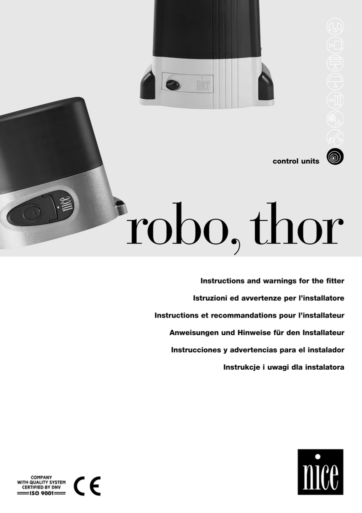 control units robo,thor Instructions and warnings for the fitter Istruzioni ed avvertenze per l’installatore Instructions et recommandations pour l’installateur Anweisungen und Hinweise für den Installateur Instrucciones y advertencias para el instalador Instrukcje i uwagi dla instalatora robo GB I F thor D E E PL PL ¸ centrale sterujace / silowniki robo, thor Spis: str. 1 Opis produktu 75 2 2.1 2.2 2.2.1 2.2.2 2.2.3 2.2.4 Instalowanie Zastosowanie typowe Połączenia elektryczne Schemat elektryczne Opis połączeń Fototest Kontrola połączeń 75 75 76 76 76 77 78 3 Regulacje 78 4 Próby ostateczne 79 5 Sposoby funkcjonowania 80 Ostrzeżenie: ! Niniejsza instrukcja przeznaczona jest jedynie dla personelu technicznego z odpowiednimi kwalifikacjami do instalowania. Żadne informacje znajdujące się w niniejszej instrukcji nie są skierowana do końcowego użytkownika! Instrukcja ta odnosi się tylko do tej centrali i nie może być zastosowana do innych produktów. Przed przystąpieniem do instalowania zalecamy przeczytać całą instrukcję! 74 str. 6 6.1 Funkcje z możliwością programowania Opis funkcji 80 81 7 Jak postąpić gdy .... 82 8 Akcesoria dodatkowe 83 9 Czynności konserwacyjne 83 10 Utylizacja i recykling 83 11 Co robić gdy... 83 12 Dane techniczne 83 1) Opis produktu: Centrala do automatyzacji bram i drzwi automatycznych służy sterowania siłowników z silnikami jednofazowego prądu przemiennego. Centrala posiada wiele funkcji, które można wybrać poprzez mikroprzełączniki a wymagane regulacje można wykonać za pomocą potencjometrów. A B C D E F N O G P R Q H S OK I U V L T W X M Z 1 Diody, obok odpowiednich wejść, sygnalizują ich stan, dioda obok mikroprocesora wskazuje na prawidłową jego pracę. Aby ułatwić rozpoznanie poszczególnych elementów rys.1 przedstawia podstawowe części centrali. A B C D E F G H I L M N O P Q R S T U V W X Z Listwa zaciskowa do anteny Przełączniki wyboru funkcji Przycisk Krok po Kroku Potencjometr regulacji Czasu Pracy TL Potencjometr regulacji Czasu Przerwy TP Listwa zaciskowa Wejść / Wyjść sygnałów Złącze wejścia wyłączników krańcowych Listwa zaciskowa wyjścia lampy sygnalizacyjnej/światełka ostrzegawczego Złącze kondensatora Złącze wyjścia zasilania silnika Listwa zaciskowa zasilania Selektor trybu działania światełka ostrzegawczego Złącze radia Mikroprocesor Bezpiecznik topikowy niskiego napięcia (315mA T) Trymer regulacji siły (F) Dioda OK Transformator Triak “Otwiera” Triak “Zamyka” Przekaźnik “Wspólny” Przekaźnik światełka ostrzegawczego Bezpiecznik topikowy zasilania (5A T) ! Przy ewentualnej wymianie bezpiecznika topikowego należy mieć na uwadze typ i jego charakterystyki: wymiary (5x20), prąd nominalny (np. 5A), charakterystyki działania (T = z opóźnieniem, F = szybka), napięcie maksymalne i moc przepalenia. 2) Instalowanie: ! Przypominamy, że bramy i drzwi automatyczne mogą być instalowane tylko przez personel wykwalifikowany i w pełni przestrzegający norm prawnych. Należy uważnie kierować się uwagami umieszczonymi w akapitach: “Ostrzeżenia dla instalatora”. 2.1) Zastosowanie typowe Mając na celu wyjaśnienie niektórych aspektów automatyzacji bram i drzwi przedstawiamy poniżej instalacje typową: 1) 2) 3) 4) 2 1 4 FO TO 2 3 Para fotokomórek Lampa sygnalizacyjna Wyłącznik kluczowy Listwa pneumatyczna W szczególności przypominamy, że: • Wszystkie fotokomórki wyprodukowane przez NICE posiadają system SYNCHRONIZACJI, który służy do eliminacji problemu związanego z interferencją pomiędzy dwoma parami fotokomórek (szczegółowe informacje zawarte są w instrukcjach fotokomórek). • Para fotokomórek “Foto” w fazie otwierania nie powoduje żadnego efektu ale powoduje zatrzymanie i odwrócenie ruchu w fazie zamykania. • Interwencja listwy pneumatycznej podłączonej do wejścia “STOP” powoduje natychmiastowe zatrzymanie i krótkie cofnięcie bramy. 75 PL 2.2) Połączenia elektryczne ! Mając na celu zagwarantowanie bezpieczeństwa operatorowi i zabezpieczenie przed uszkodzeniem elementów urządzenia, podczas wykonywania połączeń lub zakładania poszczególnych kart centrala musi być odłączona od zasilania. • Podłączyć zasilanie do centrali przewodem 3x1,5 mm2. Gdy odległość między centralą a uziemieniem przekracza 30 m należy wykonać dodatkowe uziemienie obok centrali. • Do połączeń elementów zasilanych niskim napięciem należy stosować przewody o przekroju minimalnym 0,25 mm2. • Gdy długość połączenia przekracza 30 m należy zastosować przewody ekranowane, oplot uziemienia podłączyć po stronie centrali. • Nie wykonywać połączeń przewodów w puszkach podziemnych, nawet gdy są wodoszczelne. • Dla wejść typu NC (Zwykle Zamknięty), gdy nie są używane, należy wykonać mostek z zaciskiem wspólnym „24 Vac“ z wyjątkiem wejść fotokomórek w przypadku, gdy jest włączona funkcja fototestu. Dokładniejsze informacje umieszczone są w paragrafie - Fototest. • Gdy do tego samego wejścia podłączamy więcej styków (urządzeń) pracujących w systemie Zwykle Zamknięte (NC), należy połączyć je wszystkie SZEREGOWO. • Wejścia typu Zwykle Otwarte (NA), gdy nie są używane, muszą pozostać wolne. • Gdy do tego samego wejścia podłączamy więcej styków (urządzeń) w systemie Zwykle Otwarte (NA) należy ustawić je względem siebie RÓWNOLEGLE. • Używane przełączniki muszą być typu mechanicznego i bez napięcia; nie dozwolone są połączenia typu “PNP”, “NPN”, “Open Collector” itd. 2.2.1) Schemat elektryczny ANT. P.P. 13 KROK PO KROKU FOTO 12 FOTO 11 STOP 10 FOTOTESTU 9 24 Vac 8 0 Vac FCC FCA RADIO 7 ŚWIATE WIATEŁŁKO 6 OSTRZEGAWCZE 5 LUX Max 40W 4 3 GND 2 N L 1 ZASILANIA Z SIECI 3 2.2.2) Opis połączeń Przedstawiamy krótki opis możliwych połączeń centrali. Zaciski Funkcja Opis 1-2-3 : Zasilanie = Zasilania z sieci 4-5 : La